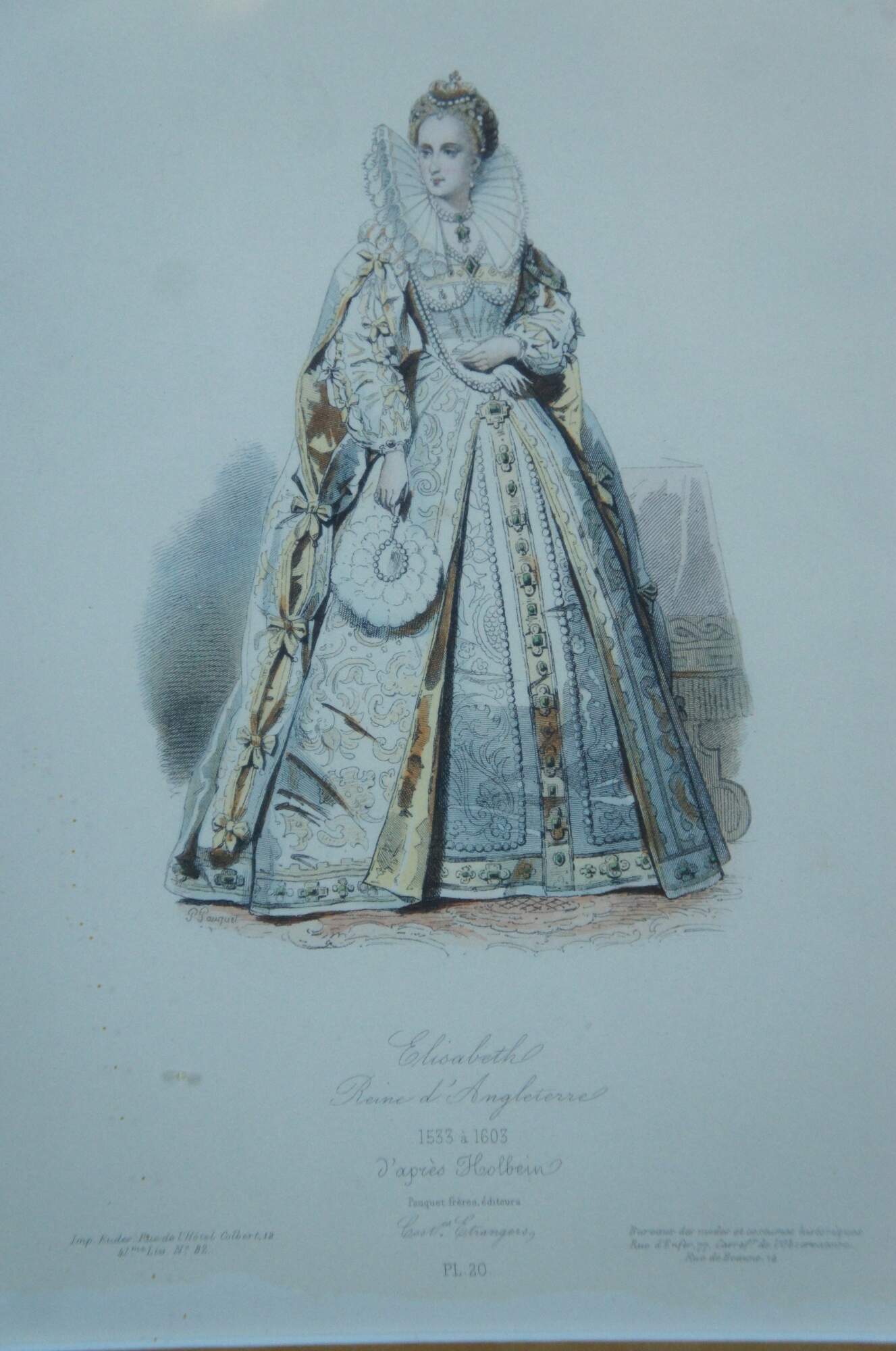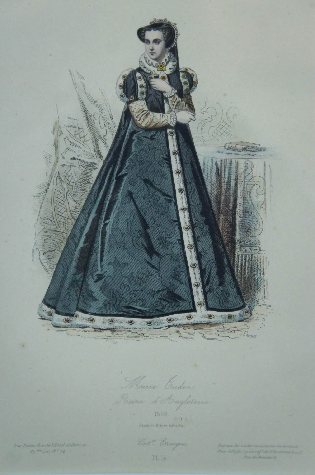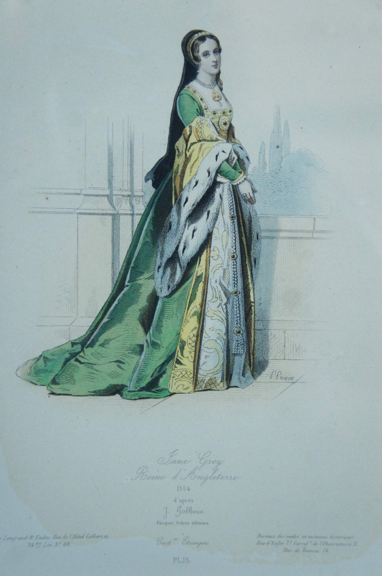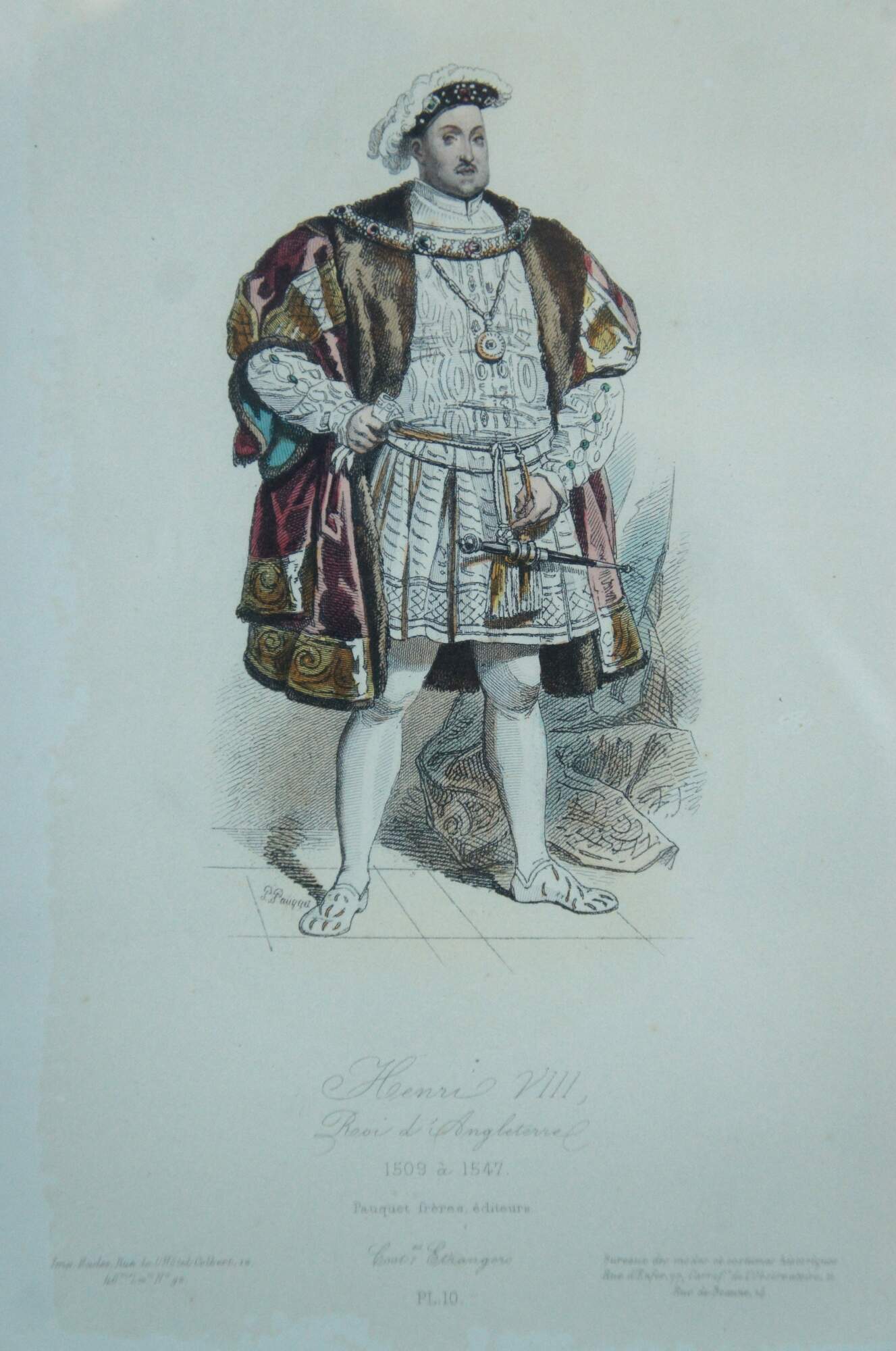 Set of 6 antique colored historical fashion prints by Hippolyte and Polydore Pauquet (Pauquet Freres / Brothers) after originals by Hans Holbein. Published by the Bureaux des Modes et Costumes Historiques (Fashion and Historical Costume Offices). Set inludes: Henry VIII, Jane Grey, Anne of Cleves, Mary Stuart, Mary Tudor, and Elizabeth I. Carved wood frames with scalloped crest, painted in gold; golden-brown mats.