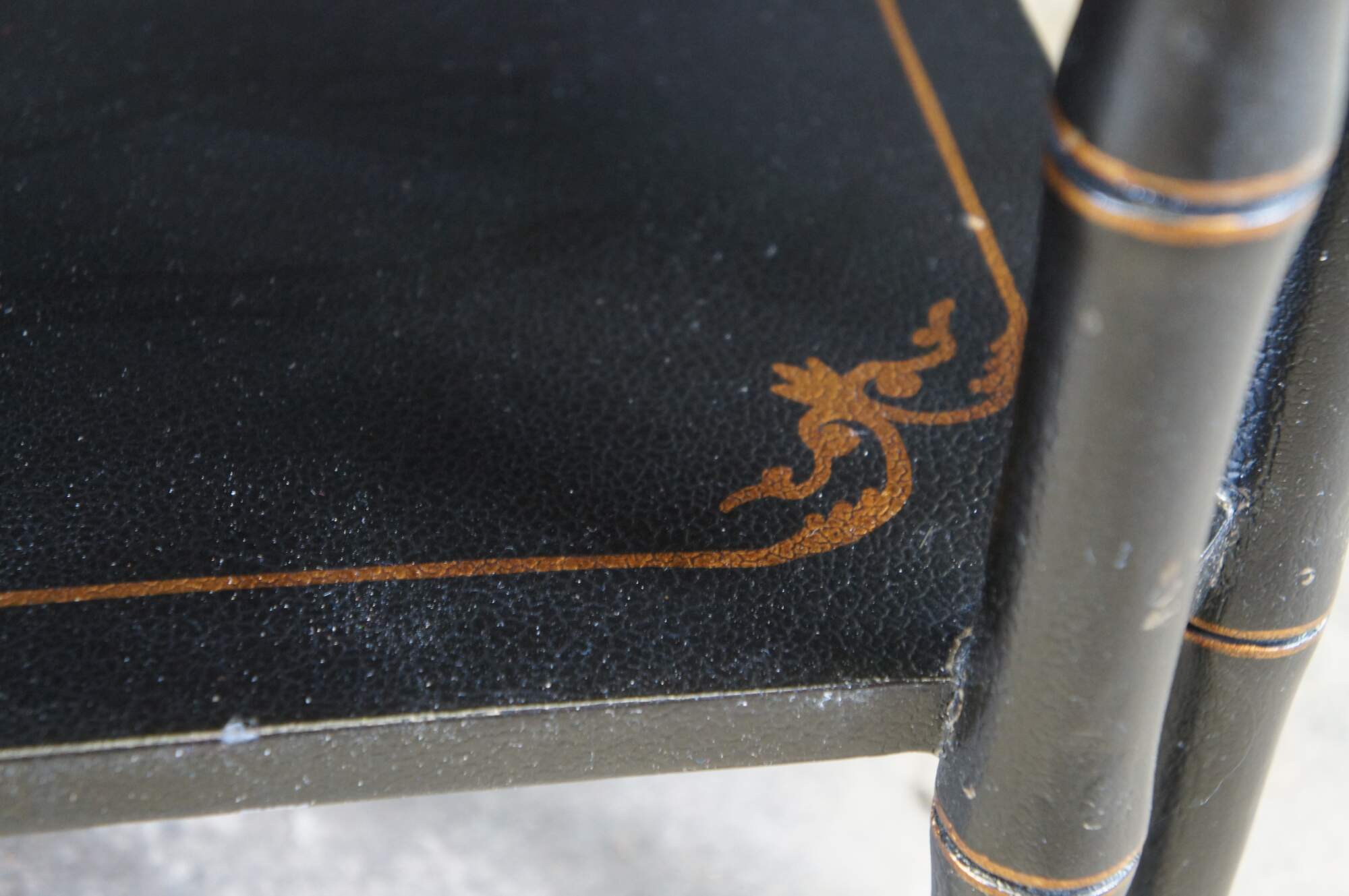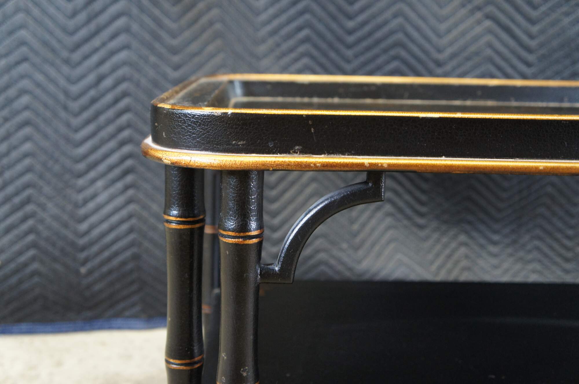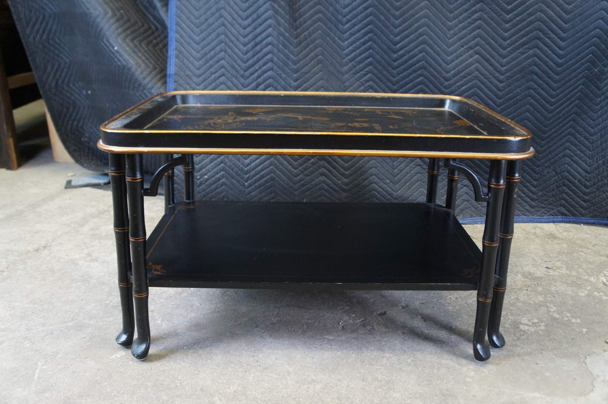 Vintage Chinoiserie black lacquer coffee or cocktail table featuring a nautical Chinese theme of Pagodas, fishing boats, Cherry Blossoms, bridges, Willow trees and figures.