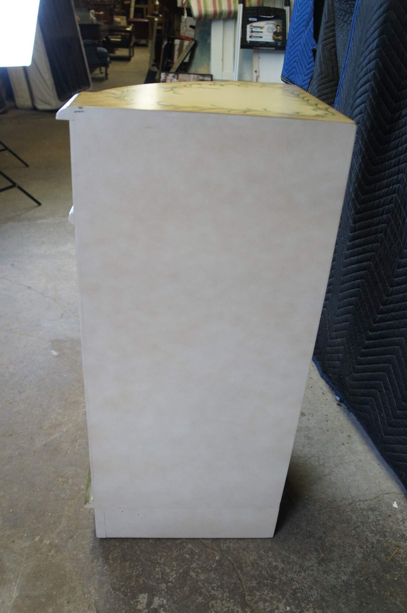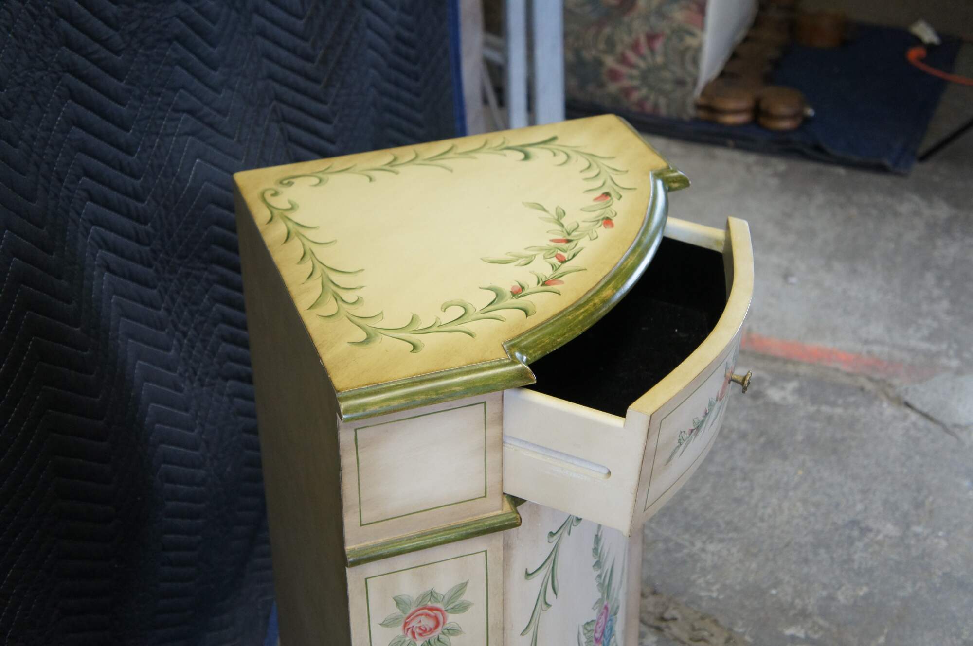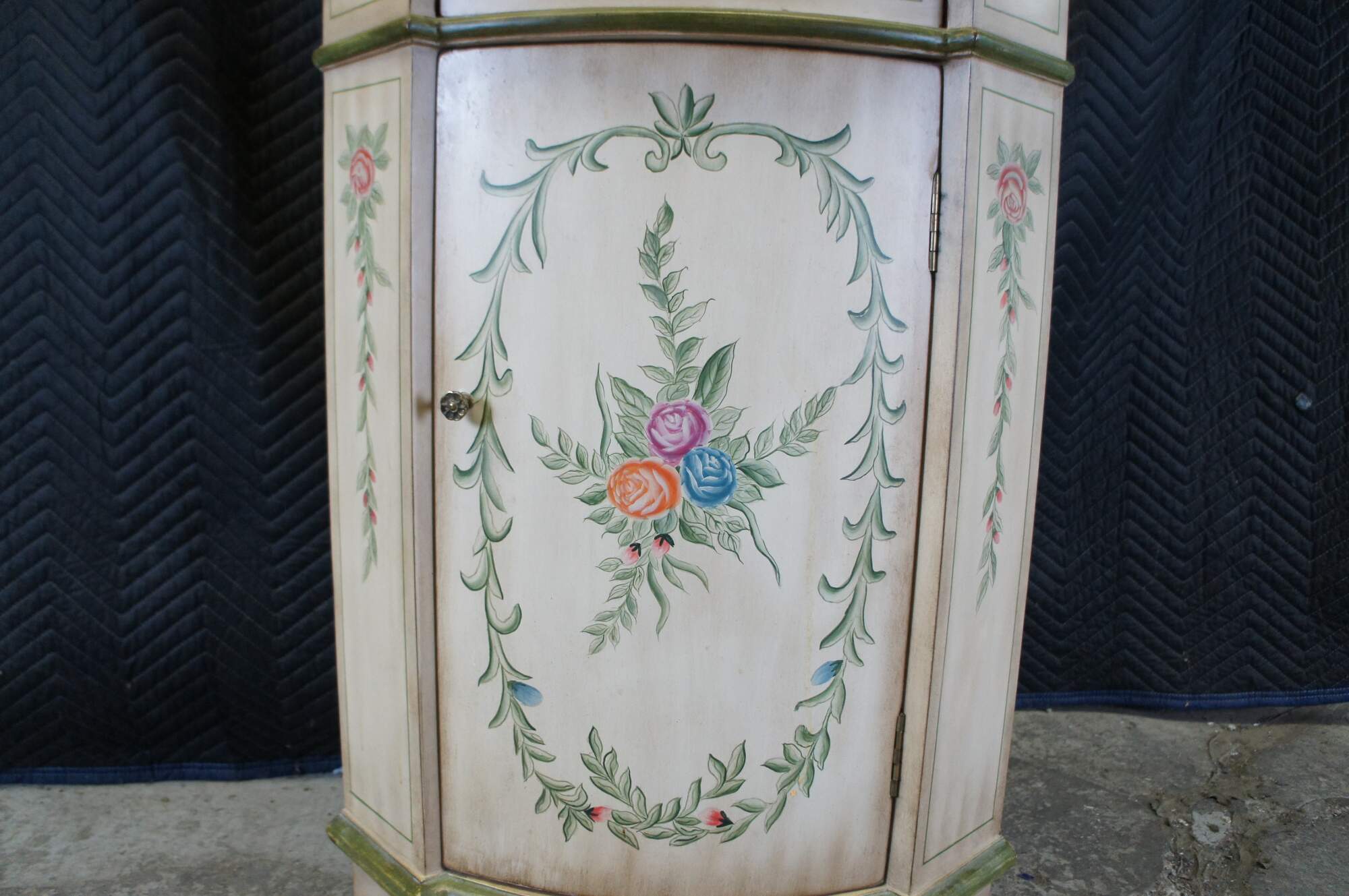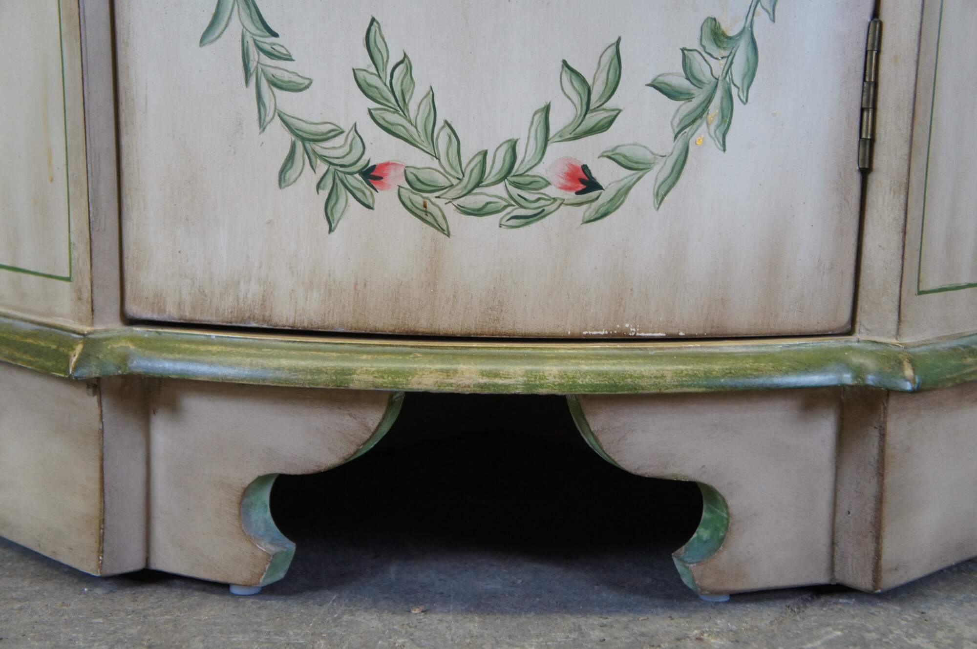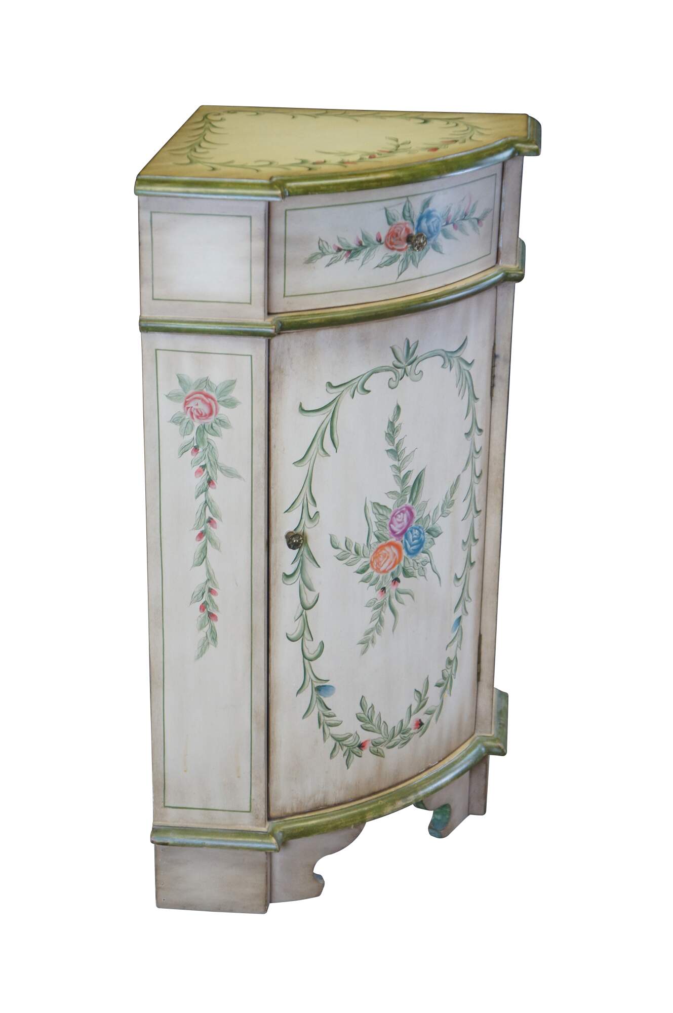 Vintage French Provincial / country corner cabinet / console / cupboard featuring a painted Neoclassical floral and acanthus theme with upper drawer and lower cabinet.