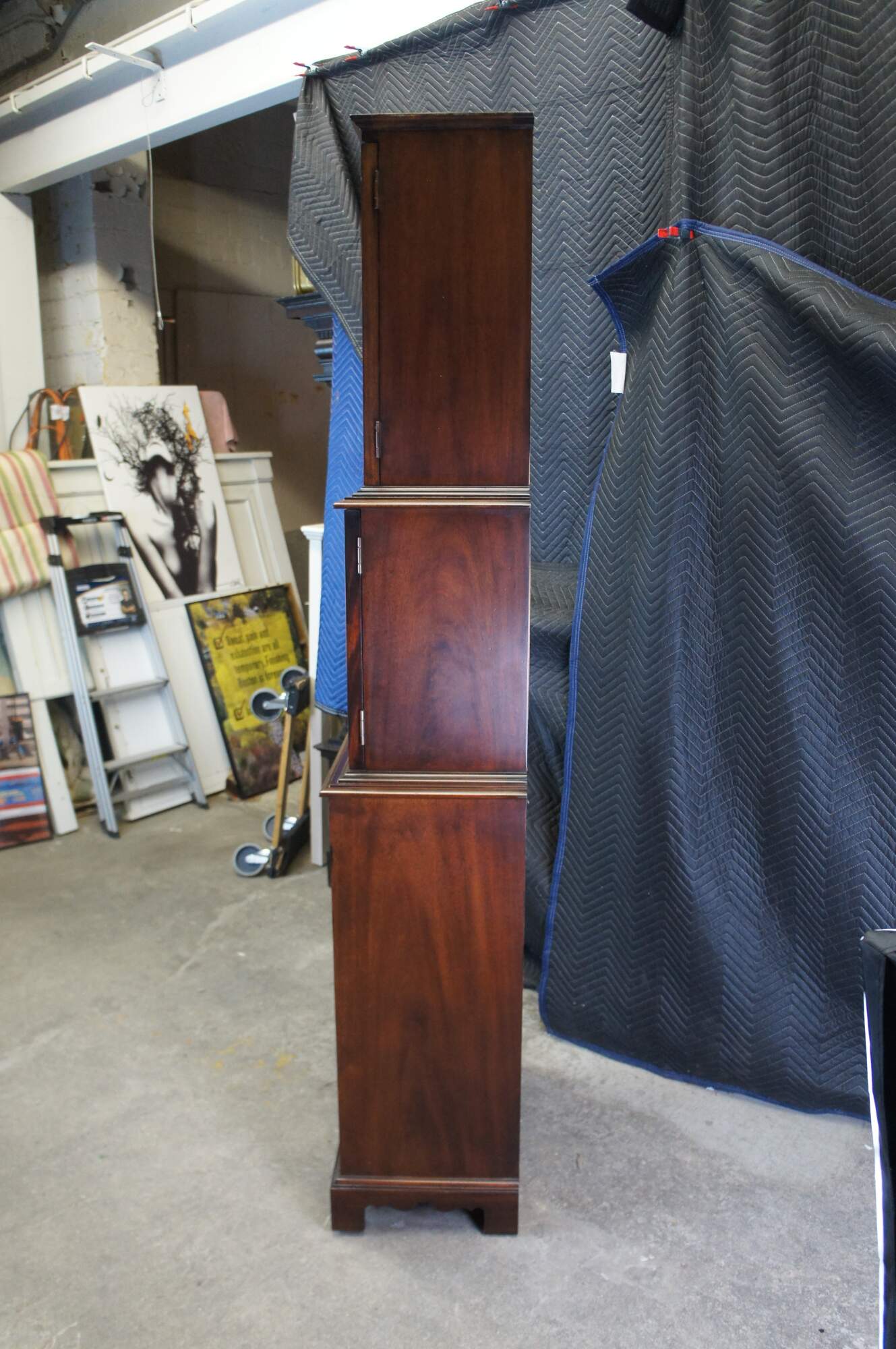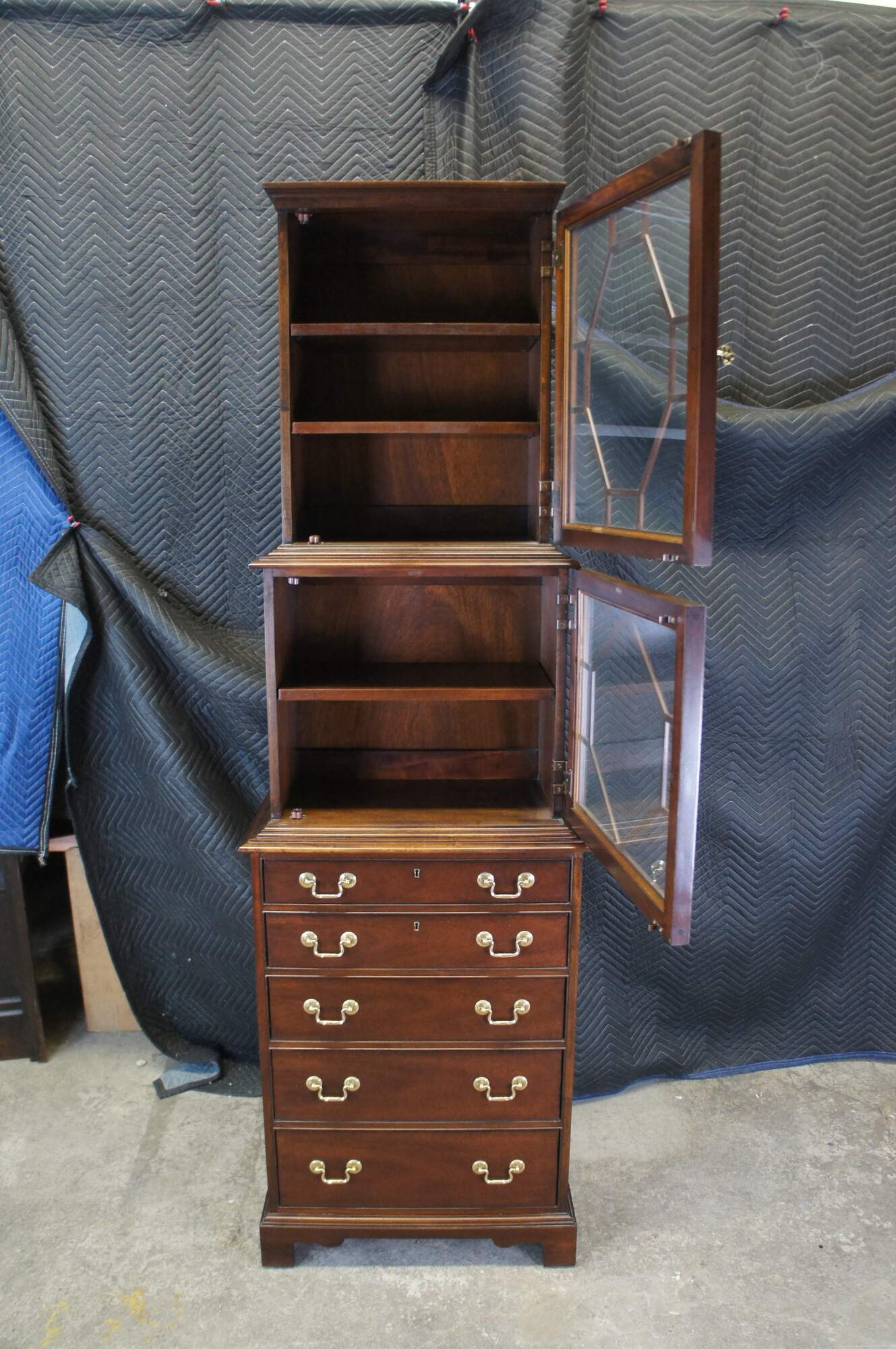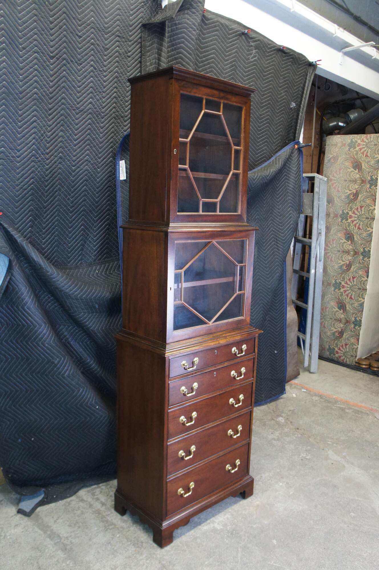 Set of two vintage Hickory Chair Co English Georgian style Park Avenue tall flatware china / curio cabinets / bookcases / chests of drawers / bureaus. Made of mahogany featuring two upper cabinets with fretwork doors and five lower storage drawers.