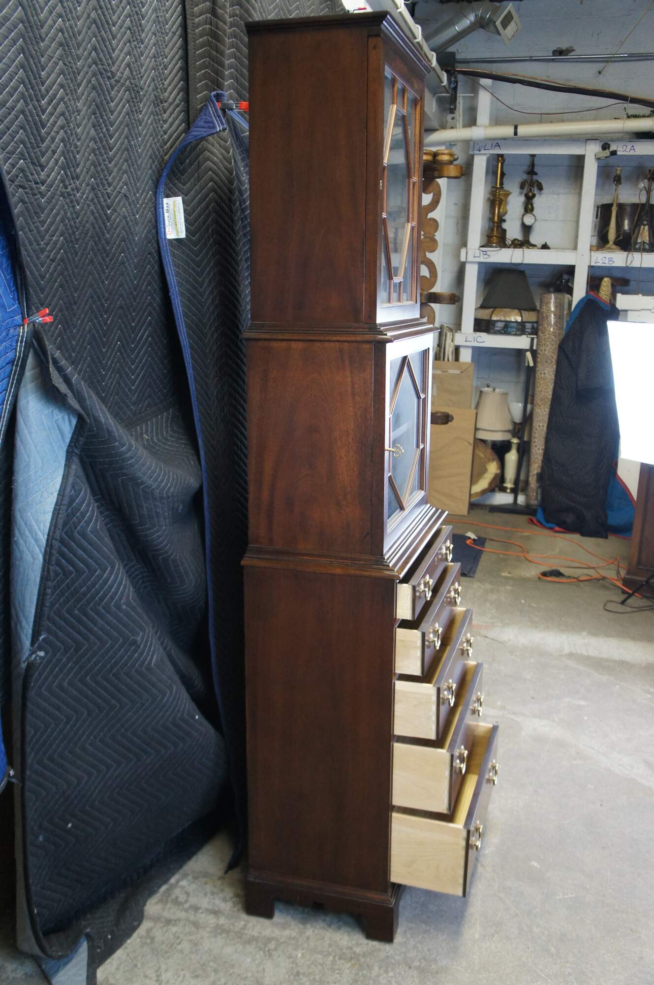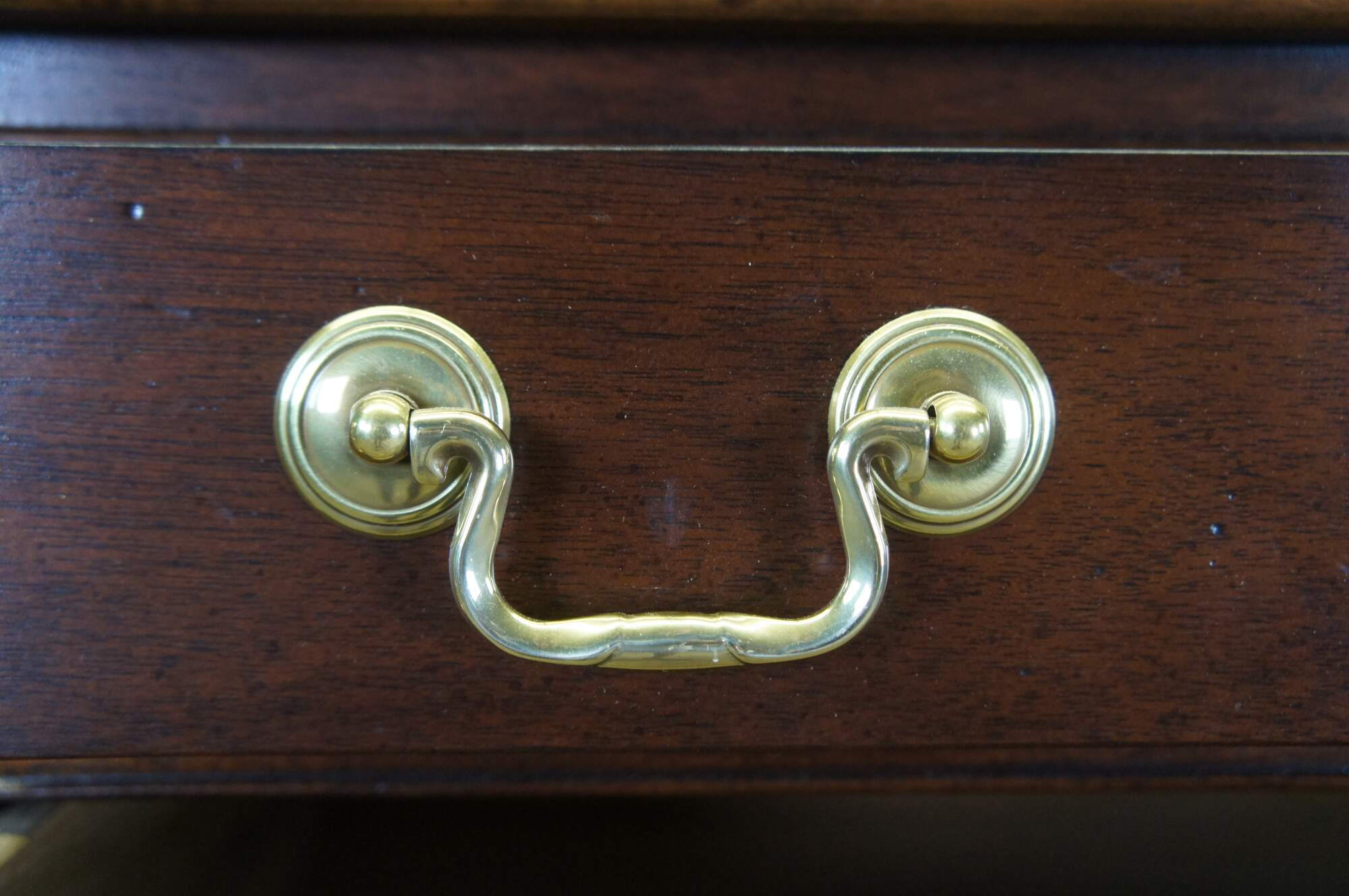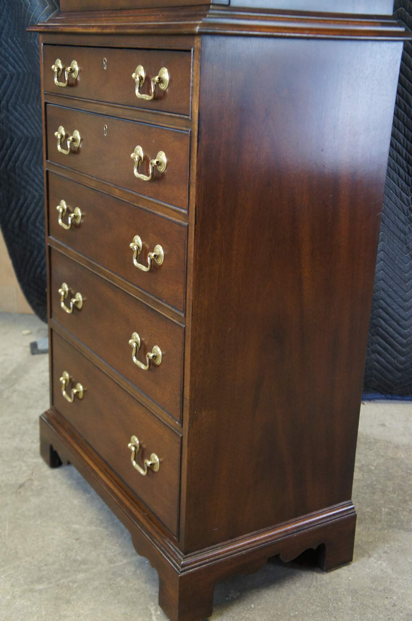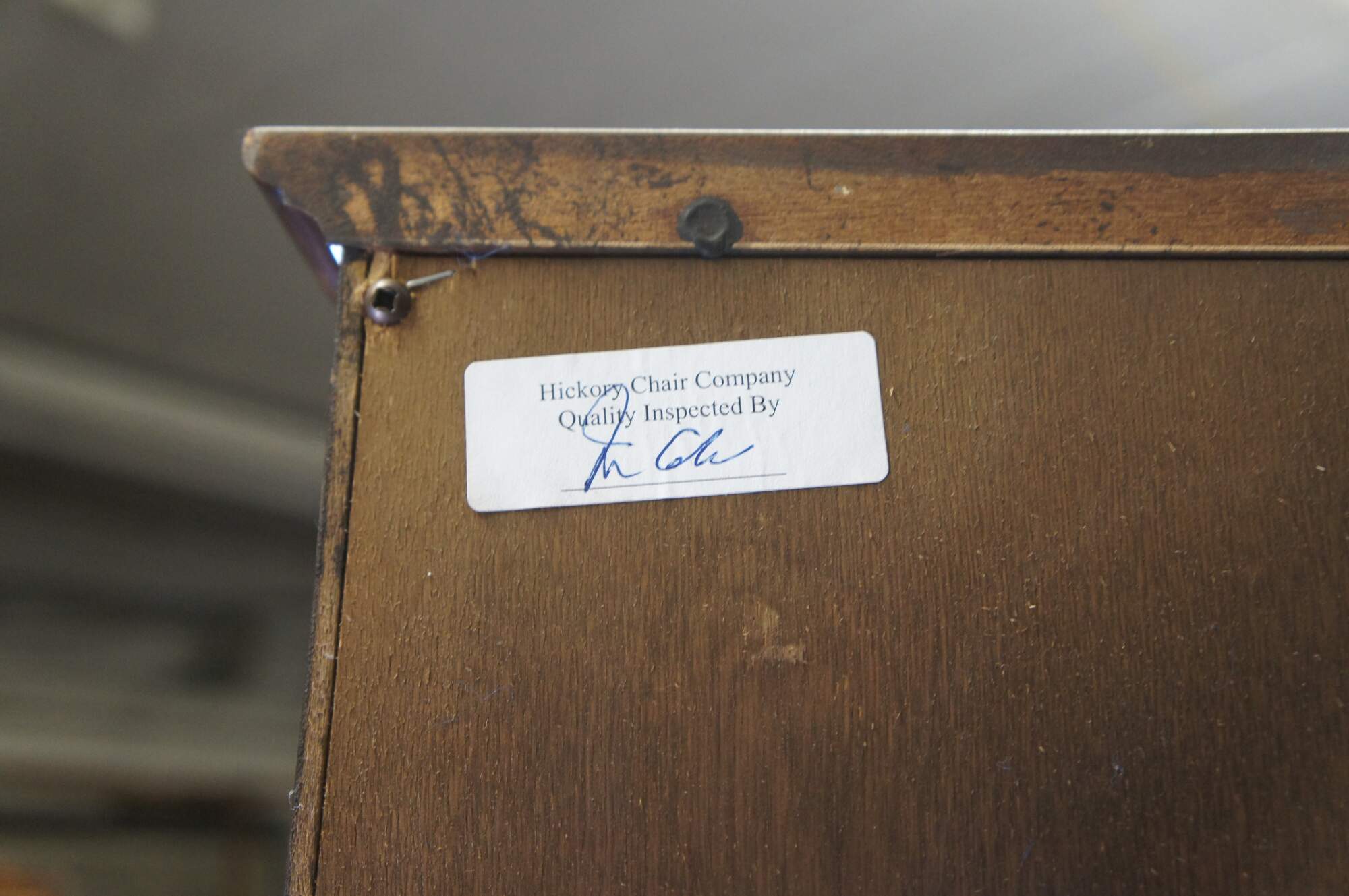 Set of two vintage Hickory Chair Co English Georgian style Park Avenue tall flatware china / curio cabinets / bookcases / chests of drawers / bureaus. Made of mahogany featuring two upper cabinets with fretwork doors and five lower storage drawers.