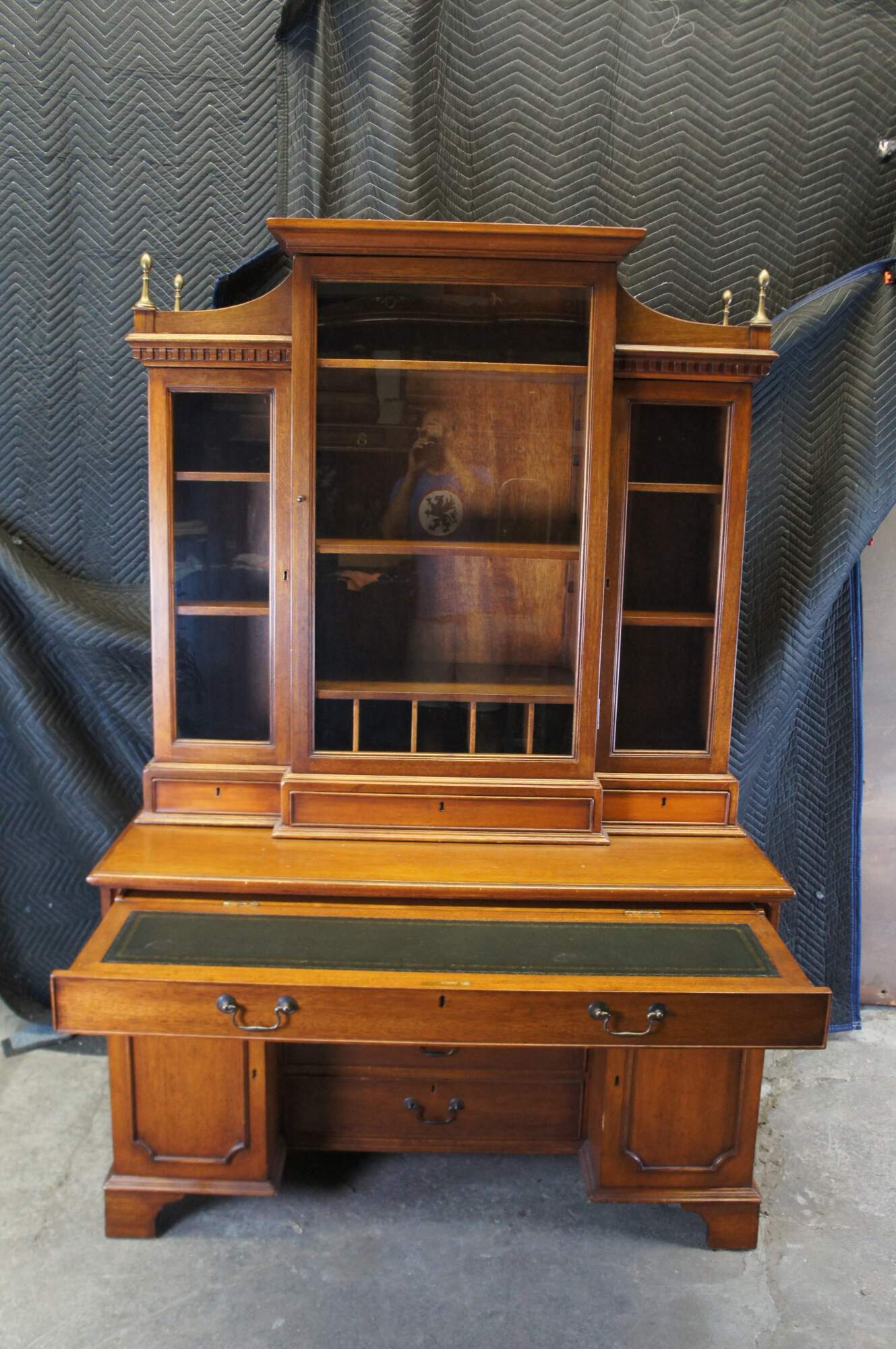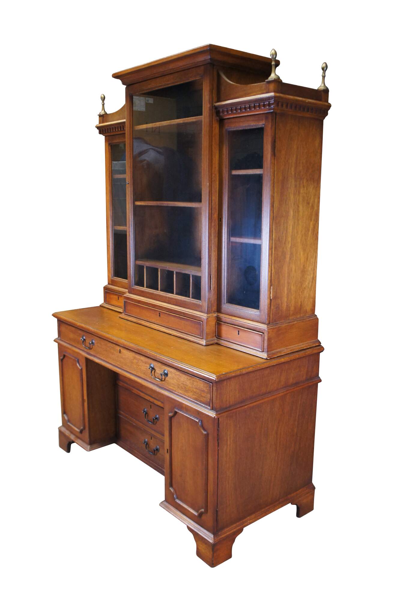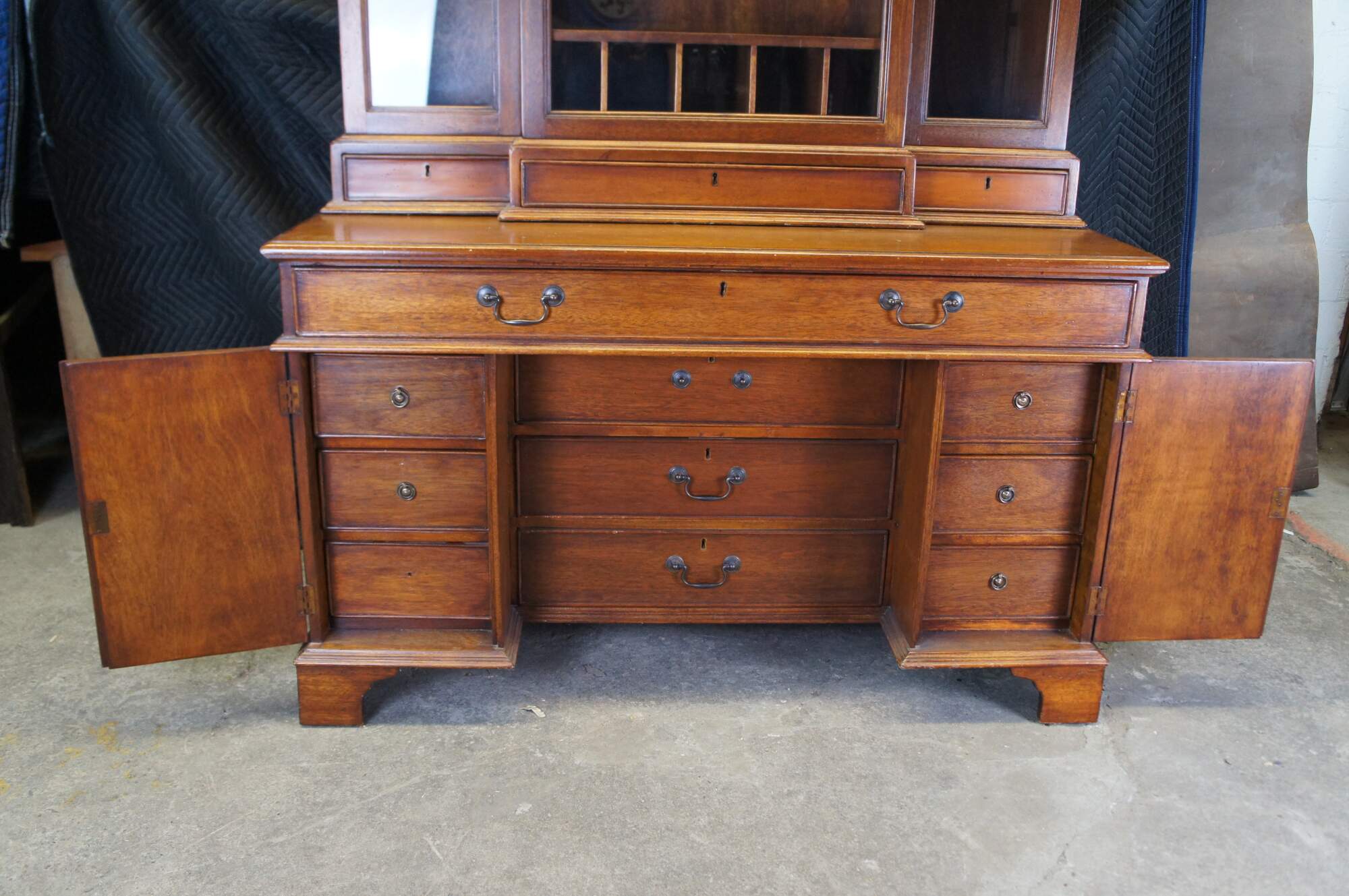 A very impressive vintage Banks Coldstone Co mahogany secretaire / secretary / bookcase / curio cabinet / hutch / desk. Made of mahogany featuring English Georgian styling with upper bookcase cabinet crowned with four brass finials, supported by a lower pull out desk / secretary with tooled leather top and notched kneehole design. Ample storage space can be found amongst the 12 drawers and multiple cubbies, including the flip top that opens to a large divided drawer.