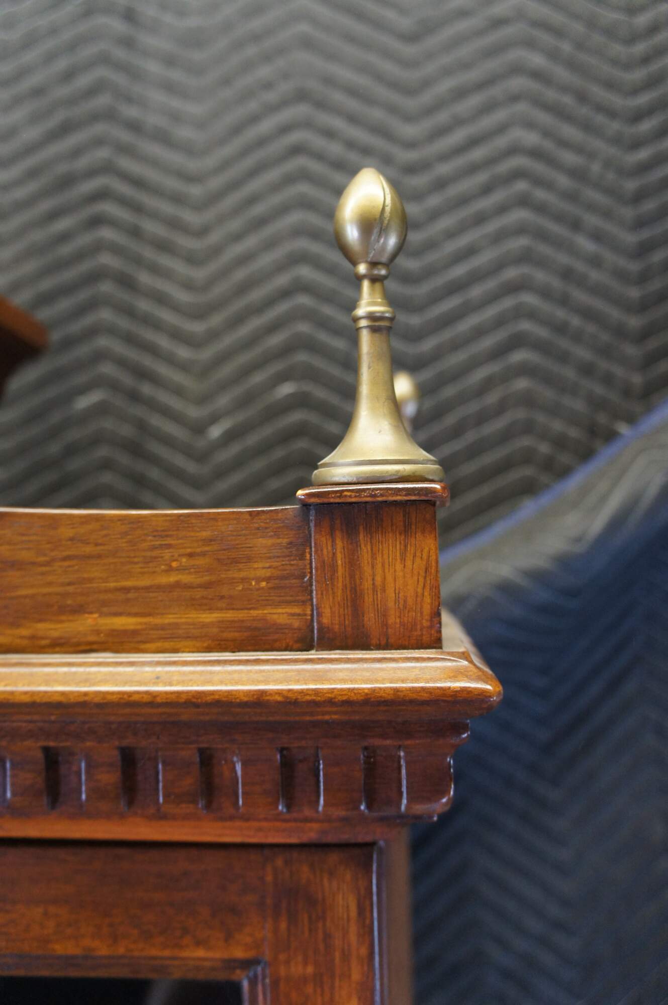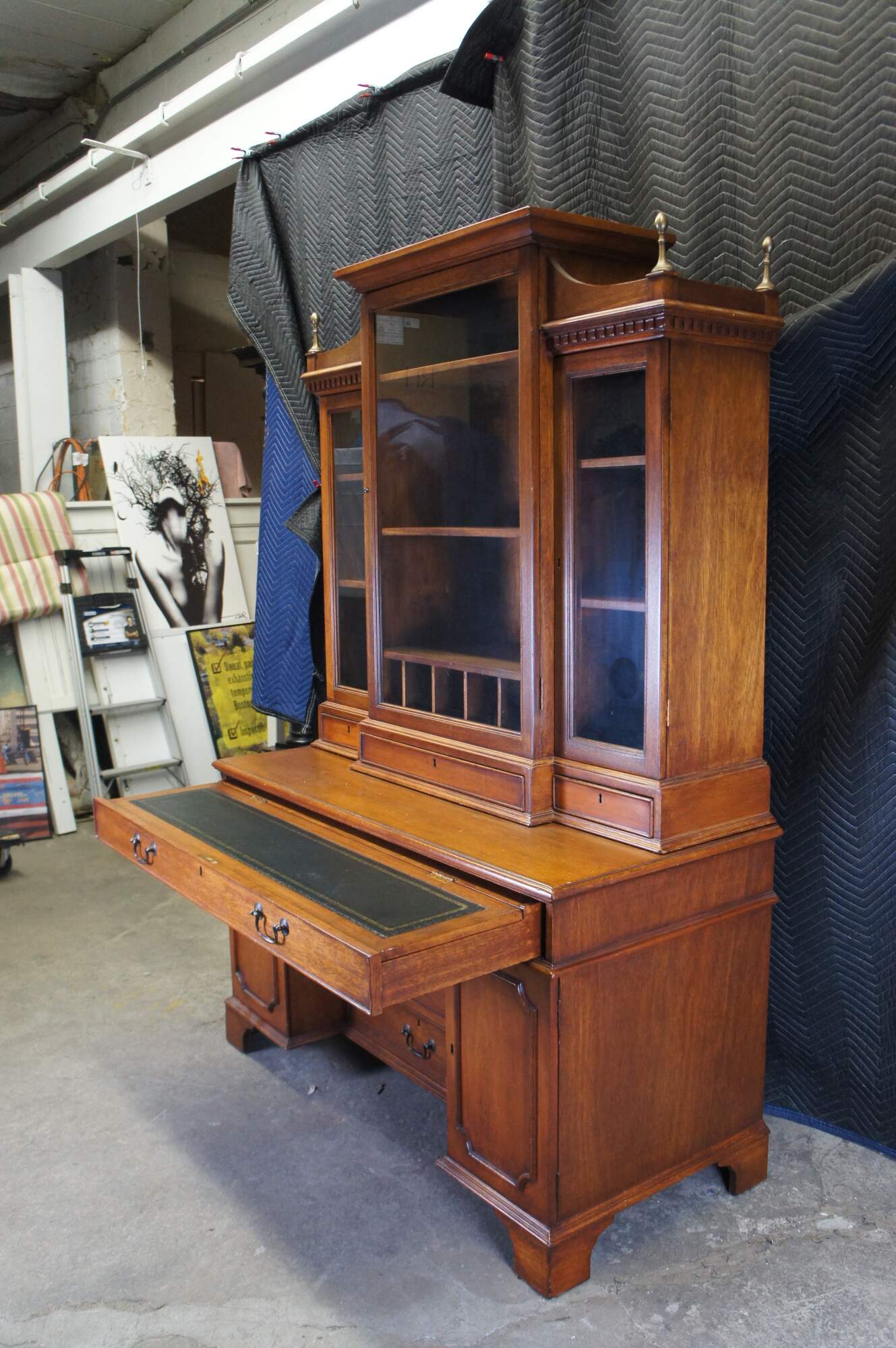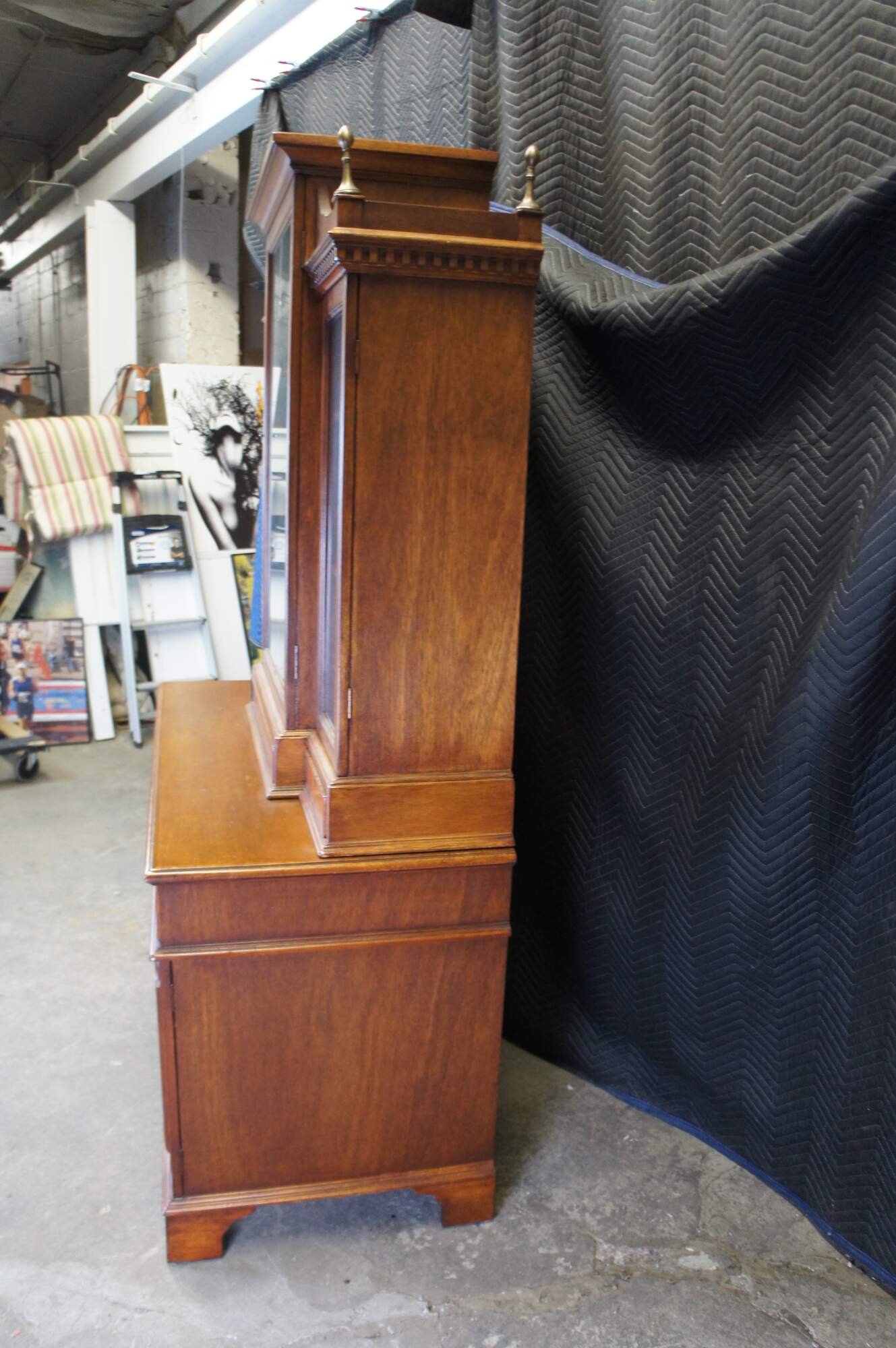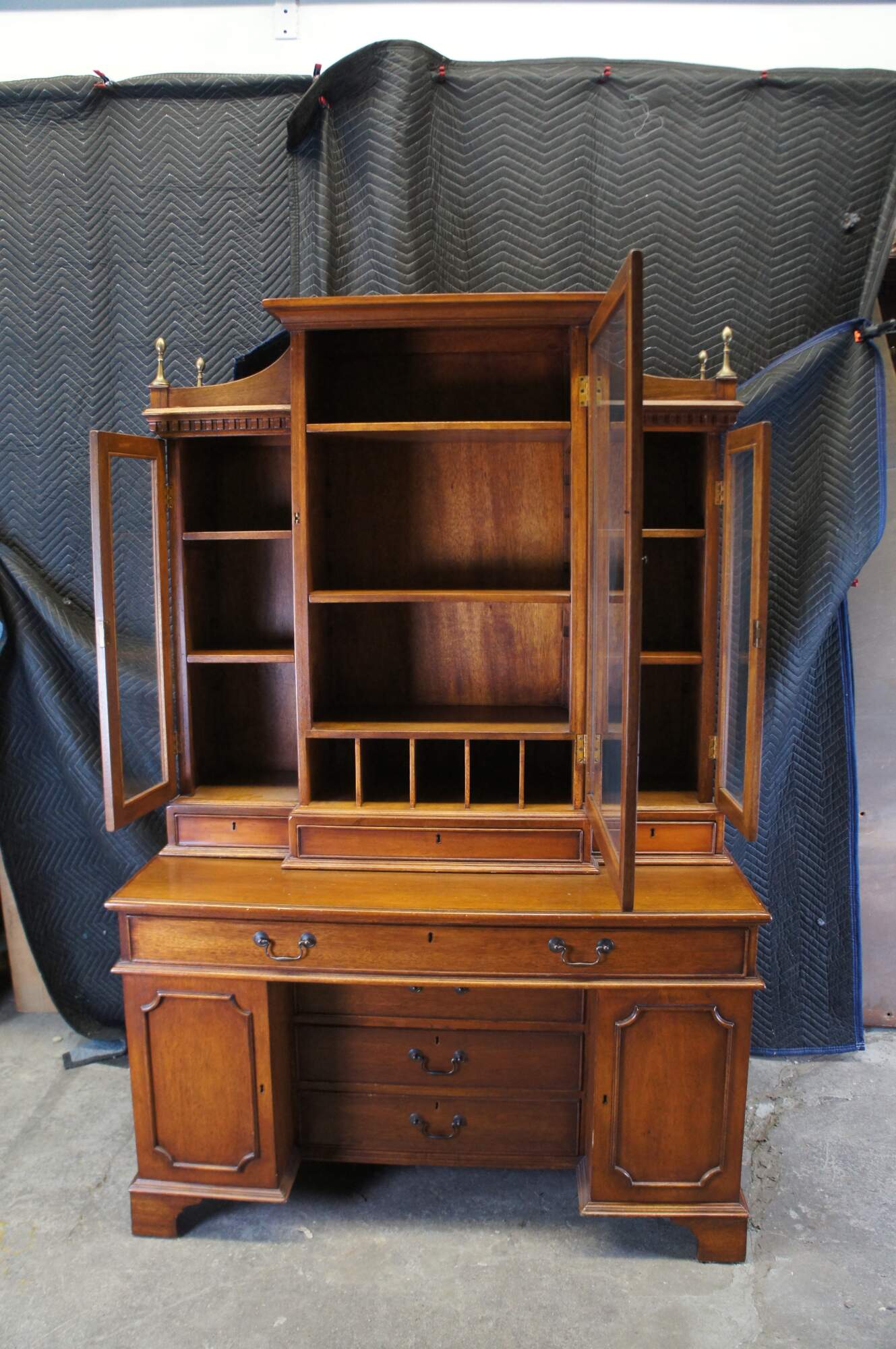 A very impressive vintage Banks Coldstone Co mahogany secretaire / secretary / bookcase / curio cabinet / hutch / desk. Made of mahogany featuring English Georgian styling with upper bookcase cabinet crowned with four brass finials, supported by a lower pull out desk / secretary with tooled leather top and notched kneehole design. Ample storage space can be found amongst the 12 drawers and multiple cubbies, including the flip top that opens to a large divided drawer.