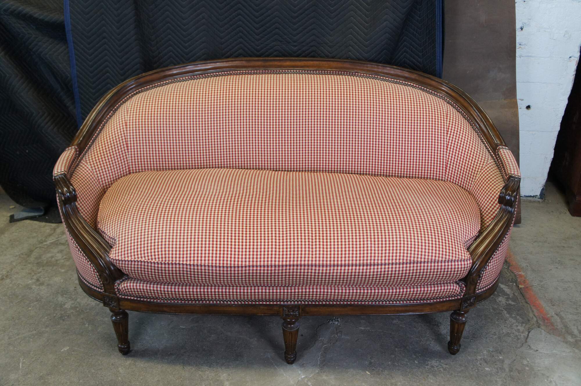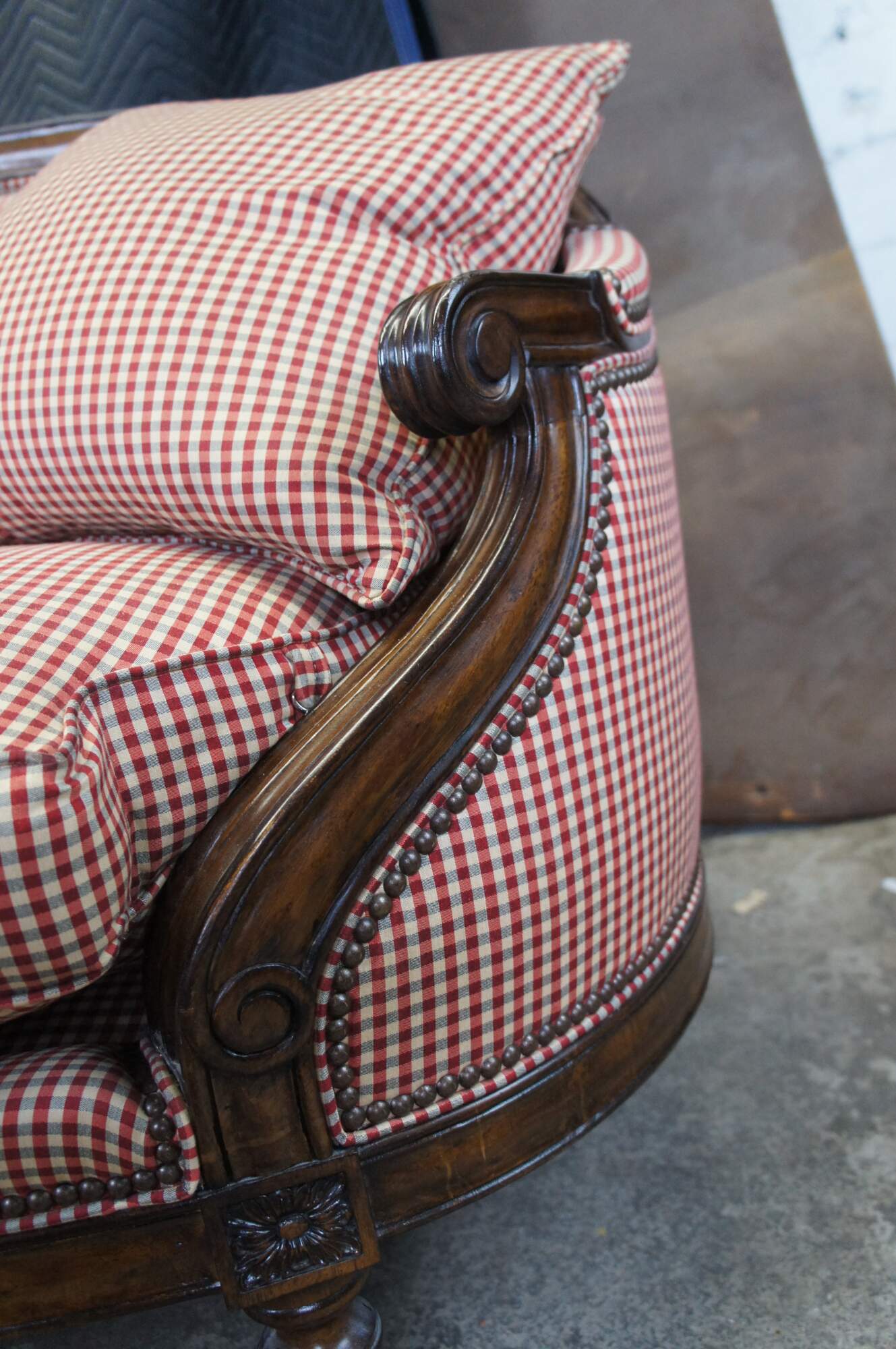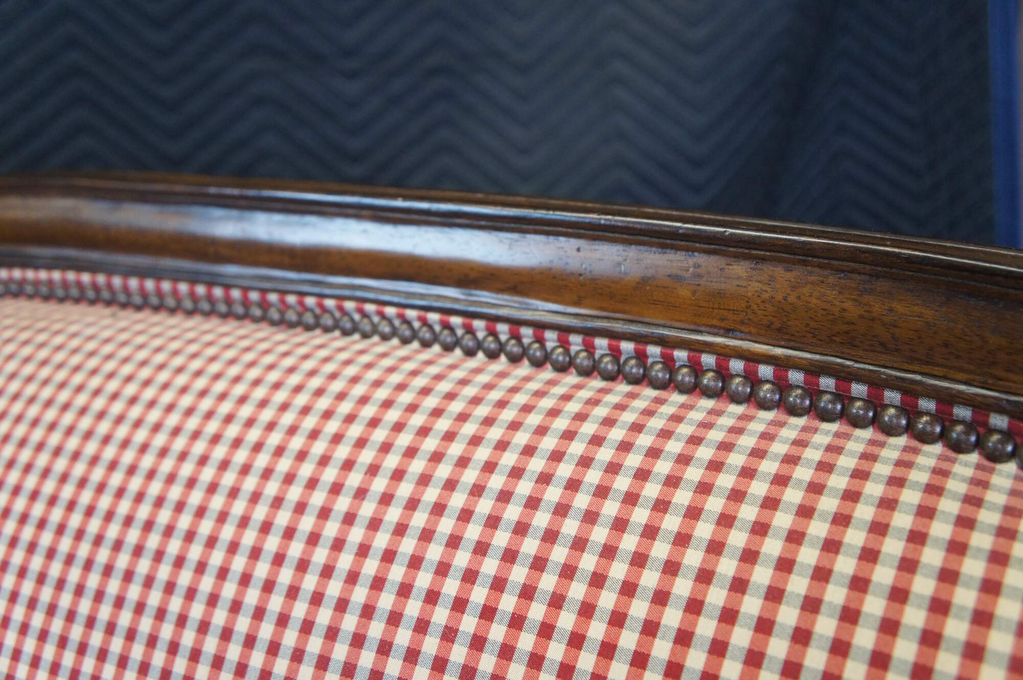 Vintage Hickory Chair company Park Avenue parlor settee / love seat / bench. Made of mahogany featuring round form with padded arm, red plaid upholstery, nailhead trim, floral carved accents and tapered fluted legs.