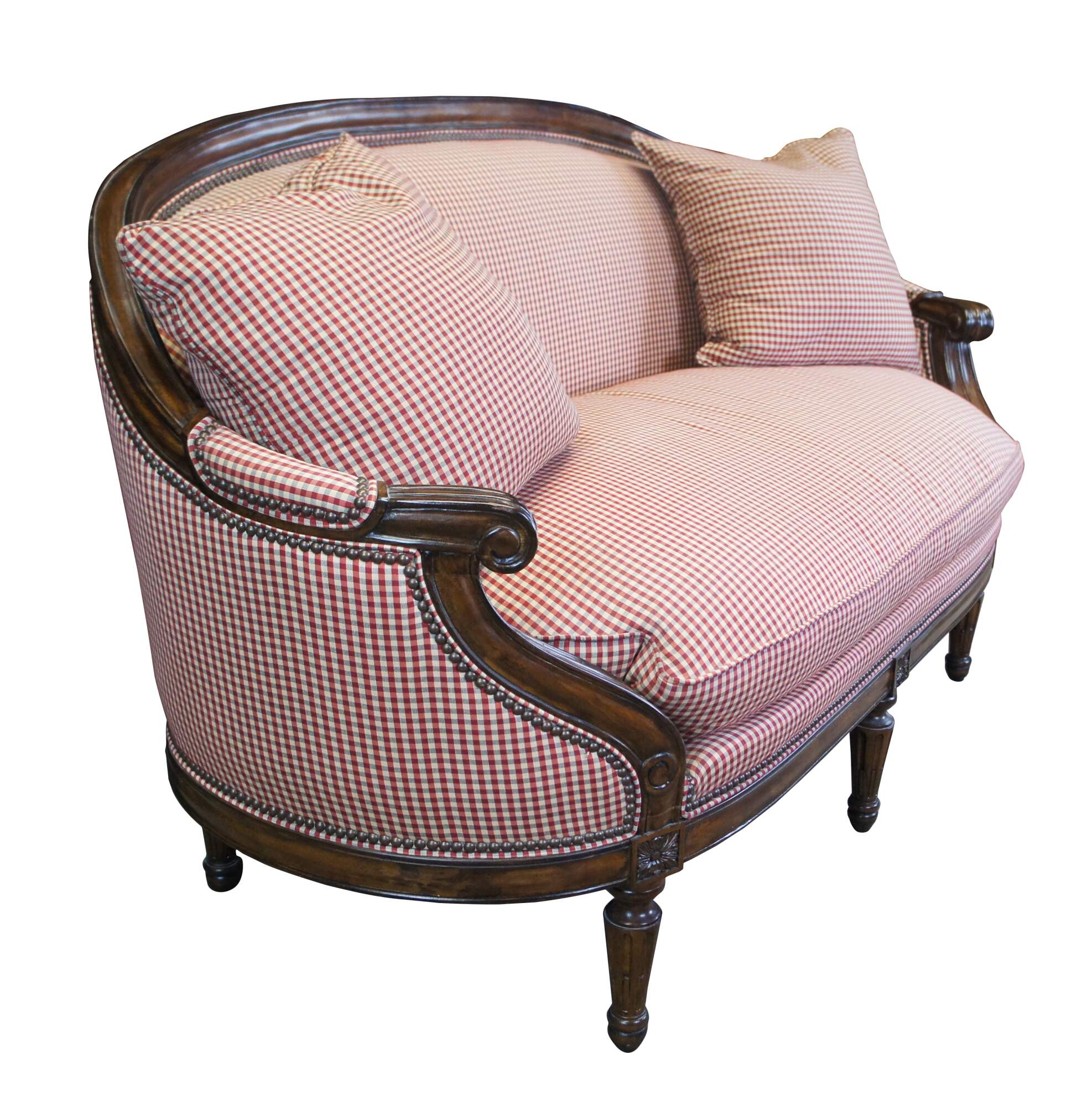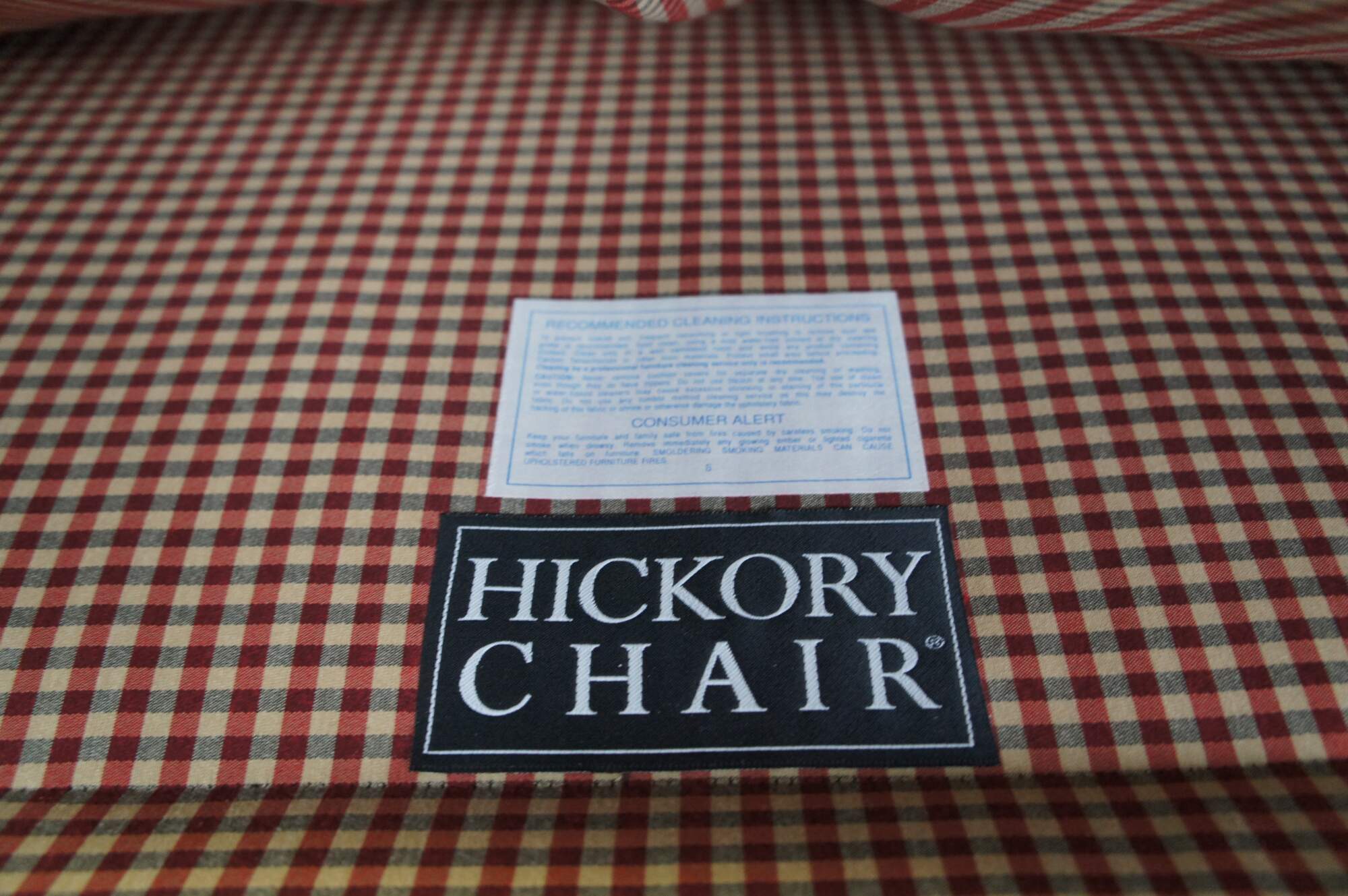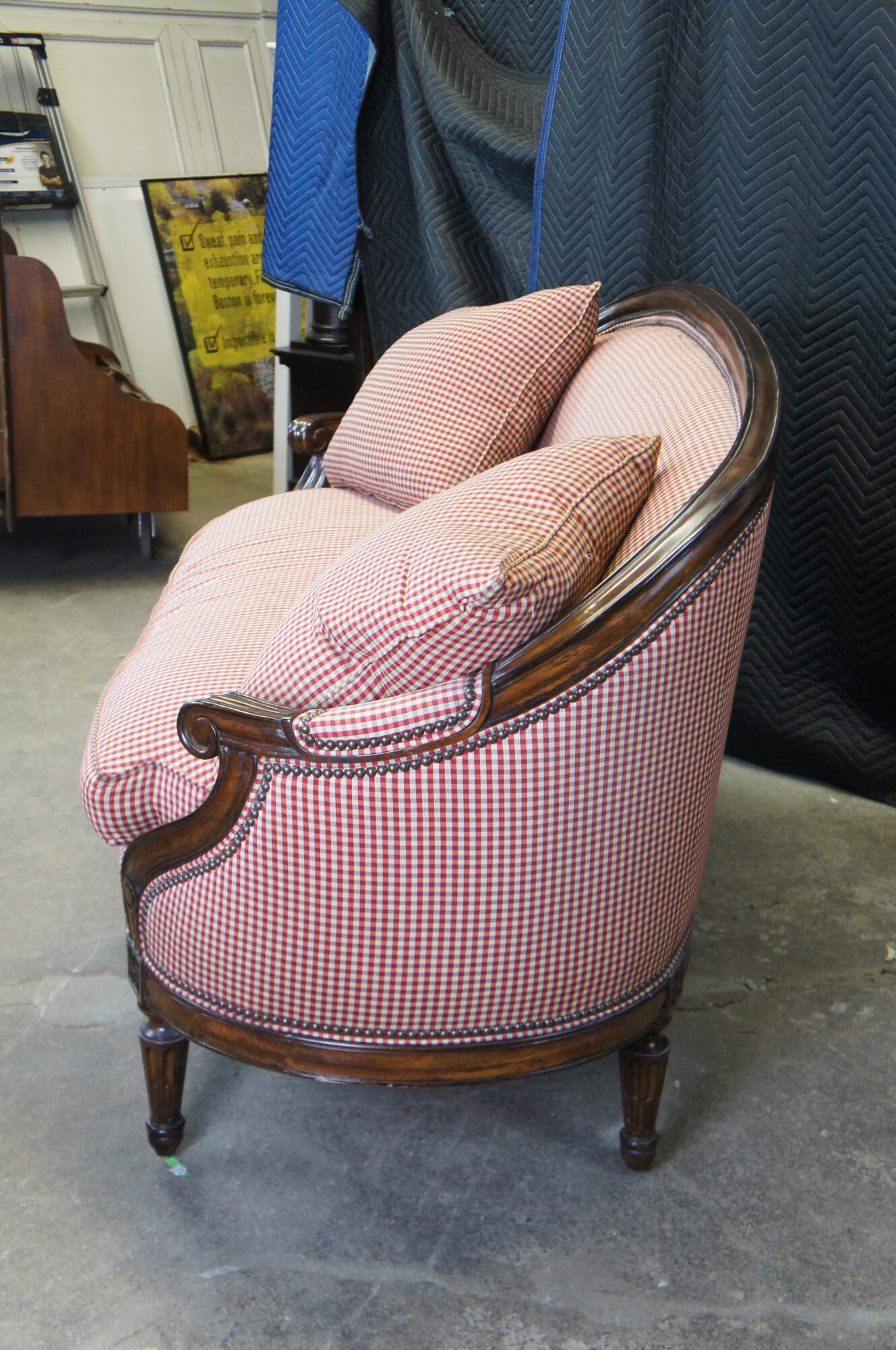 Vintage Hickory Chair company Park Avenue parlor settee / love seat / bench. Made of mahogany featuring round form with padded arm, red plaid upholstery, nailhead trim, floral carved accents and tapered fluted legs.