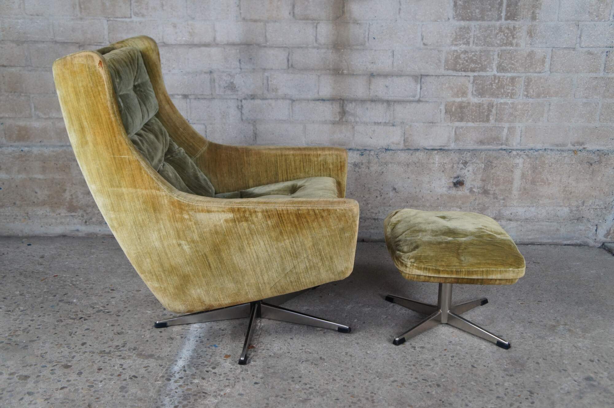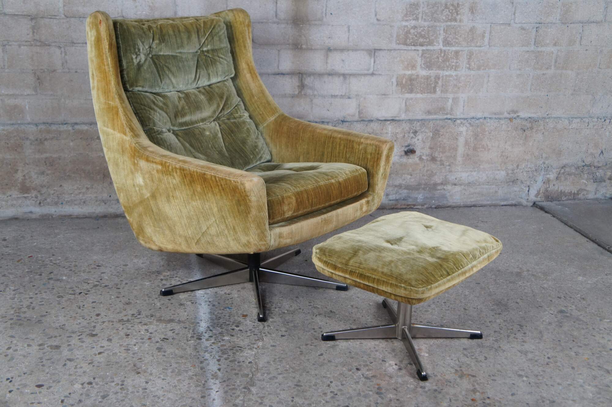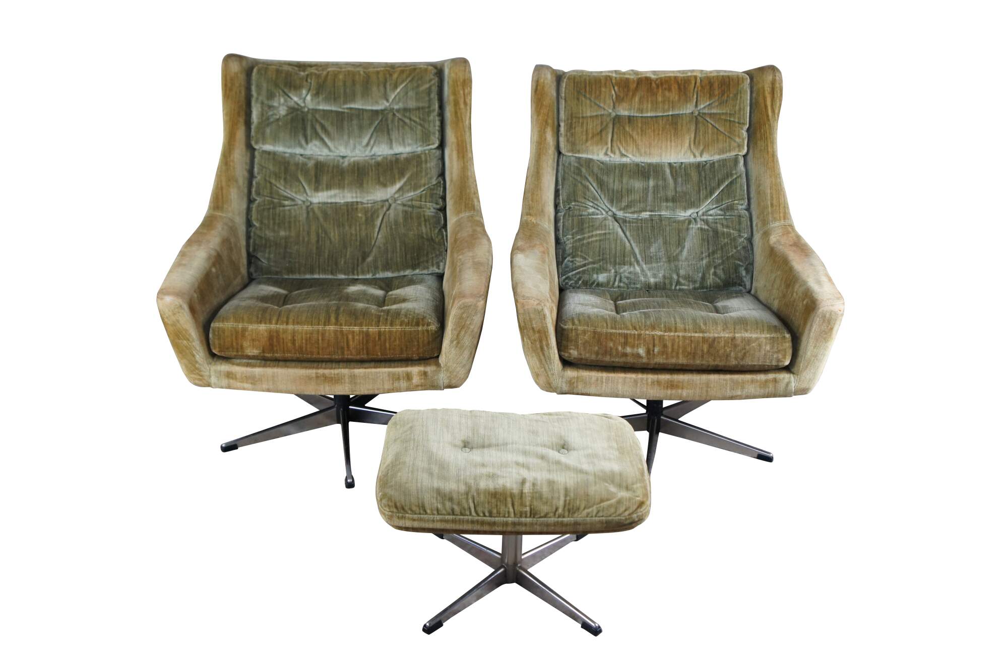Very comfortable mid century modern John Stuart Eames style swivel wingback arm chairs and ottoman.