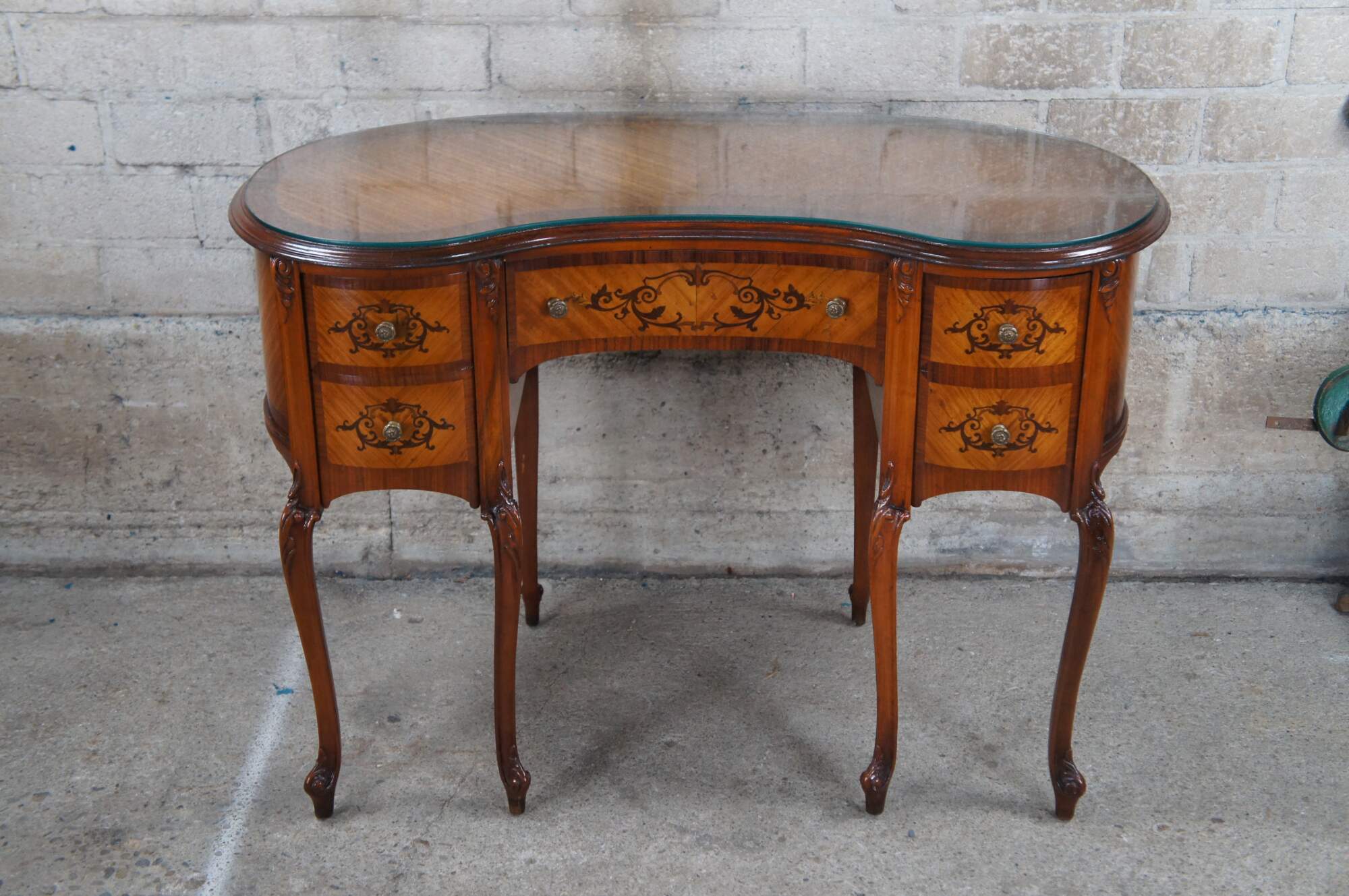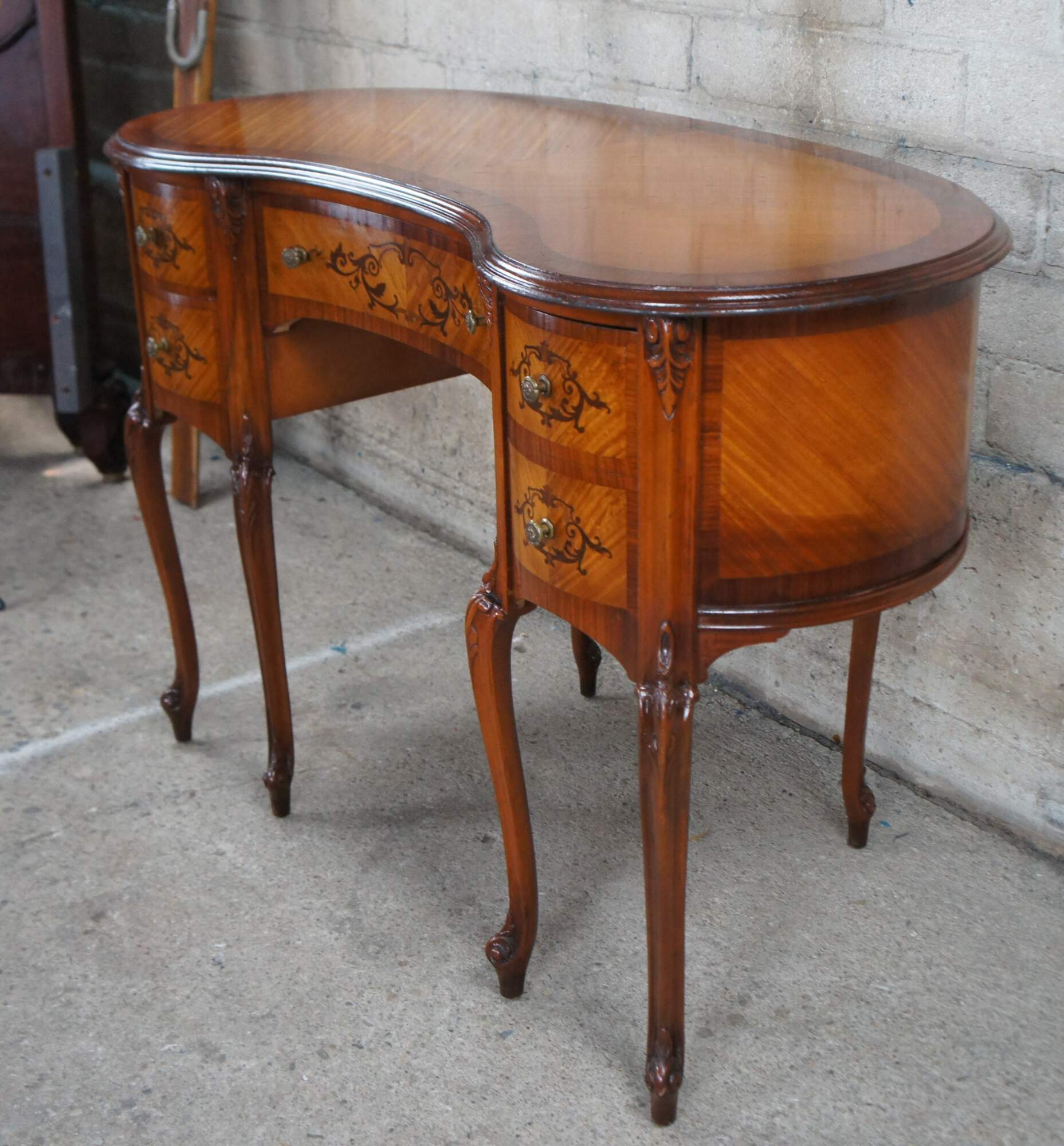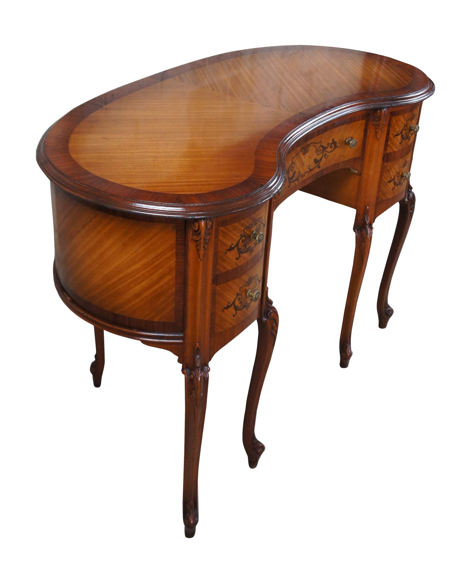 Antique French Provincial / Louis XV kidney bean kneehole writing or vanity desk. Made of mahogany and fruit wood featuring inlaid parquetry design with scrolled floral and acanthus theme.