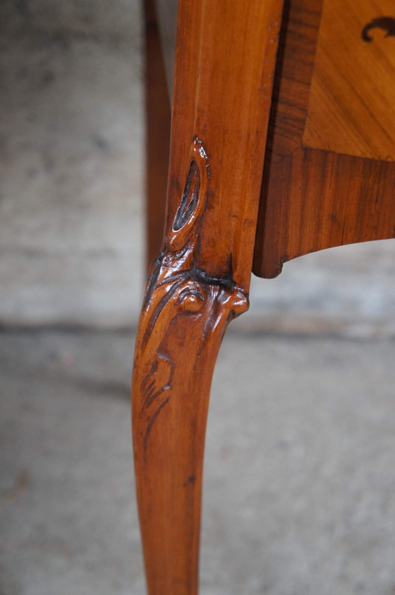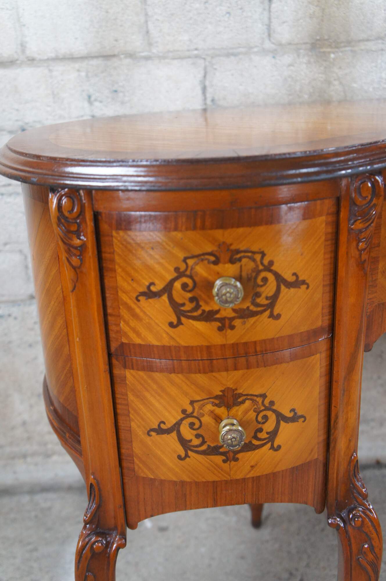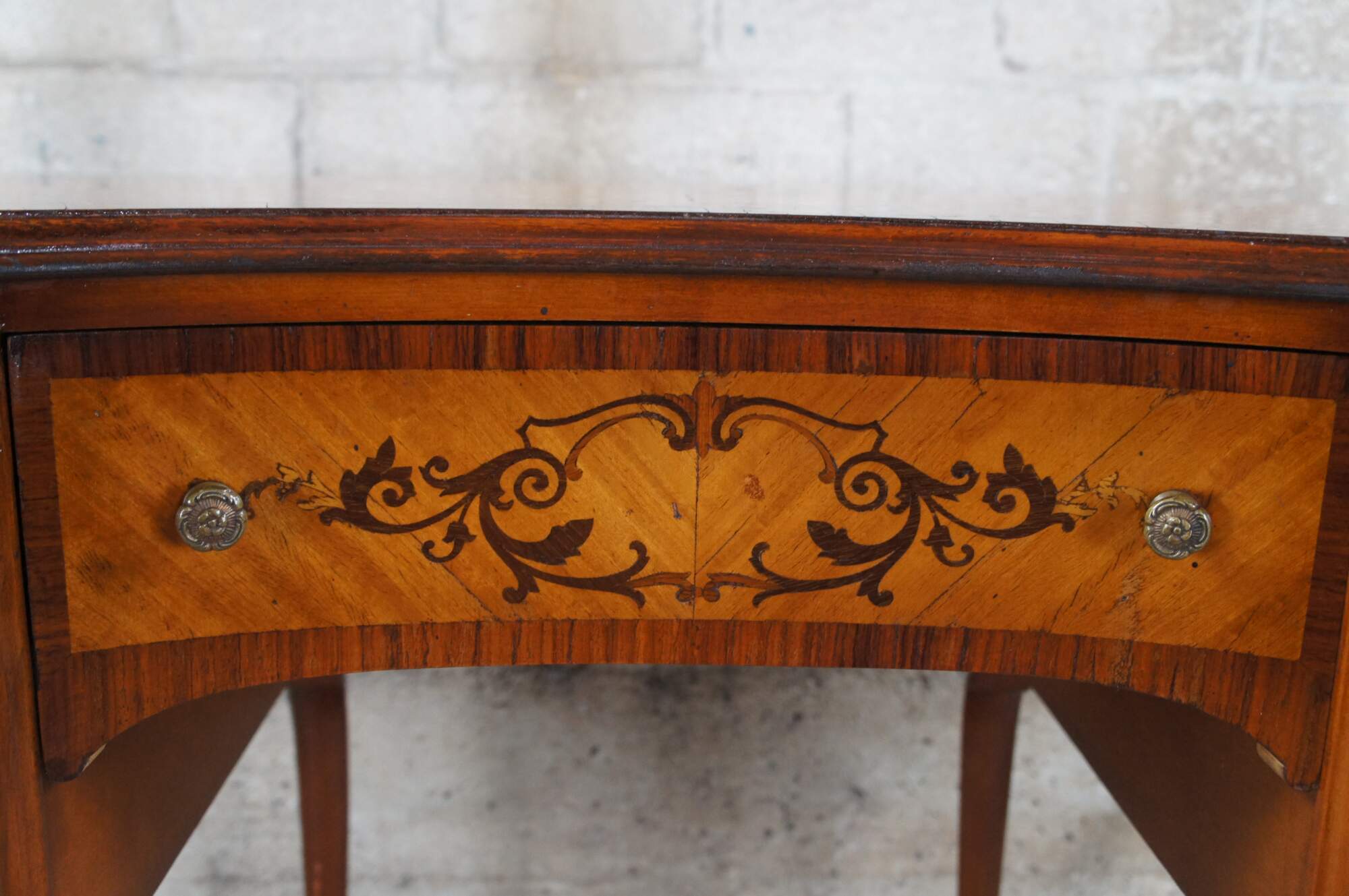 Antique French Provincial / Louis XV kidney bean kneehole writing or vanity desk. Made of mahogany and fruit wood featuring inlaid parquetry design with scrolled floral and acanthus theme.