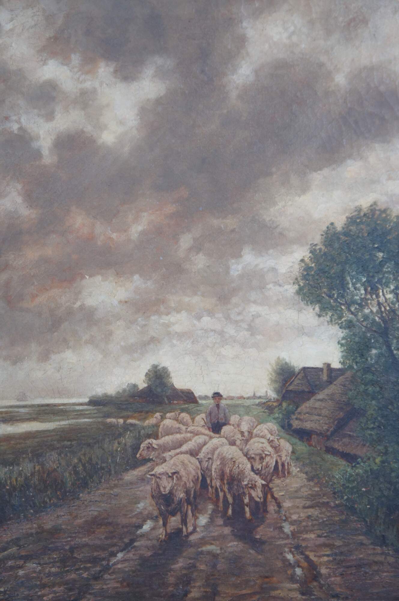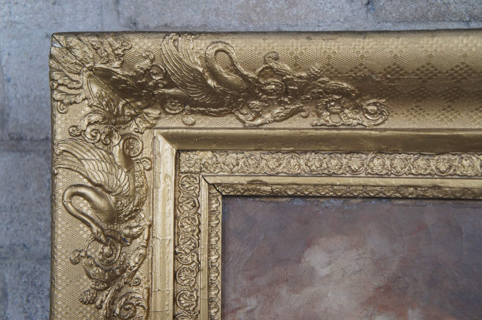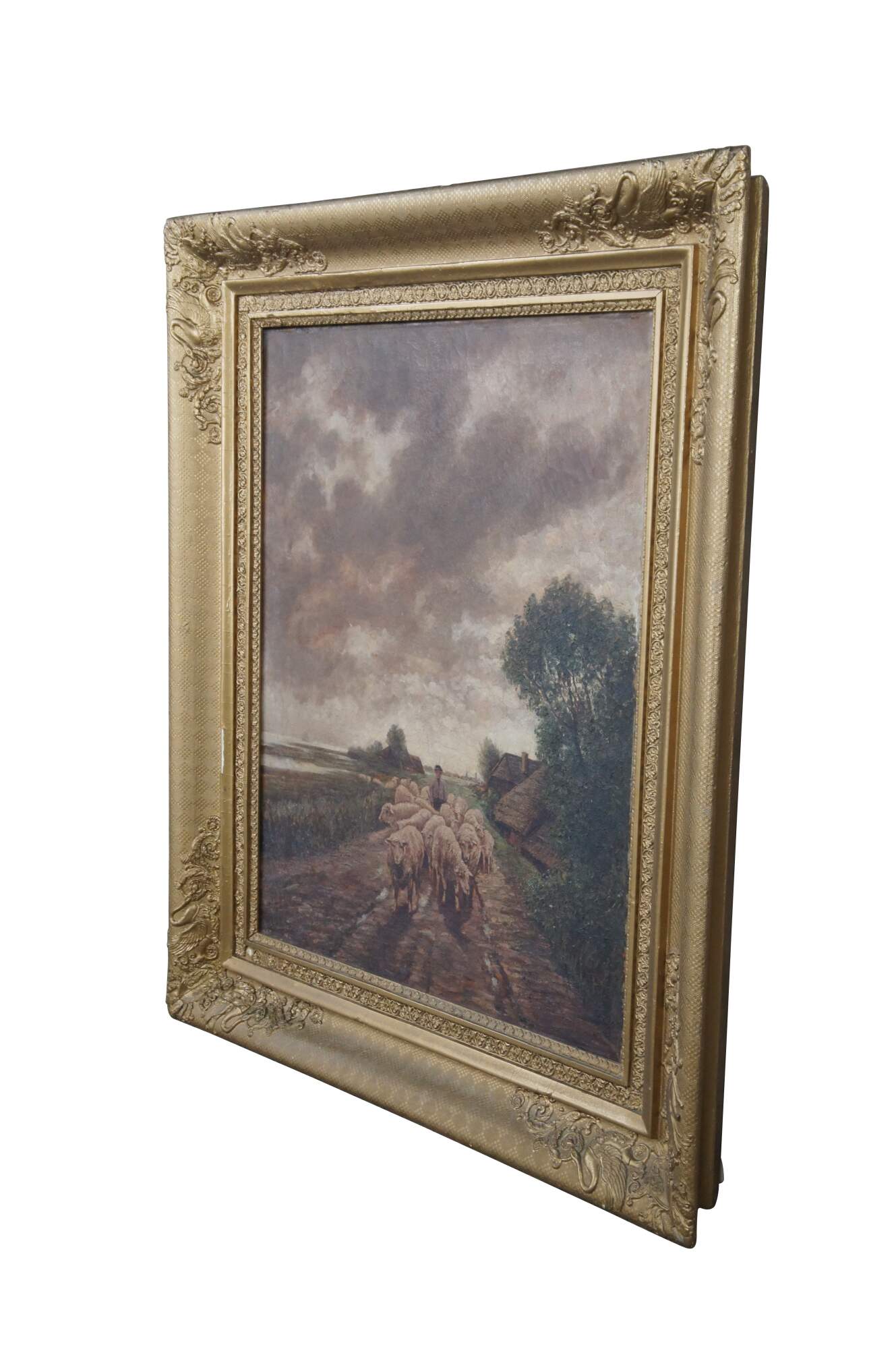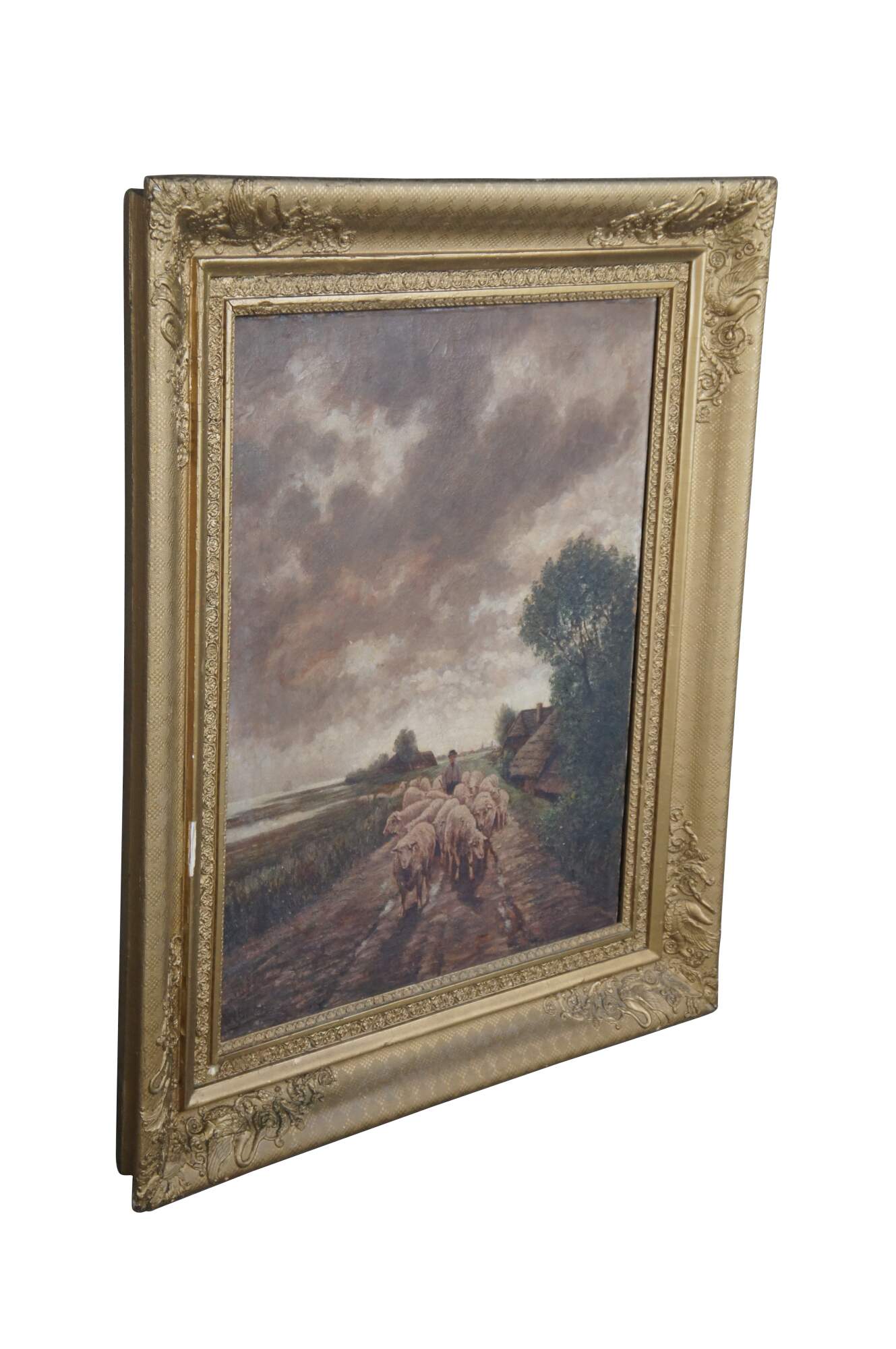 A large antique late 19th Century oil painting featuring a flock of sheep and their Drover in the countryside. The painting appears to be Danish / Dutch school. Features intricate detail and lifelike color. Framed in wood with a gold finish showcasing swans along the corners.