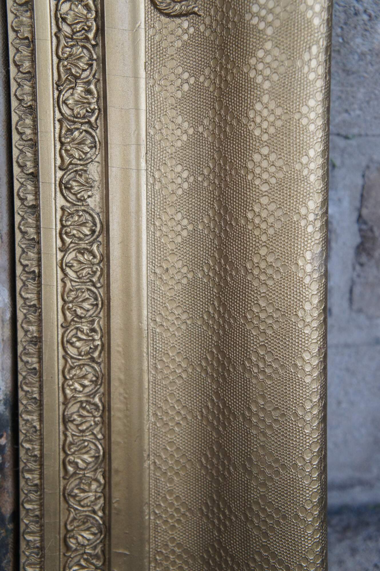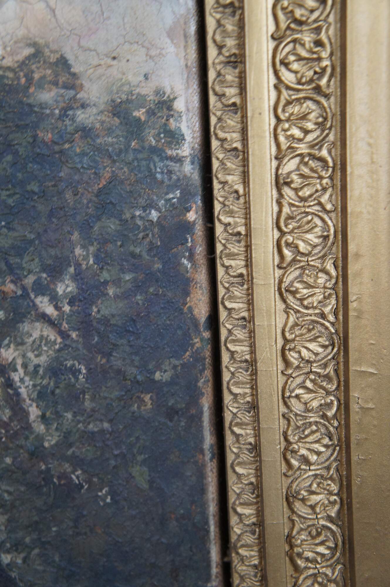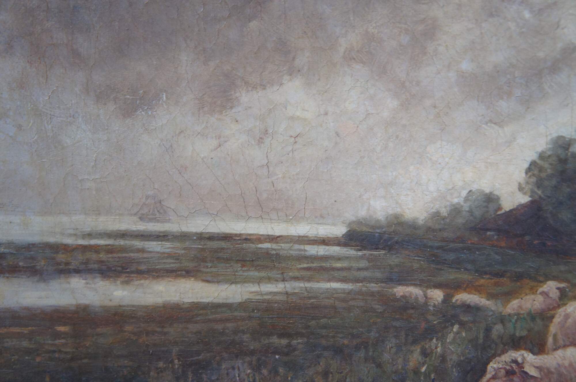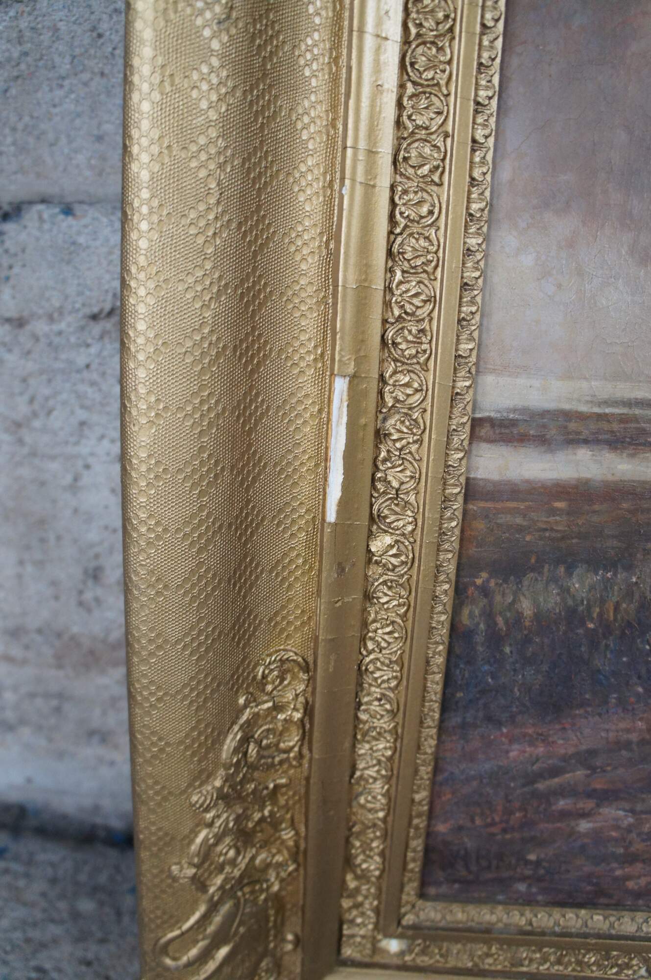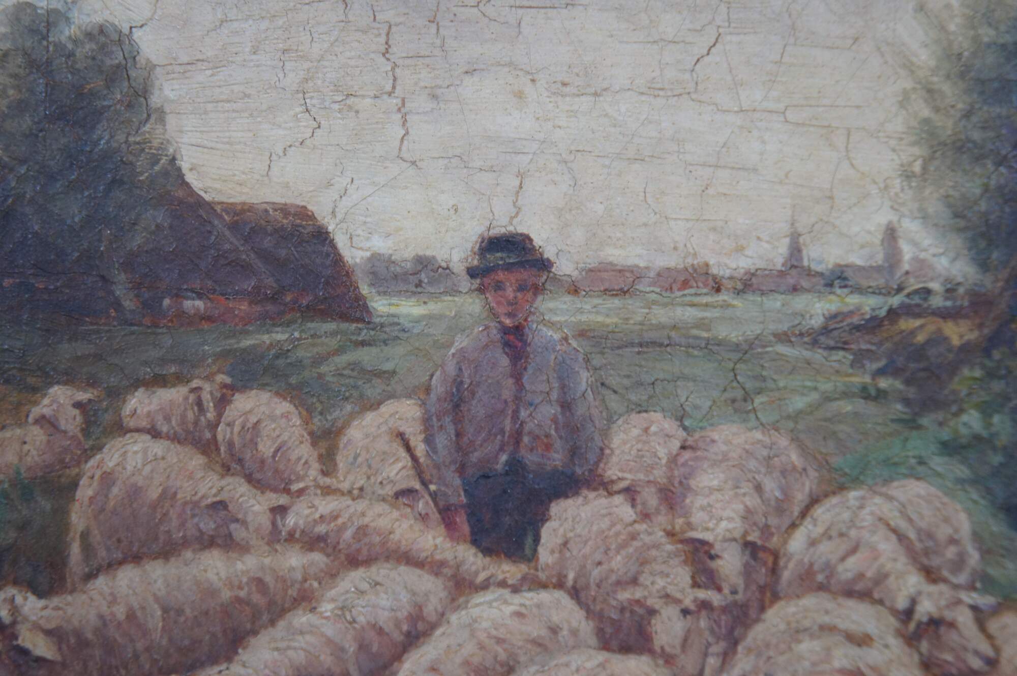 A large antique late 19th Century oil painting featuring a flock of sheep and their Drover in the countryside. The painting appears to be Danish / Dutch school. Features intricate detail and lifelike color. Framed in wood with a gold finish showcasing swans along the corners.