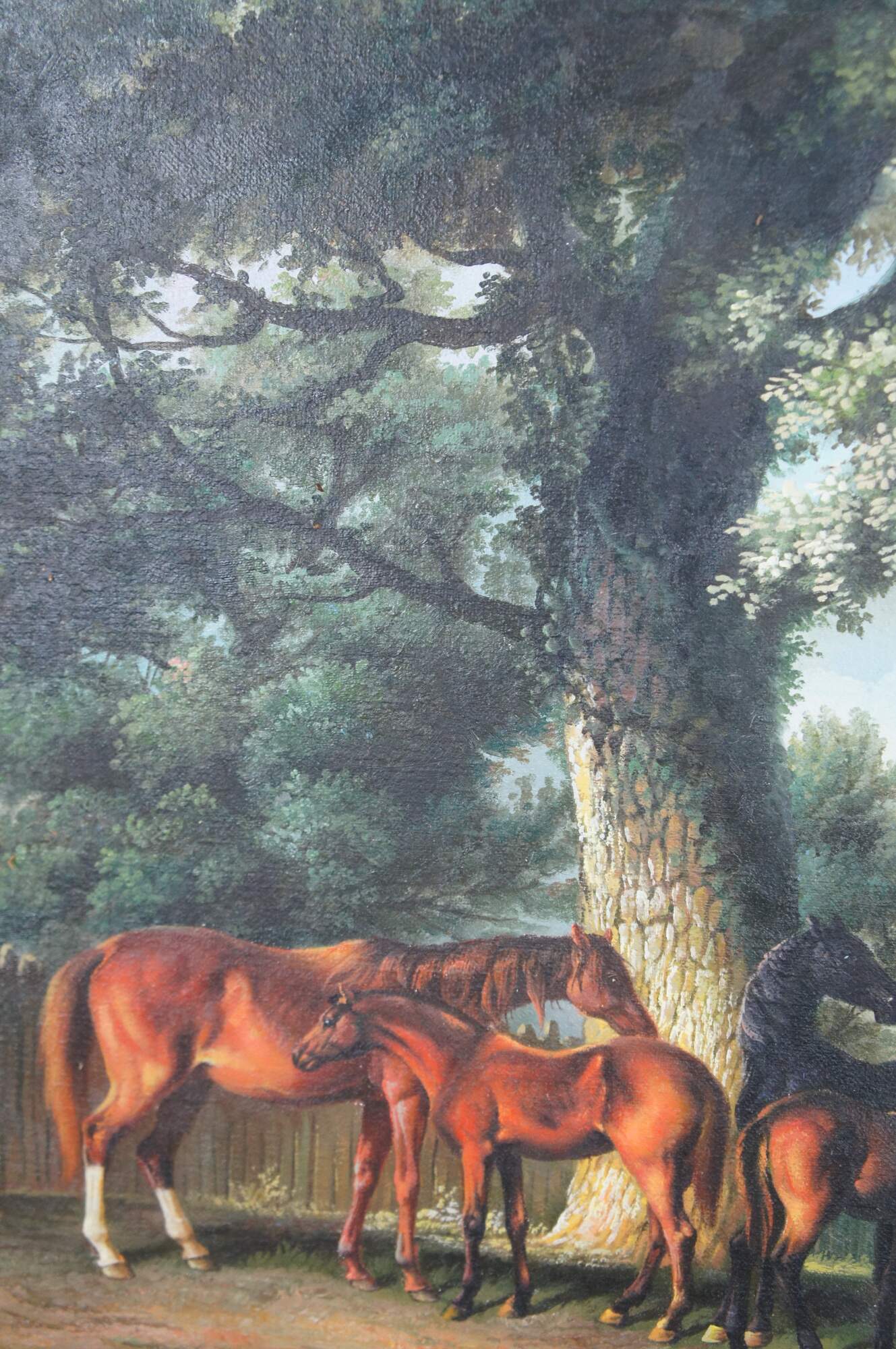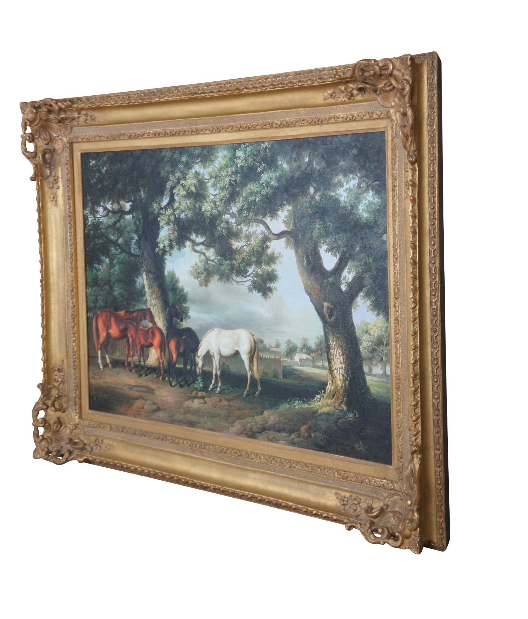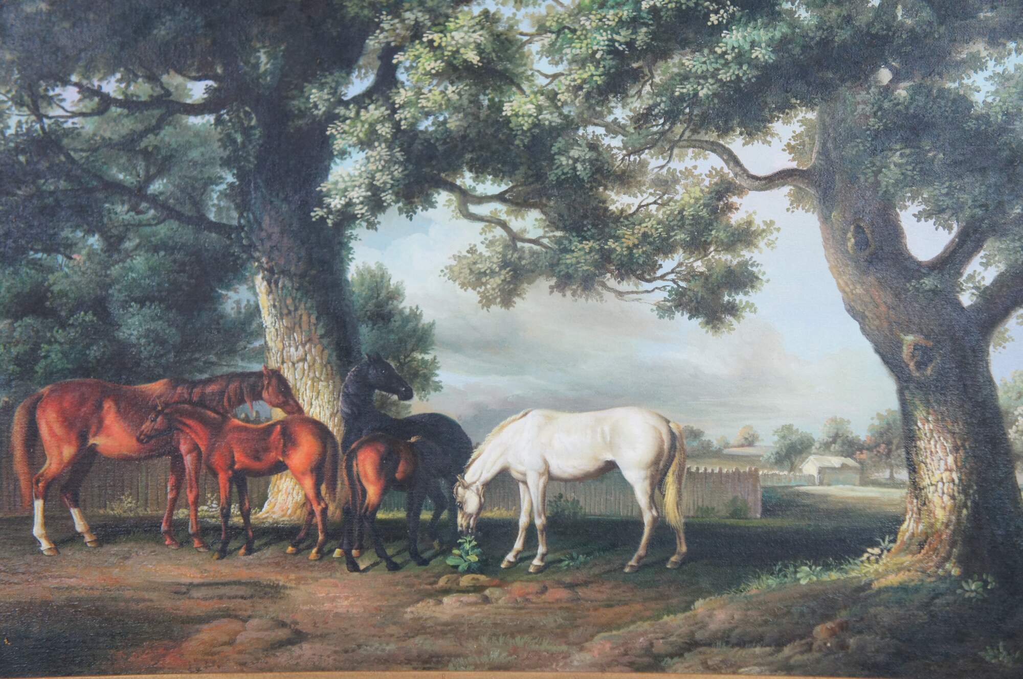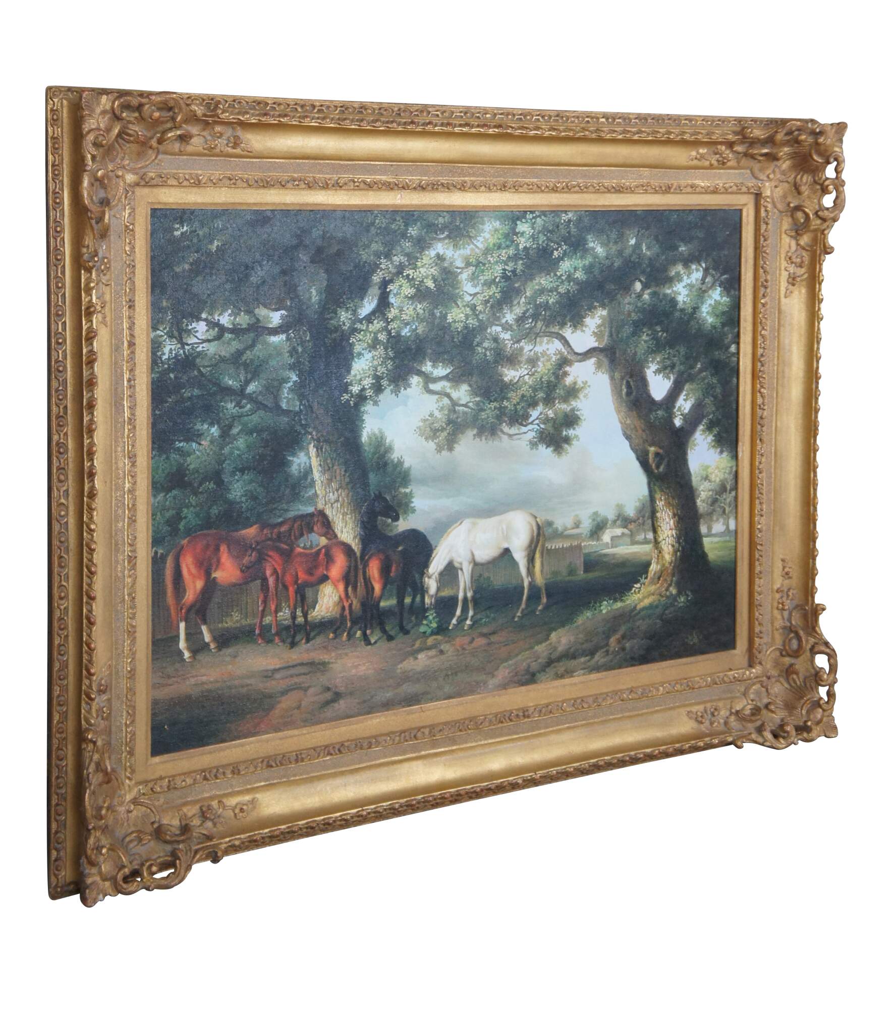 A lovely equestrian reproduction painting of Mares and Foals After George Stubbs. The original painted in 1763. Features four horses grazing under oak trees in the countryside. A fence and building can be seen in the background. The oil painting is on canvas and framed in Baroque manner.