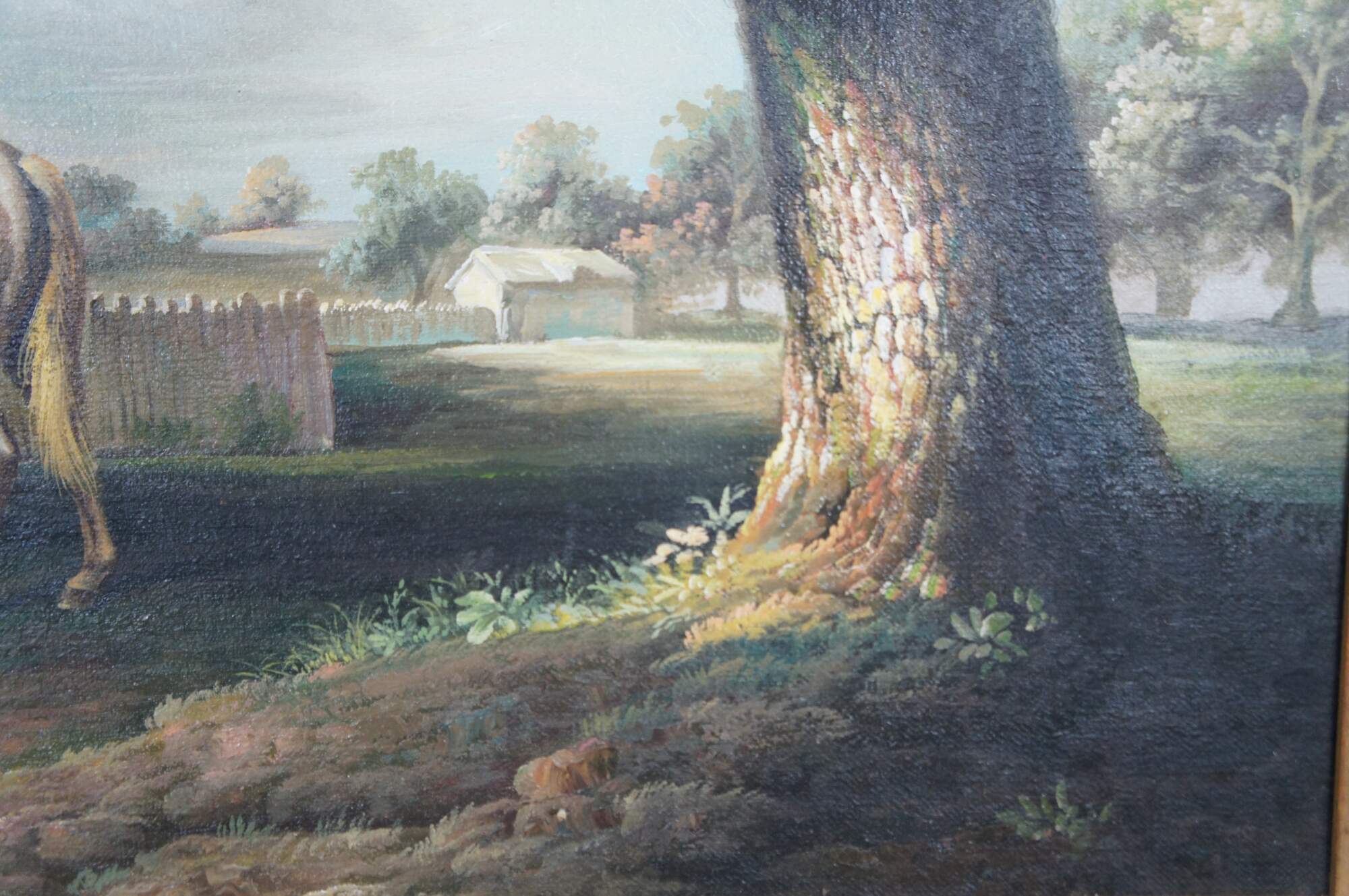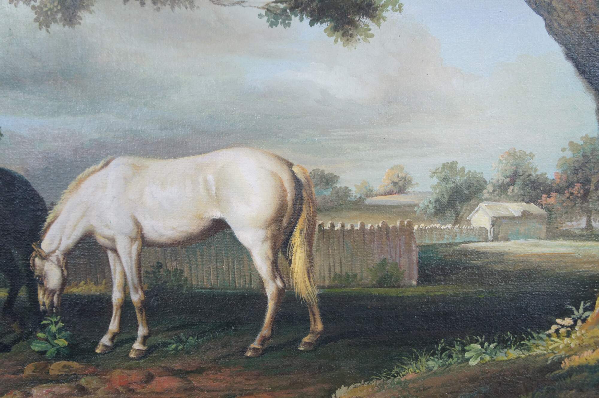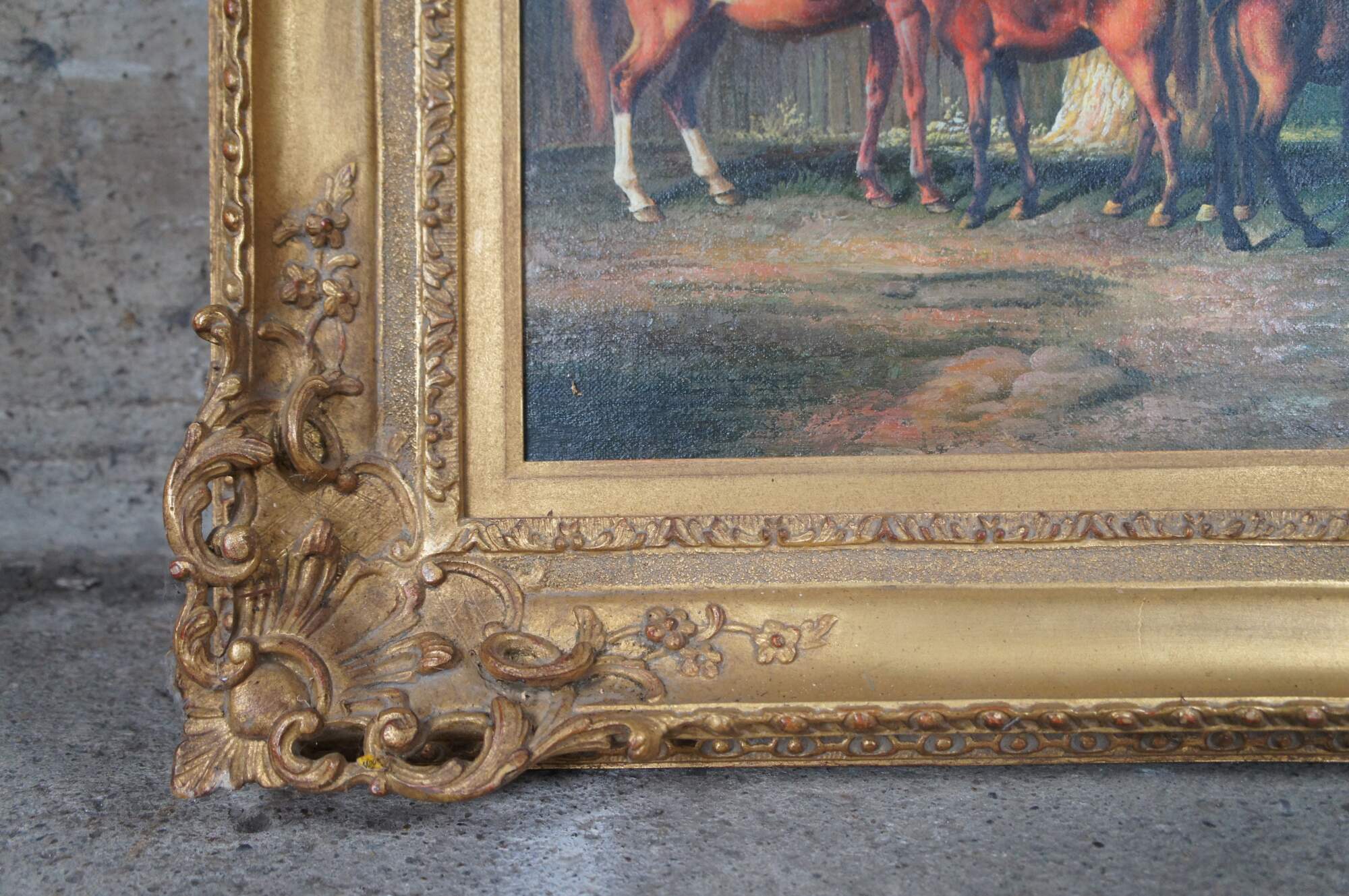 A lovely equestrian reproduction painting of Mares and Foals After George Stubbs. The original painted in 1763. Features four horses grazing under oak trees in the countryside. A fence and building can be seen in the background. The oil painting is on canvas and framed in Baroque manner.