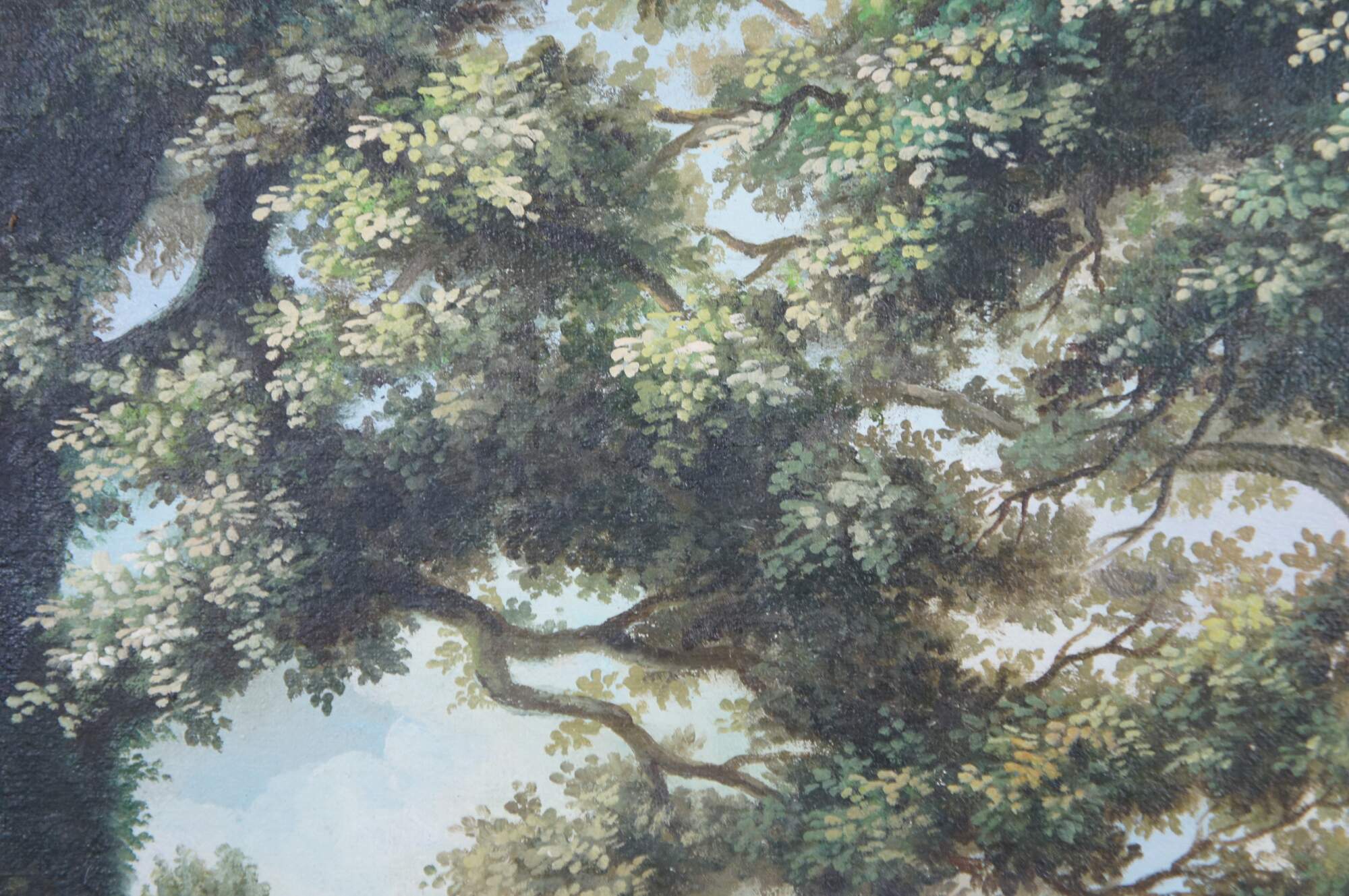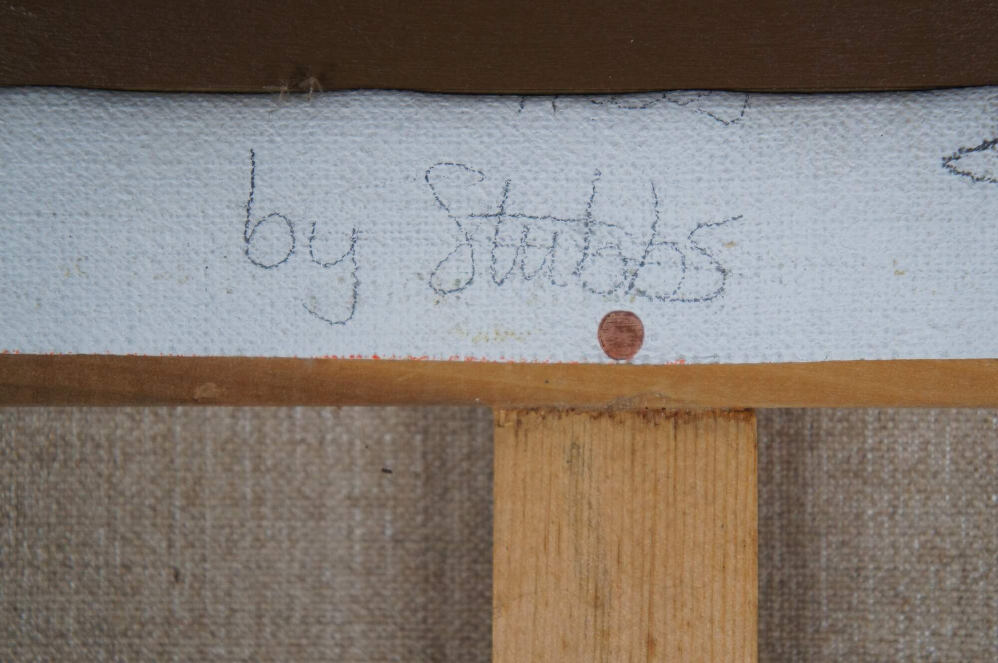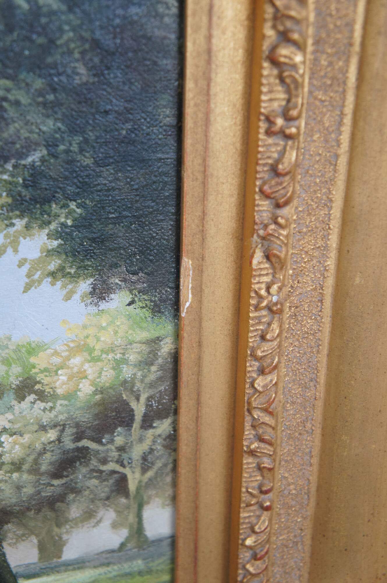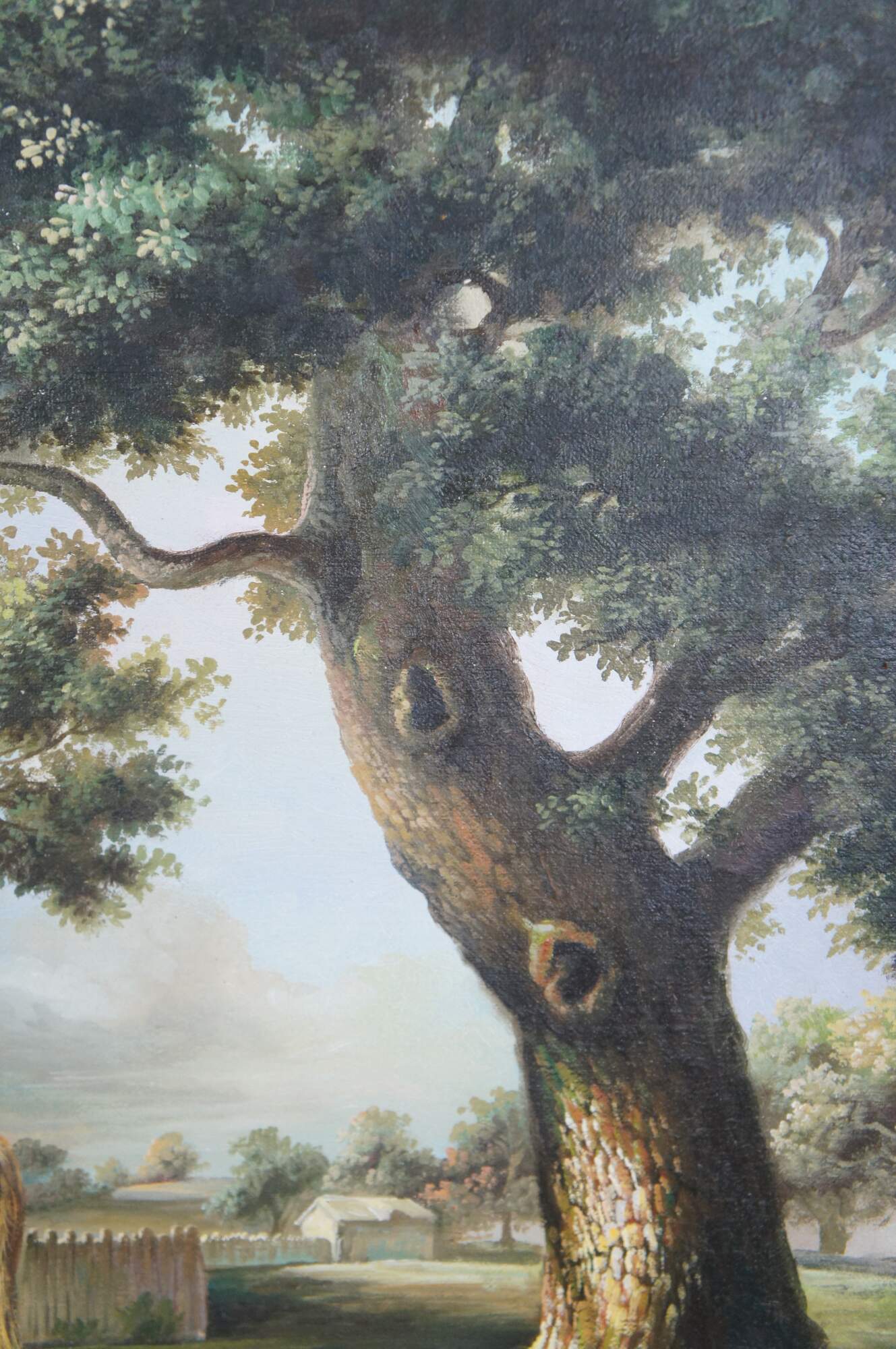 A lovely equestrian reproduction painting of Mares and Foals After George Stubbs. The original painted in 1763. Features four horses grazing under oak trees in the countryside. A fence and building can be seen in the background. The oil painting is on canvas and framed in Baroque manner.