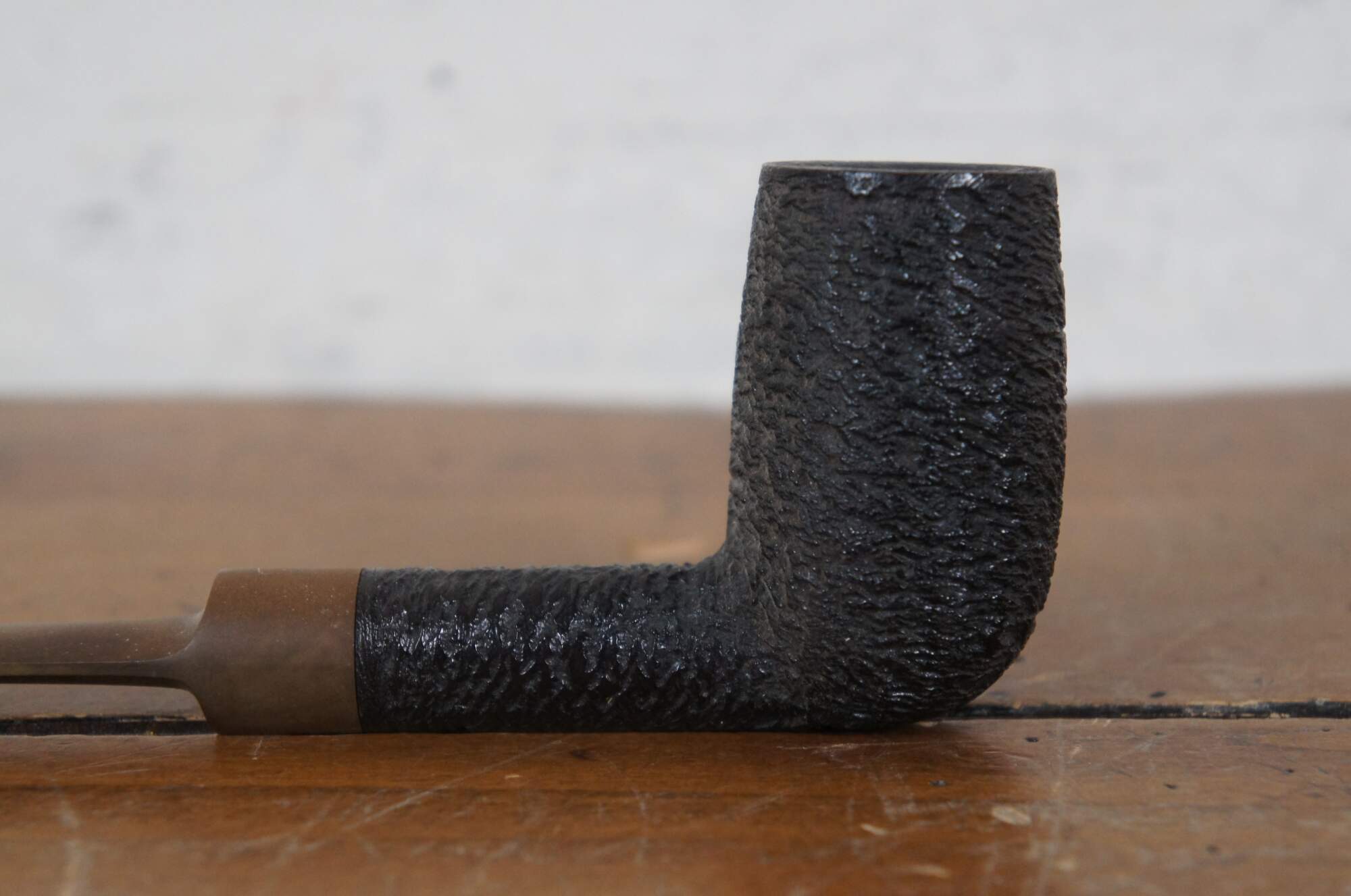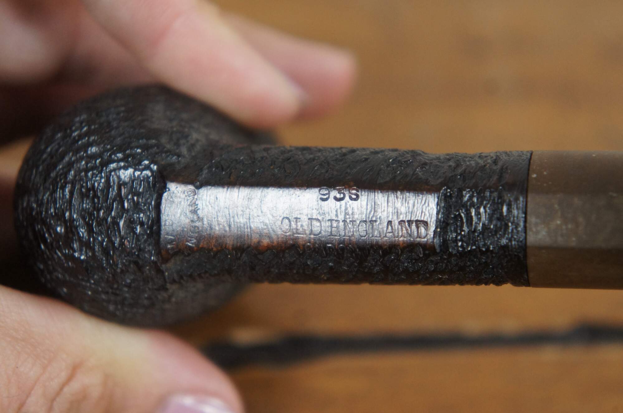 20th century vintage Old England (by Sasieni) 93S windsor briar pipe with a rusticated sandblasted finish, saddle stem / mouthpiece and chimney stack shape. Marked: Made in England / 93S / Old England London Made. Stem marked with a shield with a diagonal stripe across it.