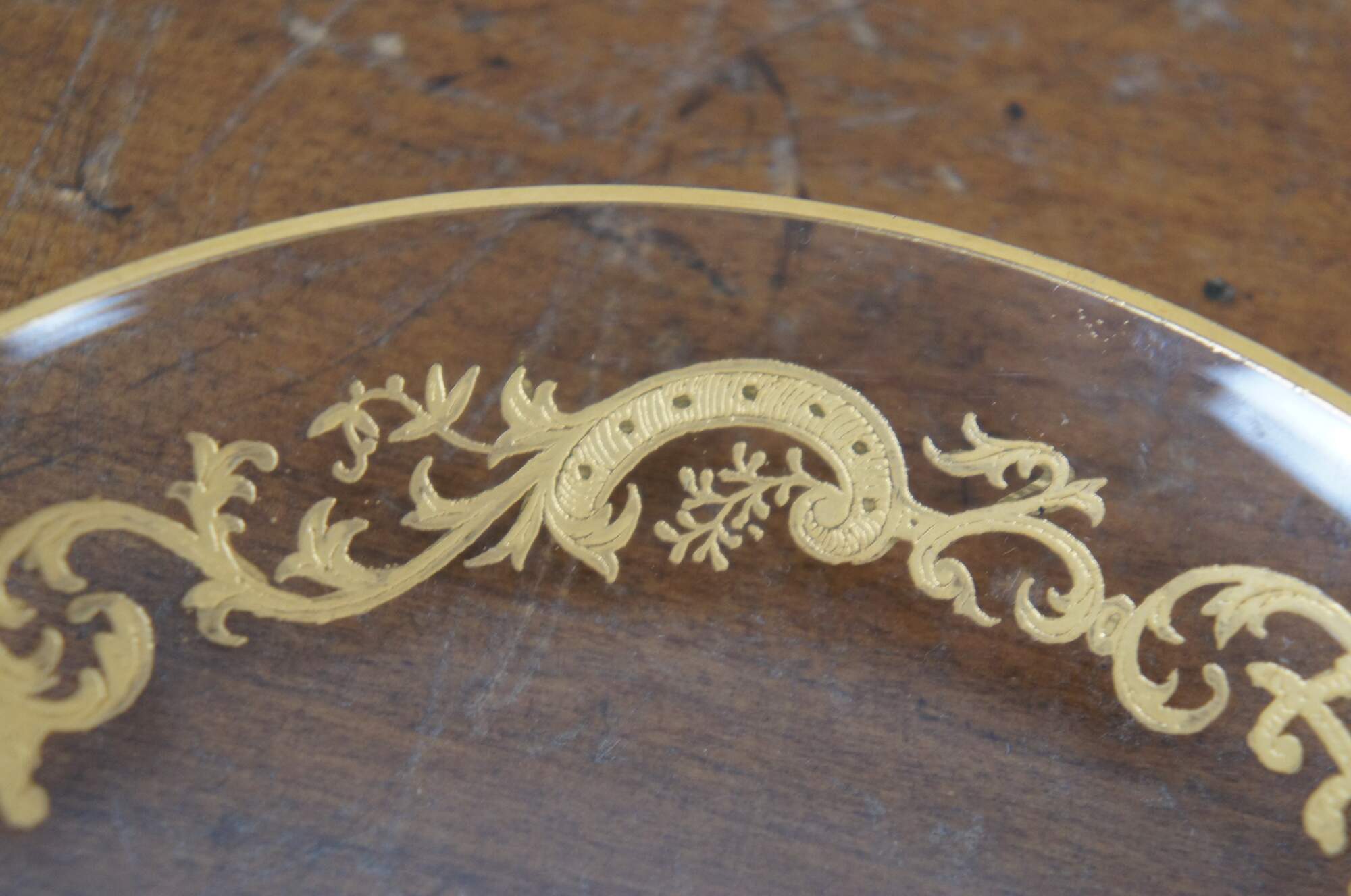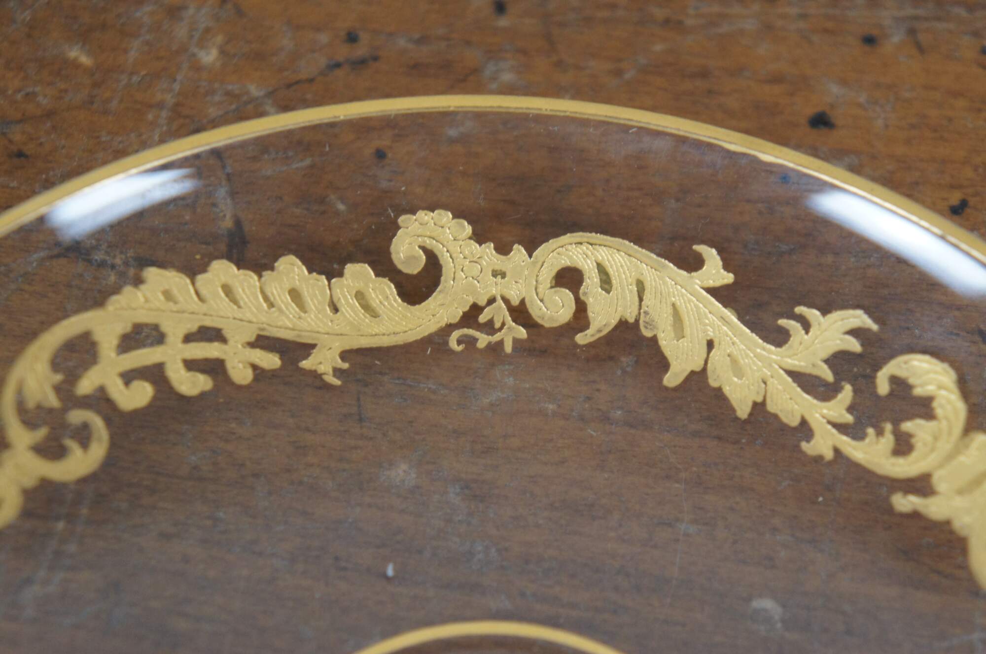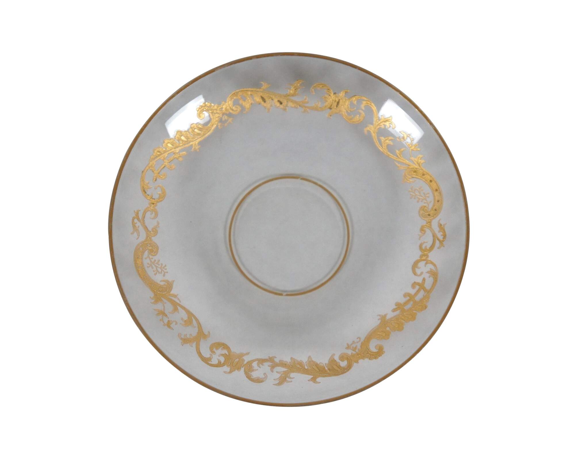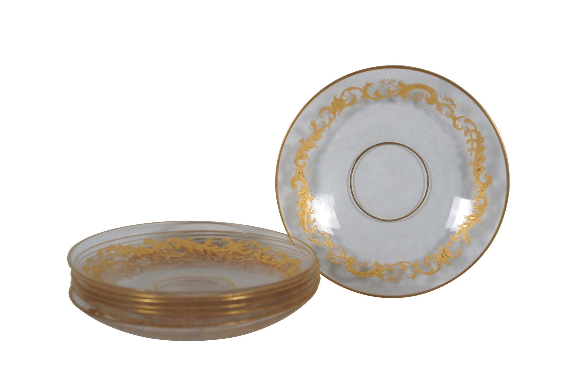 Set of seven 20th century clear crystal / glass and gold encrusted dessert fruit underplates / saucers, featuring gold rims and etched / gilded design of swirling leaves. Attributed to Saint Louis - France.