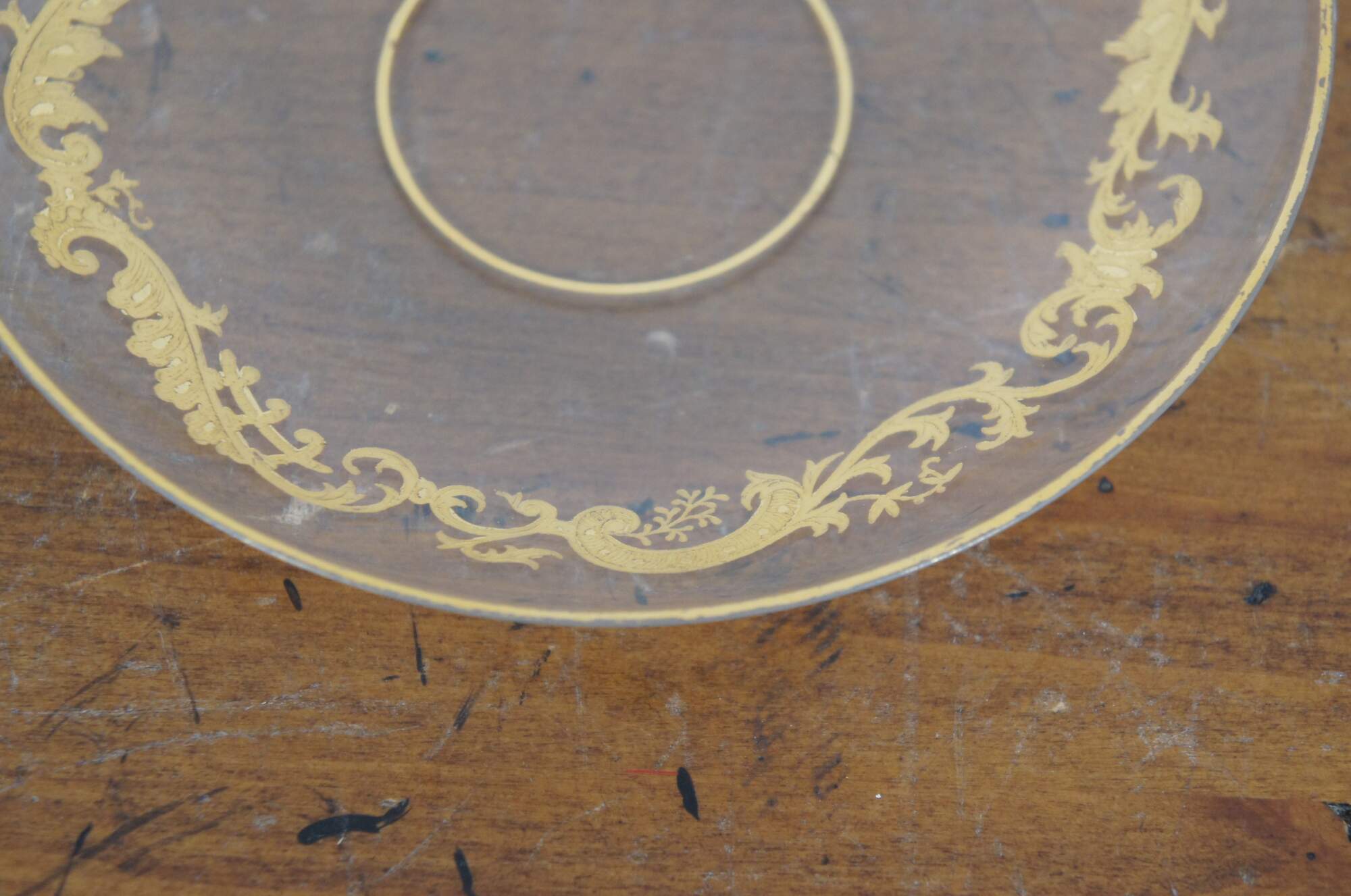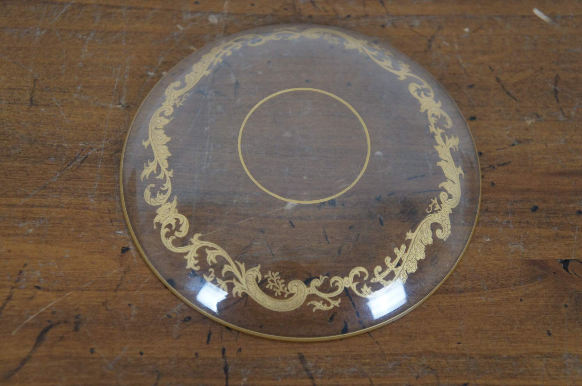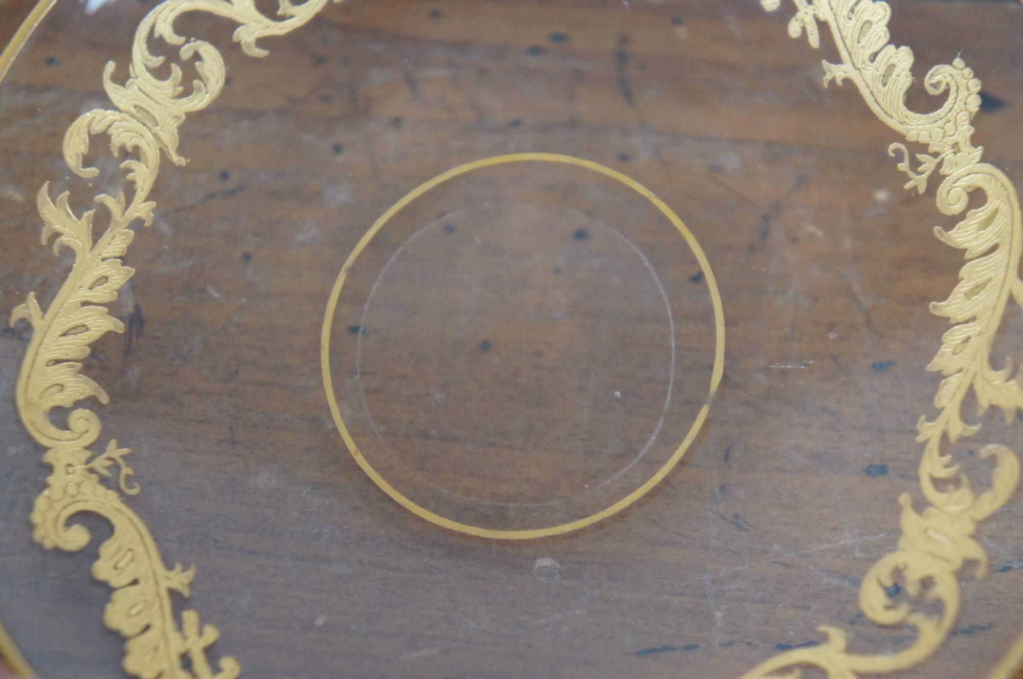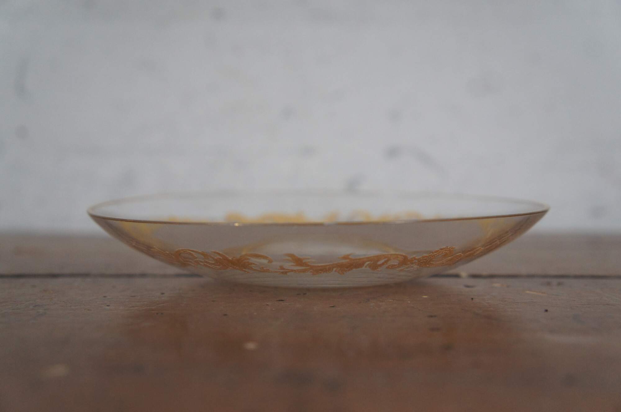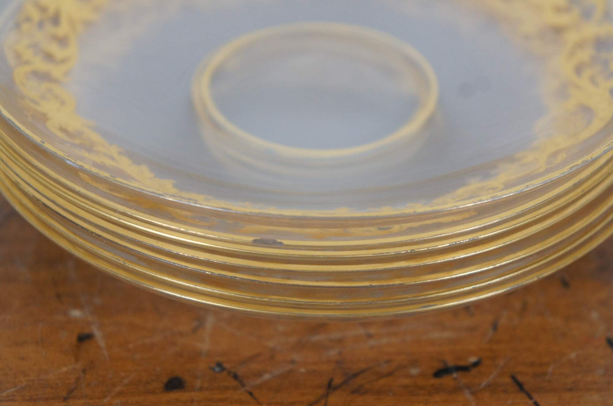 Set of seven 20th century clear crystal / glass and gold encrusted dessert fruit underplates / saucers, featuring gold rims and etched / gilded design of swirling leaves. Attributed to Saint Louis - France.