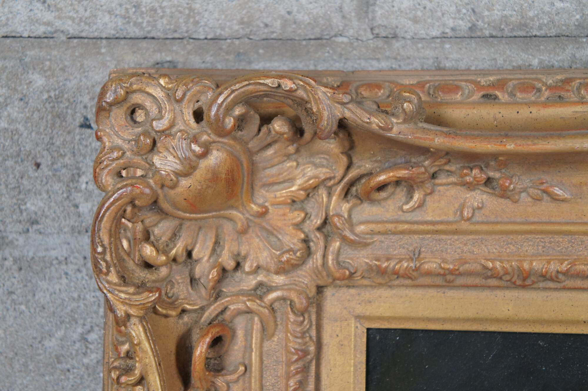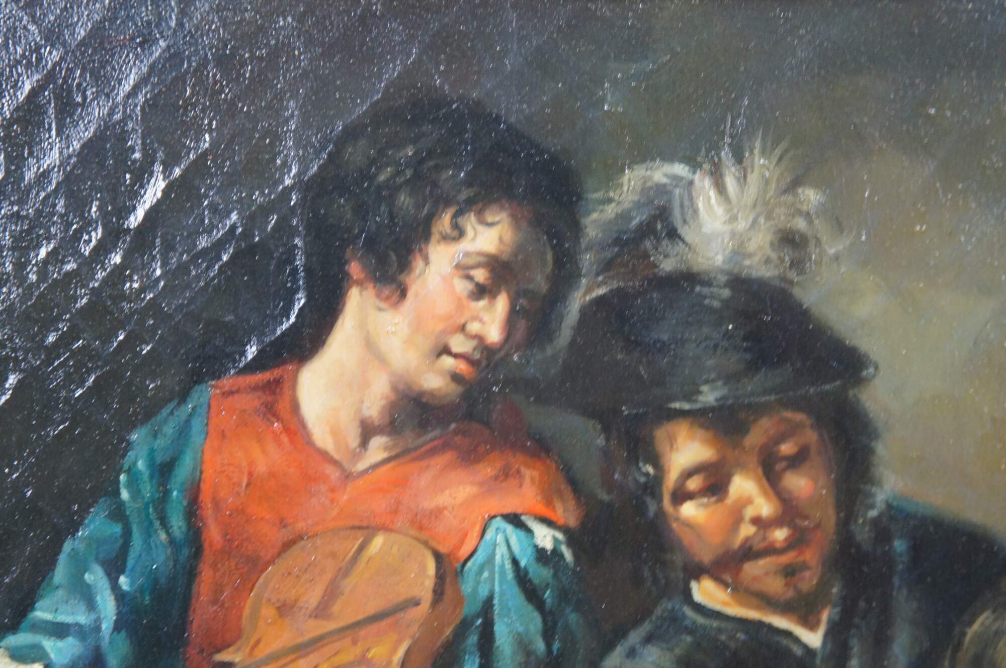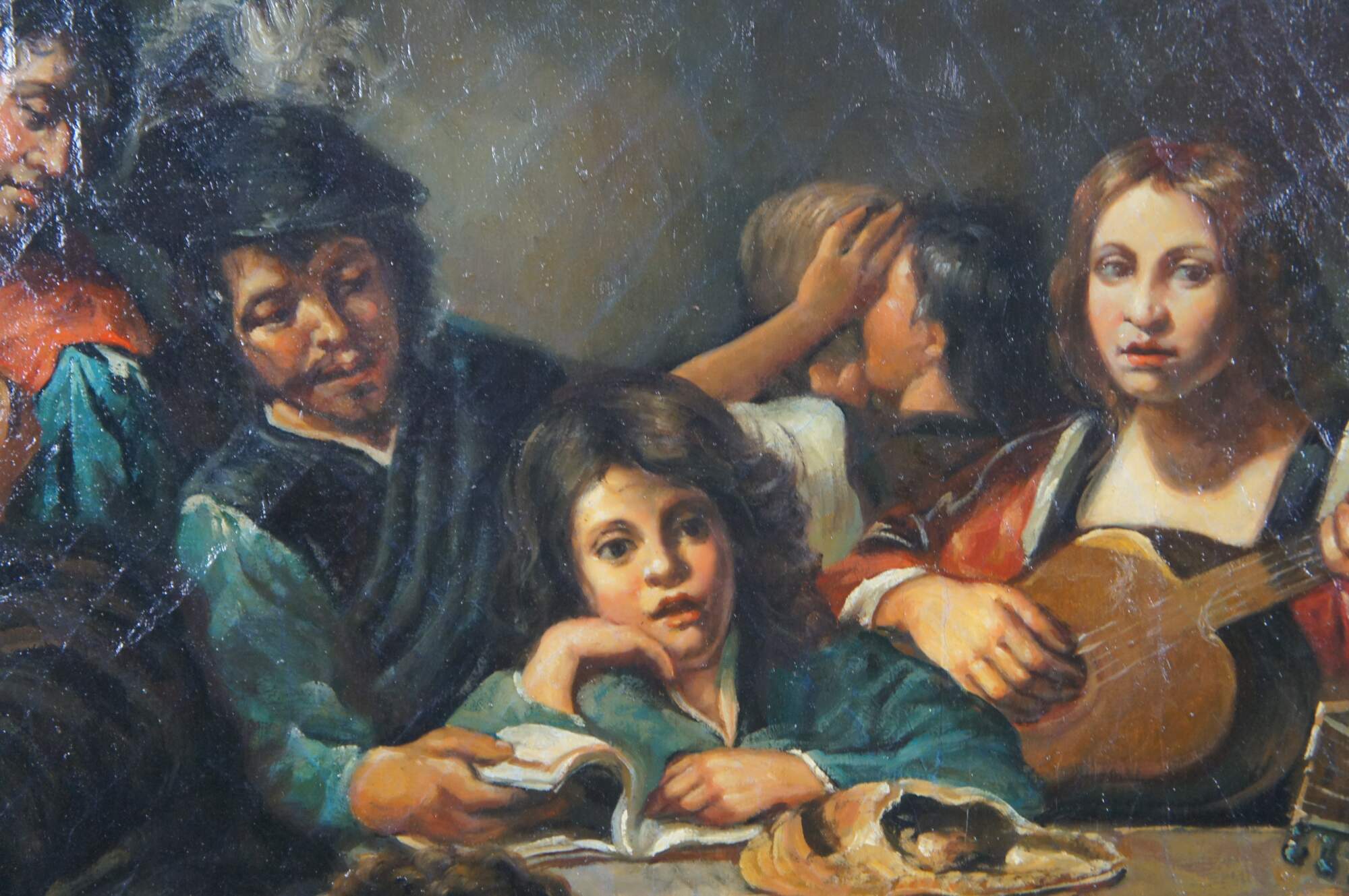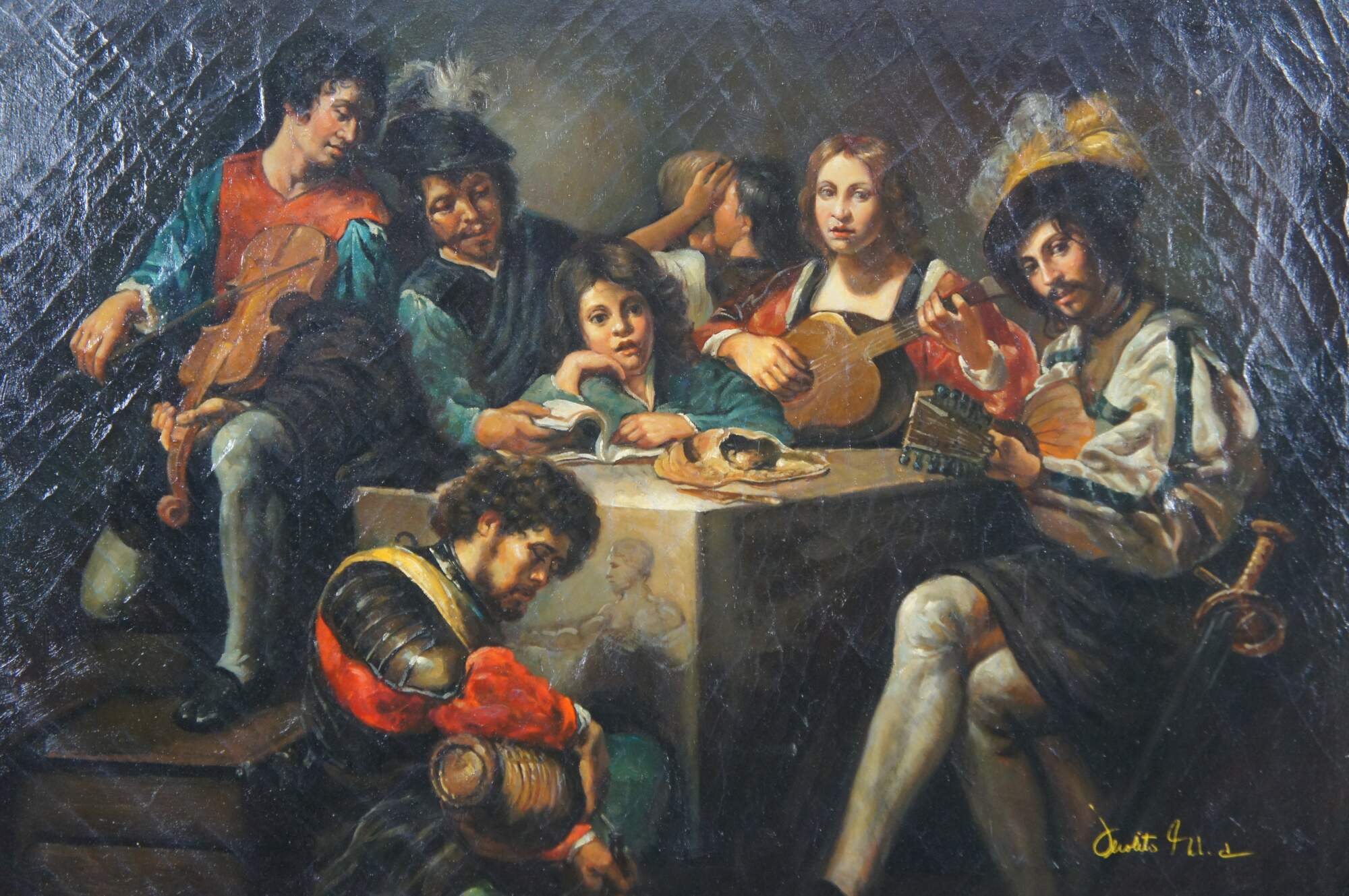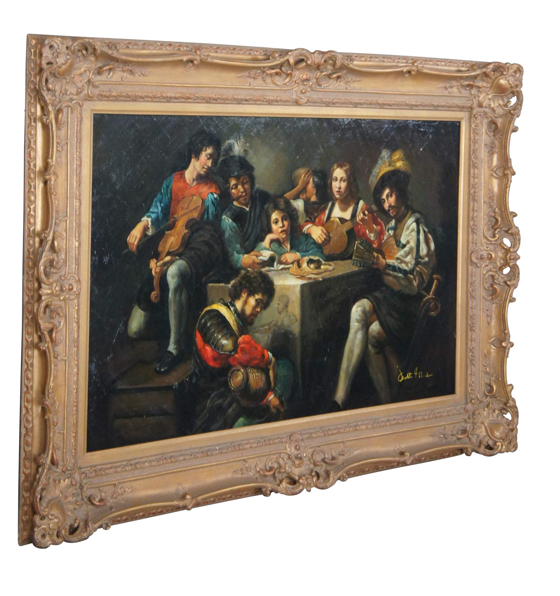 Reprodution oil painting of "Concert with a Bas-Relief after Valentin de Boulogne, French ca 1624-26. The oil painting is on canvas with natural aging and craquelure. Framed in baroque manner with ornate scalloping.