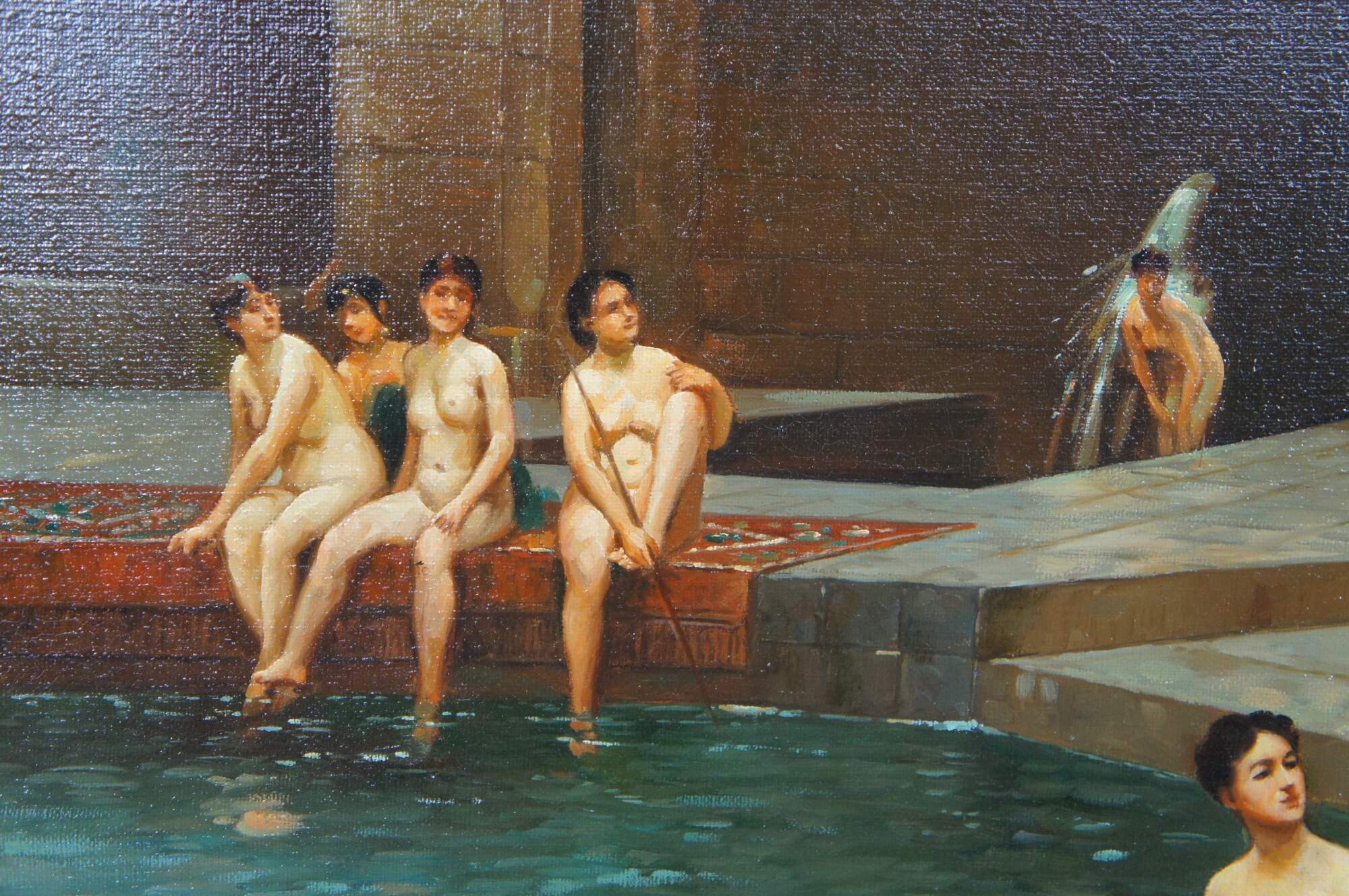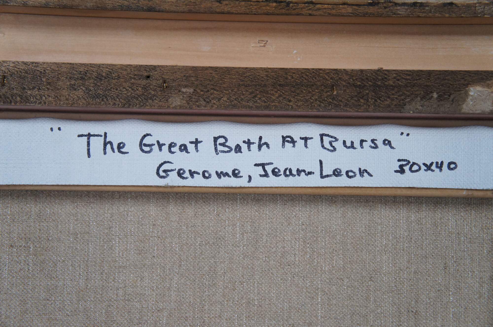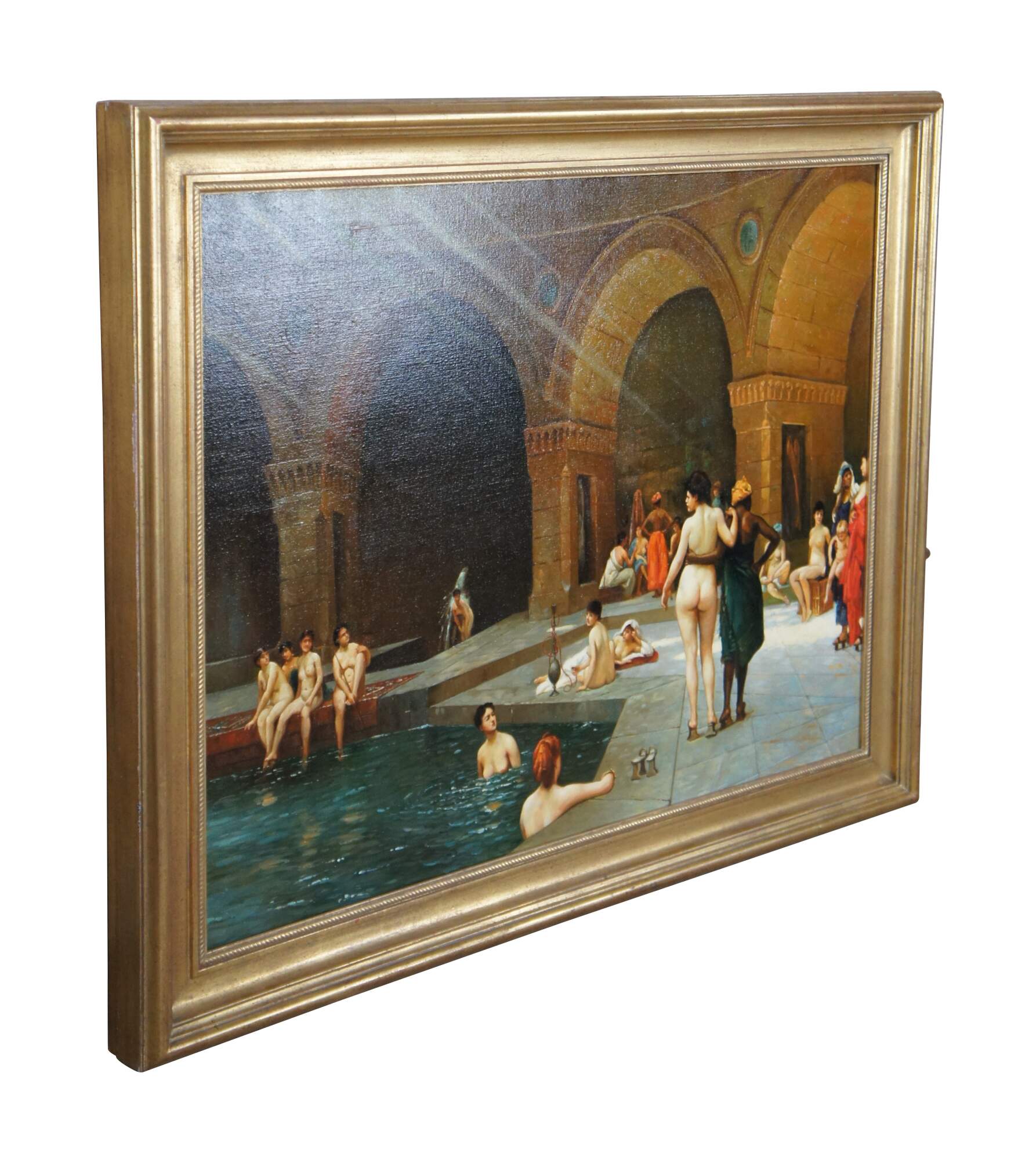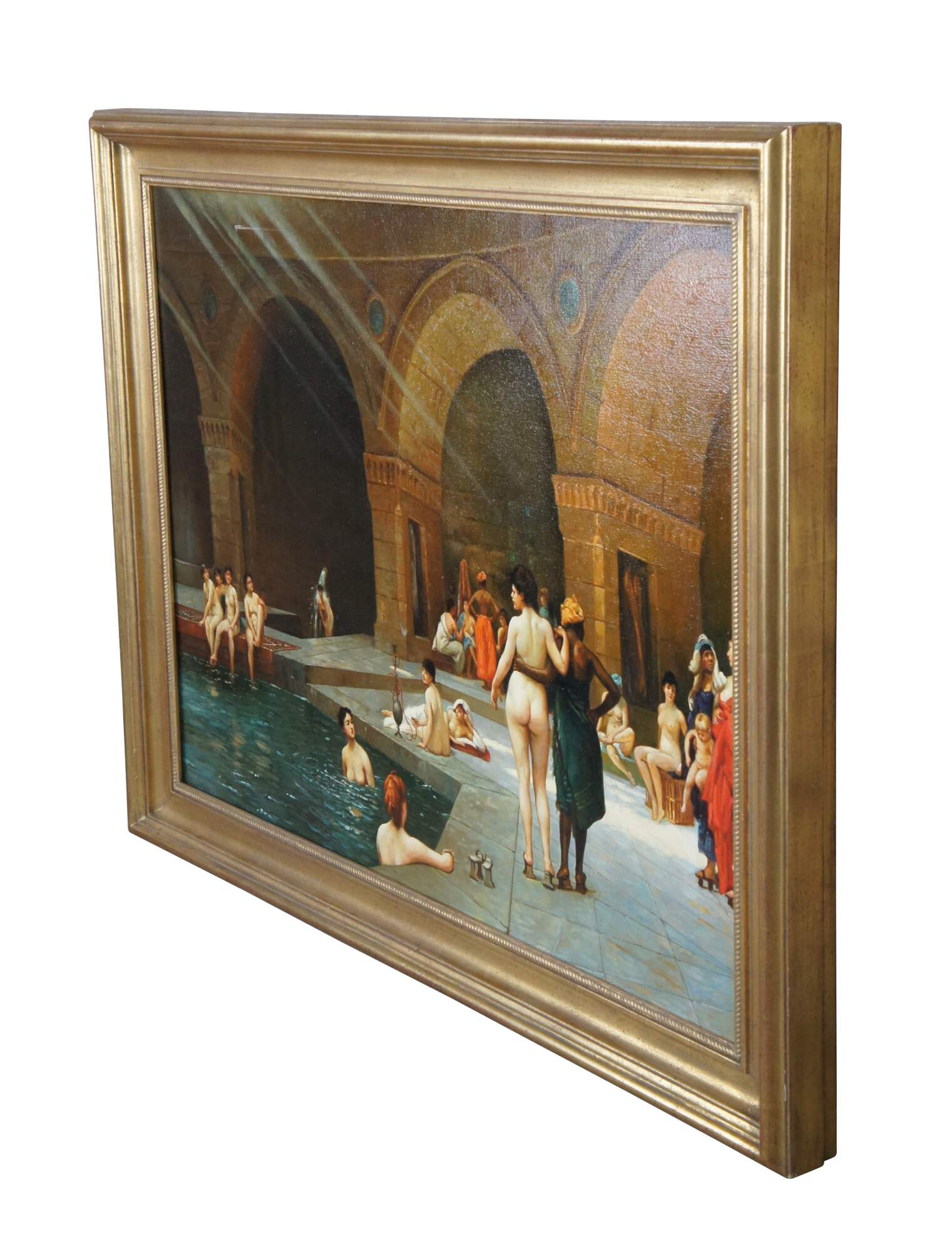Late 20th Century painting after Jean Leon Geromes "Great Bath at Bursa" in 1885. The Great Pool of Brousse is a painting by the French painter Jean-Léon Gérôme in 1885. This orientalist oil on canvas depicts naked women inside public baths in Bursa, today in Turkey . Exhibited at the Salon of 1885, it is now kept in a private collection. The painting is framed in wood with a gold finish.