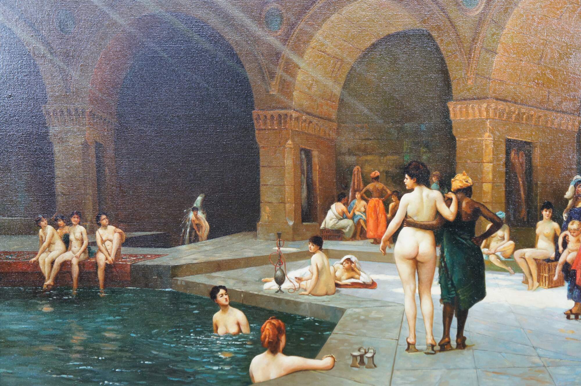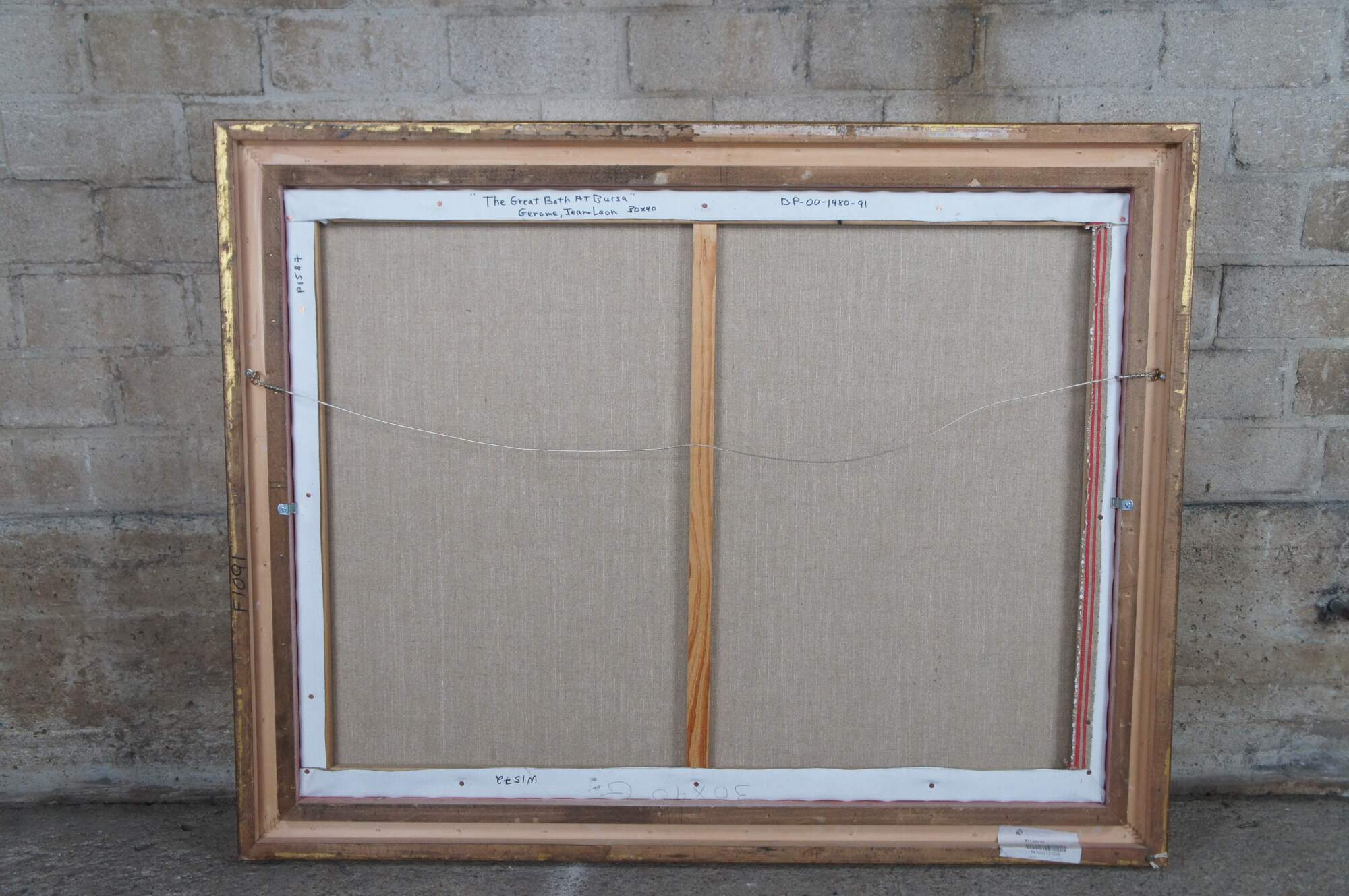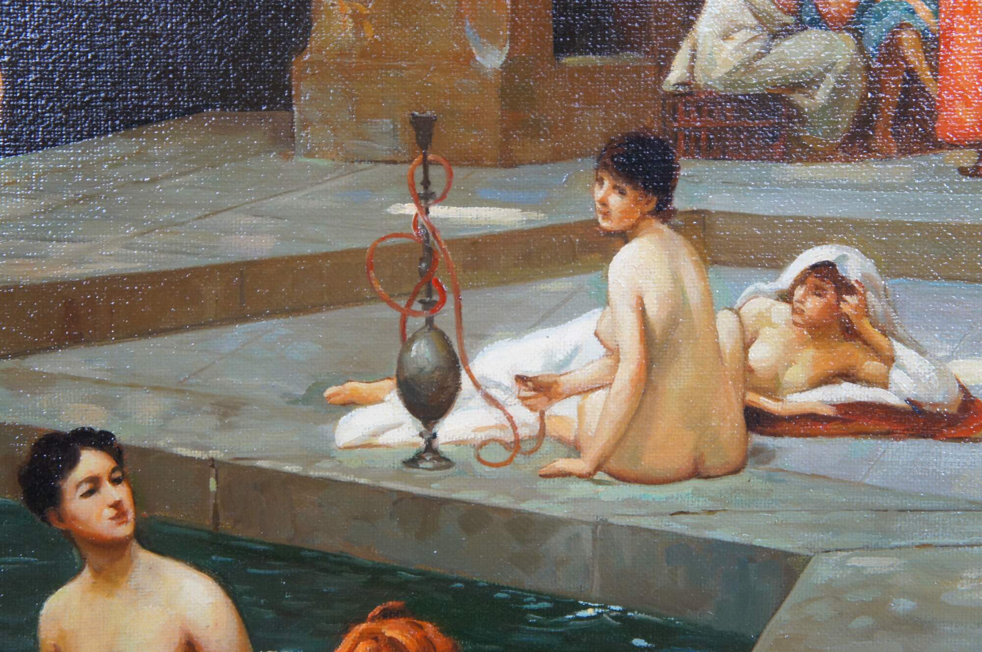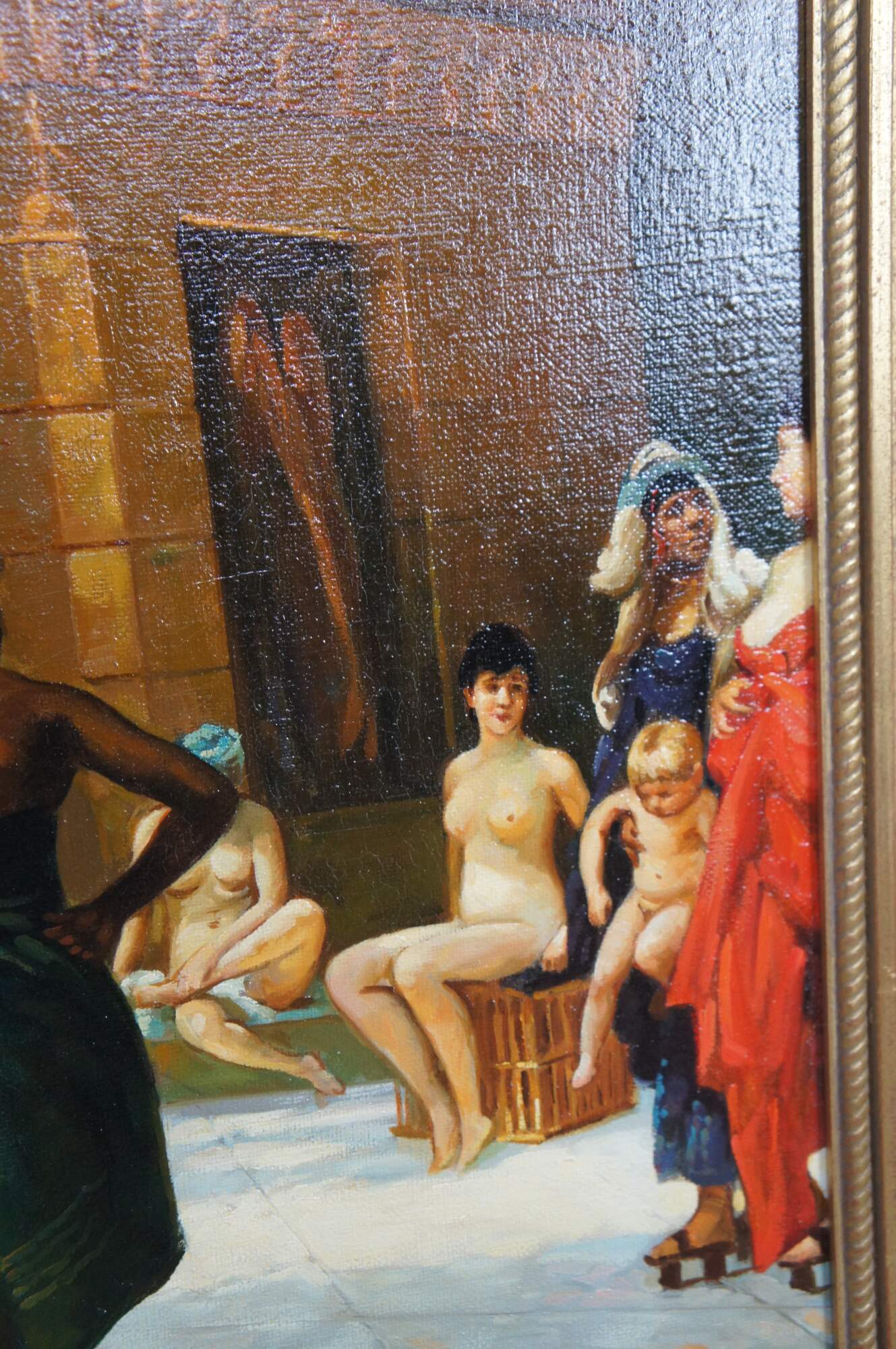 Late 20th Century painting after Jean Leon Geromes "Great Bath at Bursa" in 1885. The Great Pool of Brousse is a painting by the French painter Jean-Léon Gérôme in 1885. This orientalist oil on canvas depicts naked women inside public baths in Bursa, today in Turkey . Exhibited at the Salon of 1885, it is now kept in a private collection. The painting is framed in wood with a gold finish.