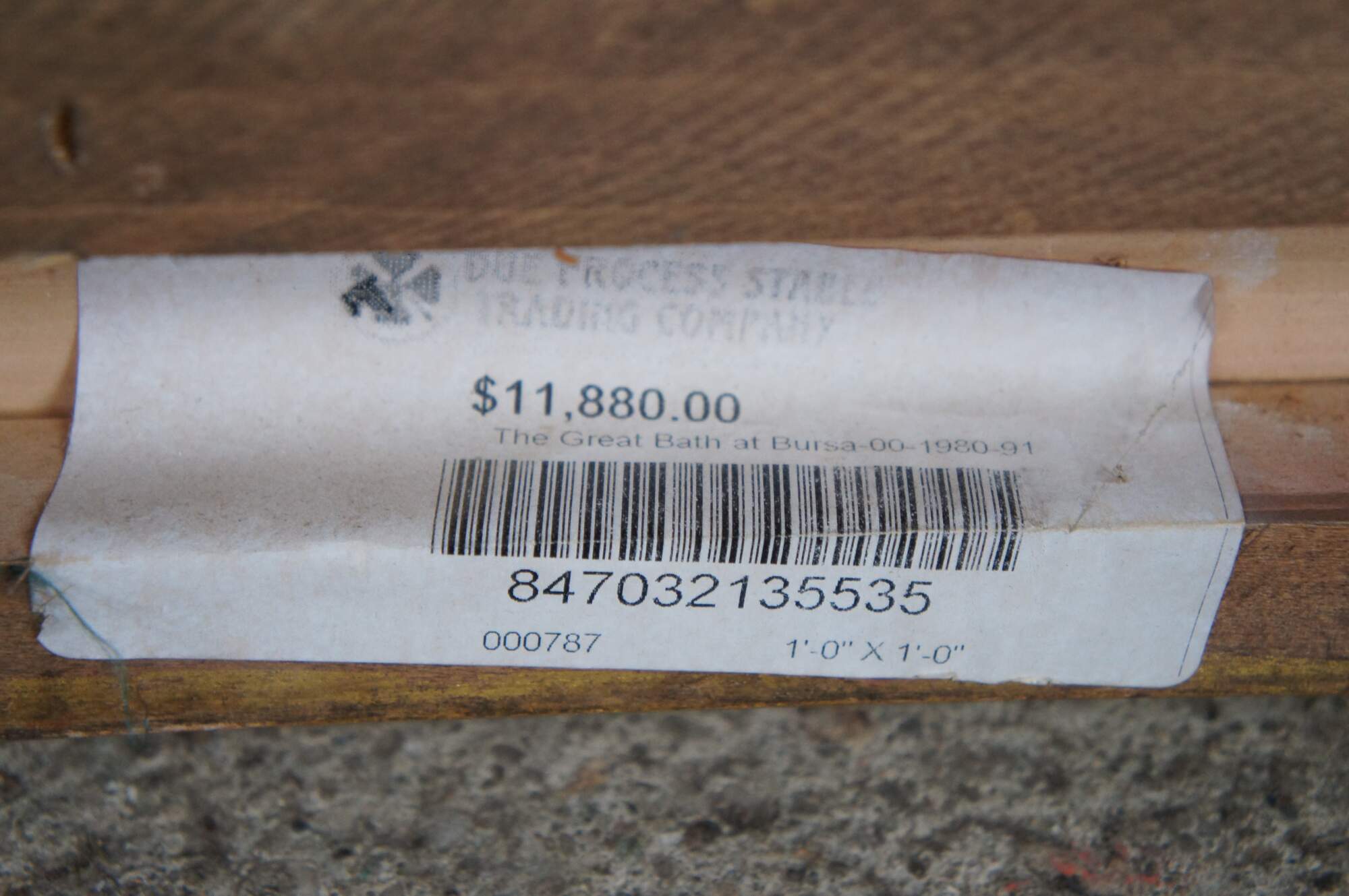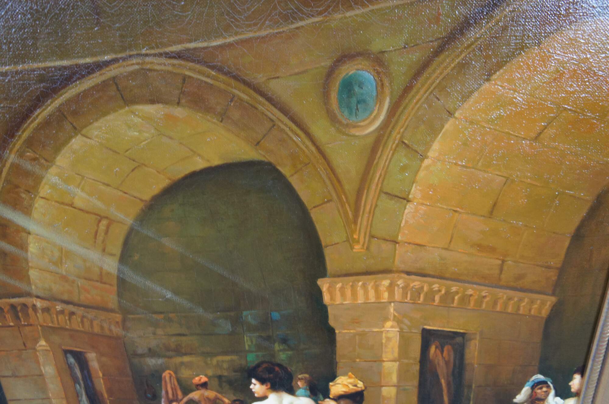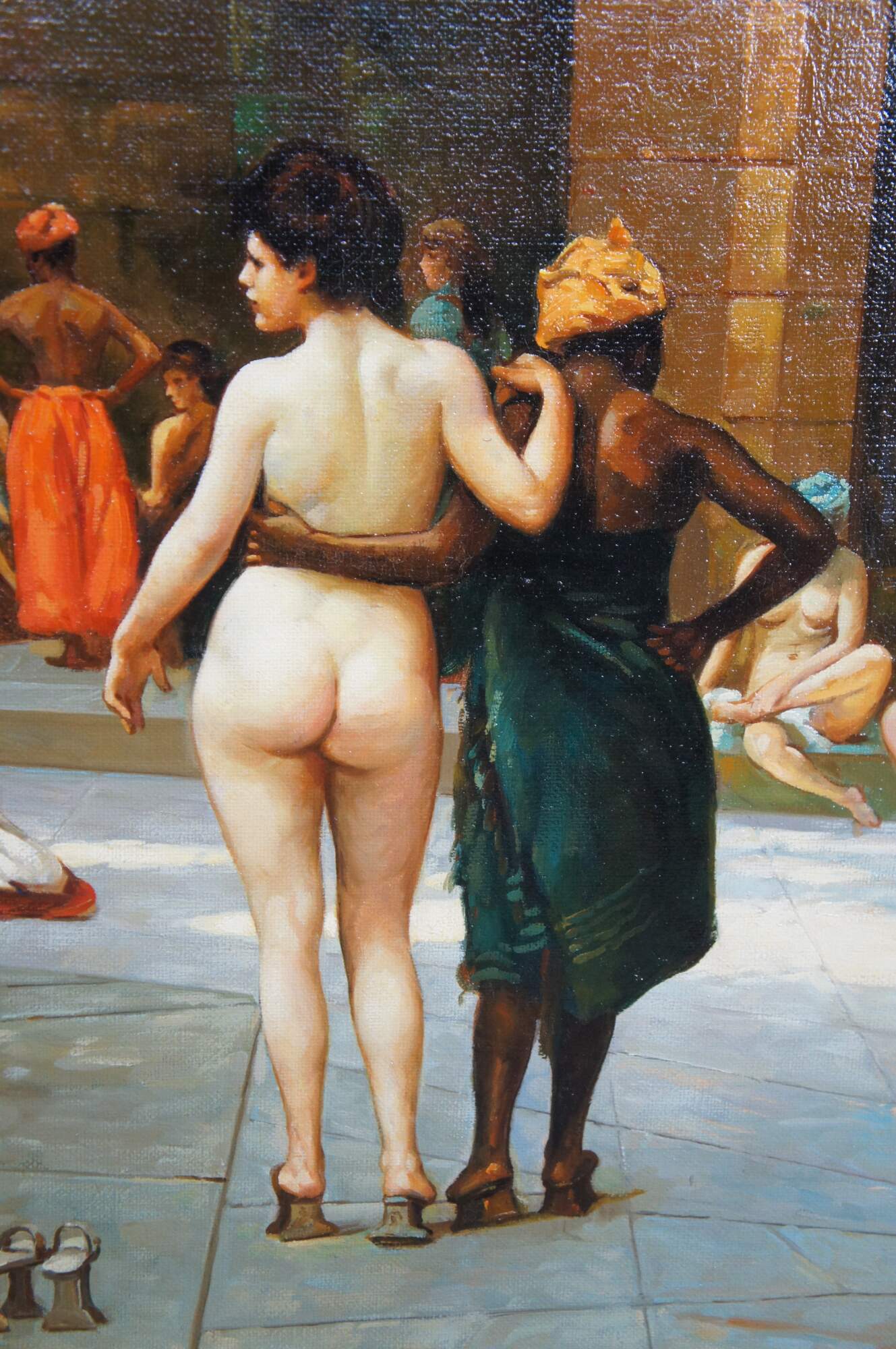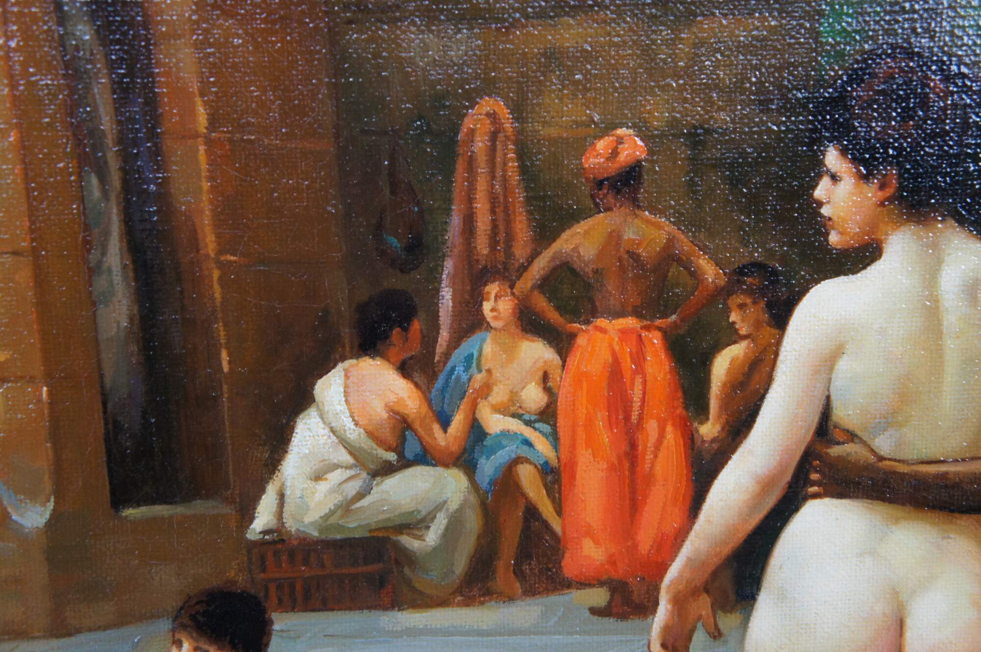 Late 20th Century painting after Jean Leon Geromes "Great Bath at Bursa" in 1885. The Great Pool of Brousse is a painting by the French painter Jean-Léon Gérôme in 1885. This orientalist oil on canvas depicts naked women inside public baths in Bursa, today in Turkey . Exhibited at the Salon of 1885, it is now kept in a private collection. The painting is framed in wood with a gold finish.