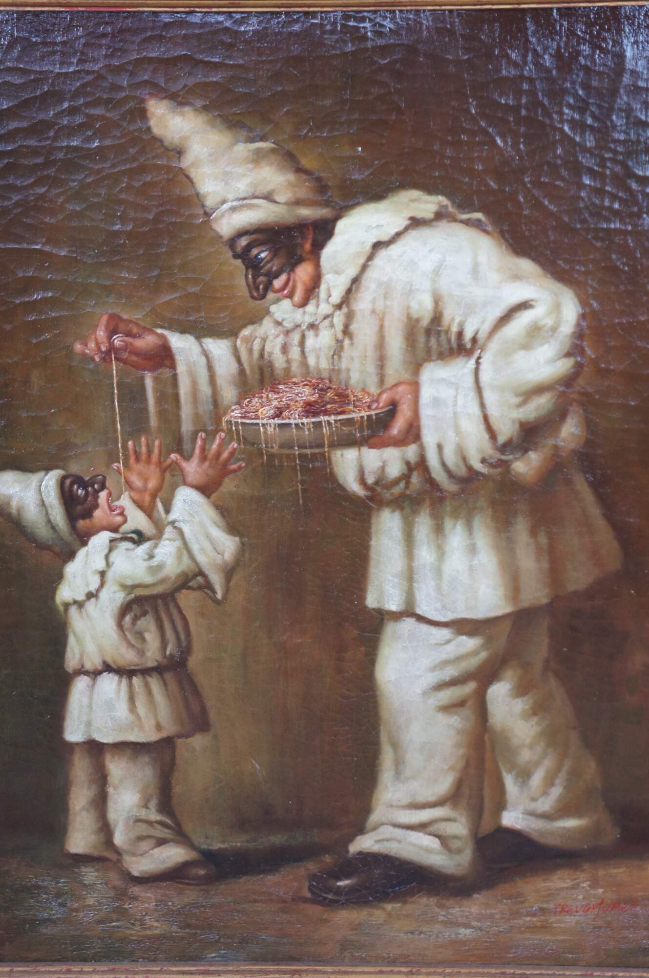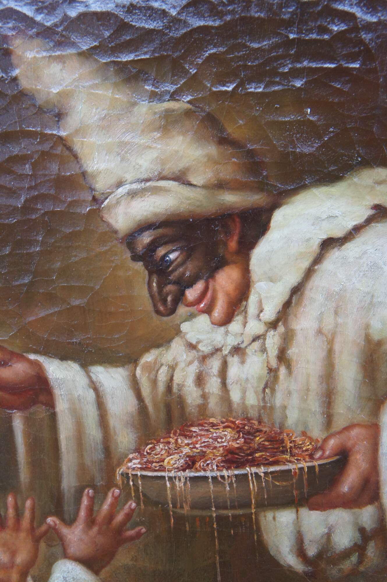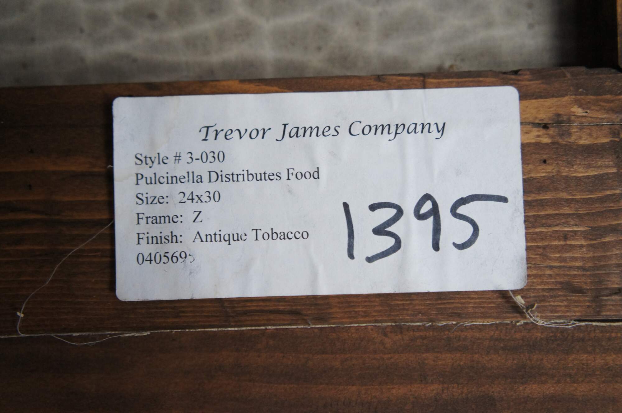 Pulcinella Feeding or Distributing Pasta After an Original by Michele Cammarano. The original was painted in the 19th Century. This reproduction hand painted oil comes from the second part of the 20th century. The painting is signed lower right Trevor James. Framed in pine with an antique finish.