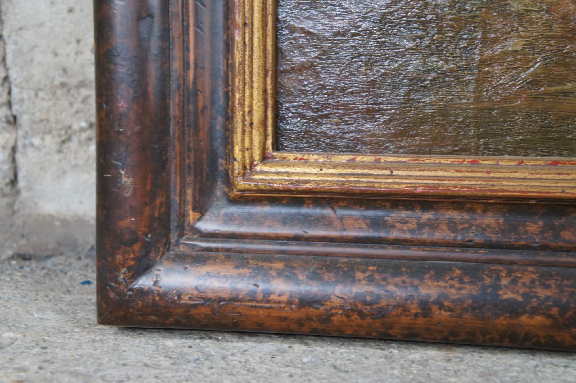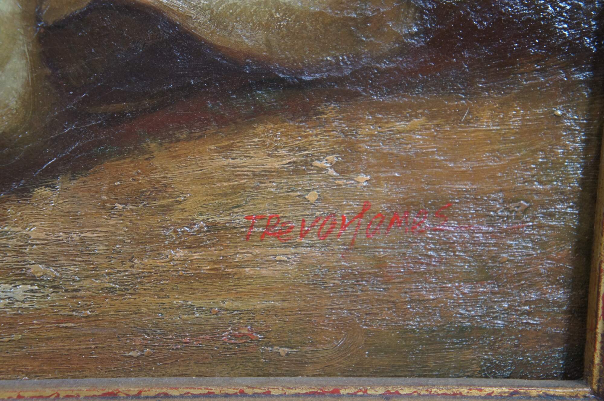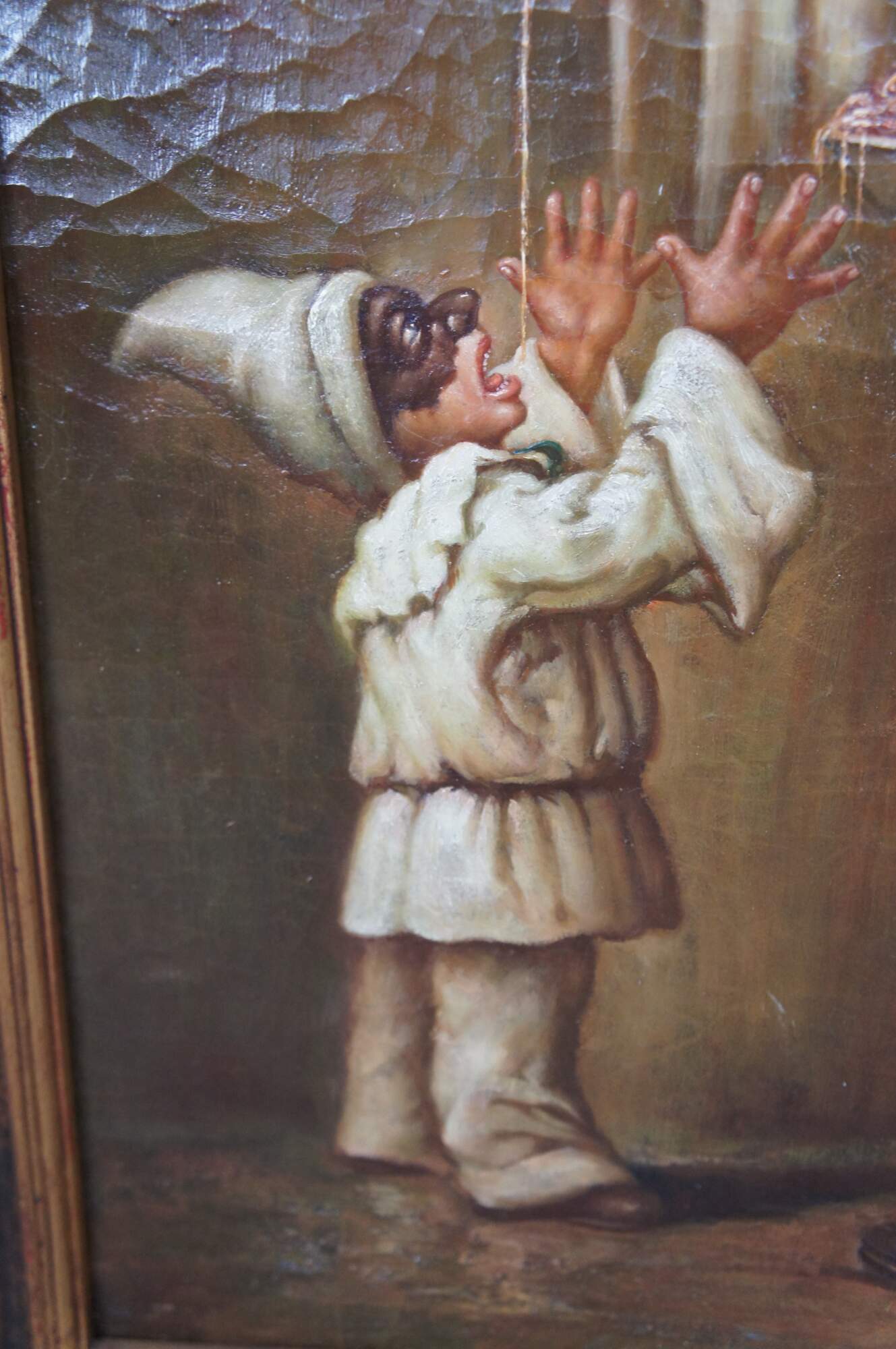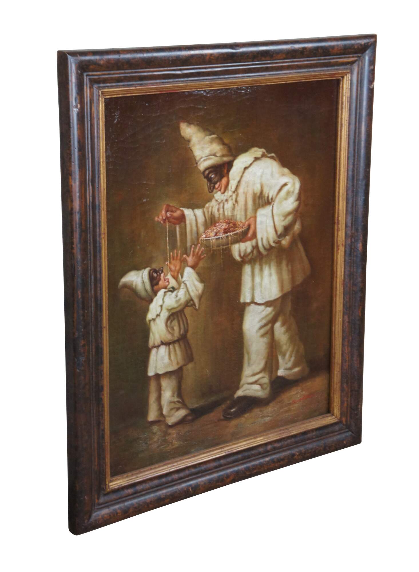 Pulcinella Feeding or Distributing Pasta After an Original by Michele Cammarano. The original was painted in the 19th Century. This reproduction hand painted oil comes from the second part of the 20th century. The painting is signed lower right Trevor James. Framed in pine with an antique finish.