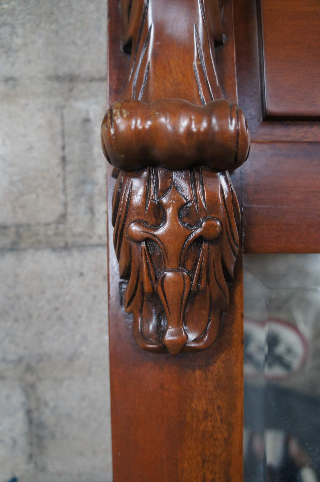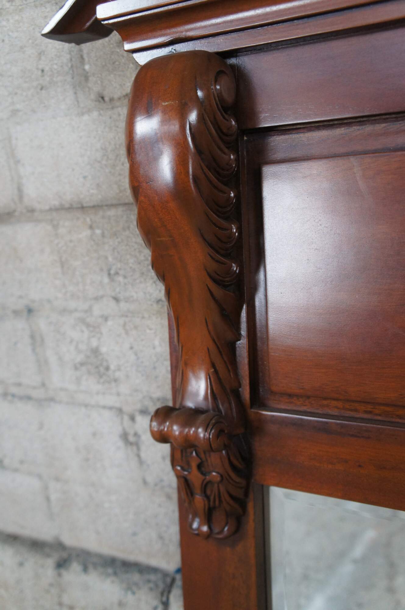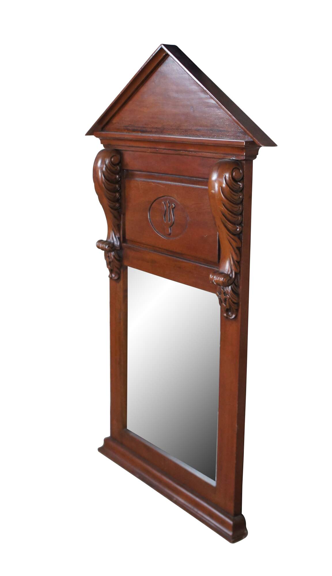 American Classical Empire style Pediment Mirror, circa last quarter 20th century. Features a mahogany frame with an arched pediment over acanthus carved spandrels set around a trident panel and beveled glass plate mirror. Hangs along the back via wire. Great for use along a wall, in a bathroom as a vanity, or as an over mantel above the fireplace.