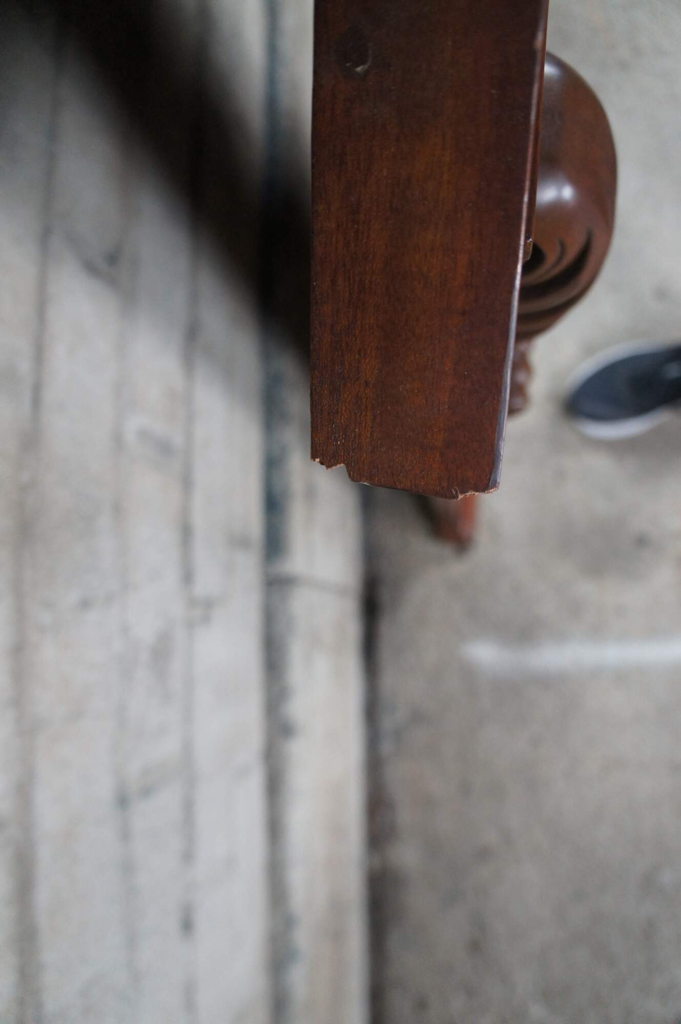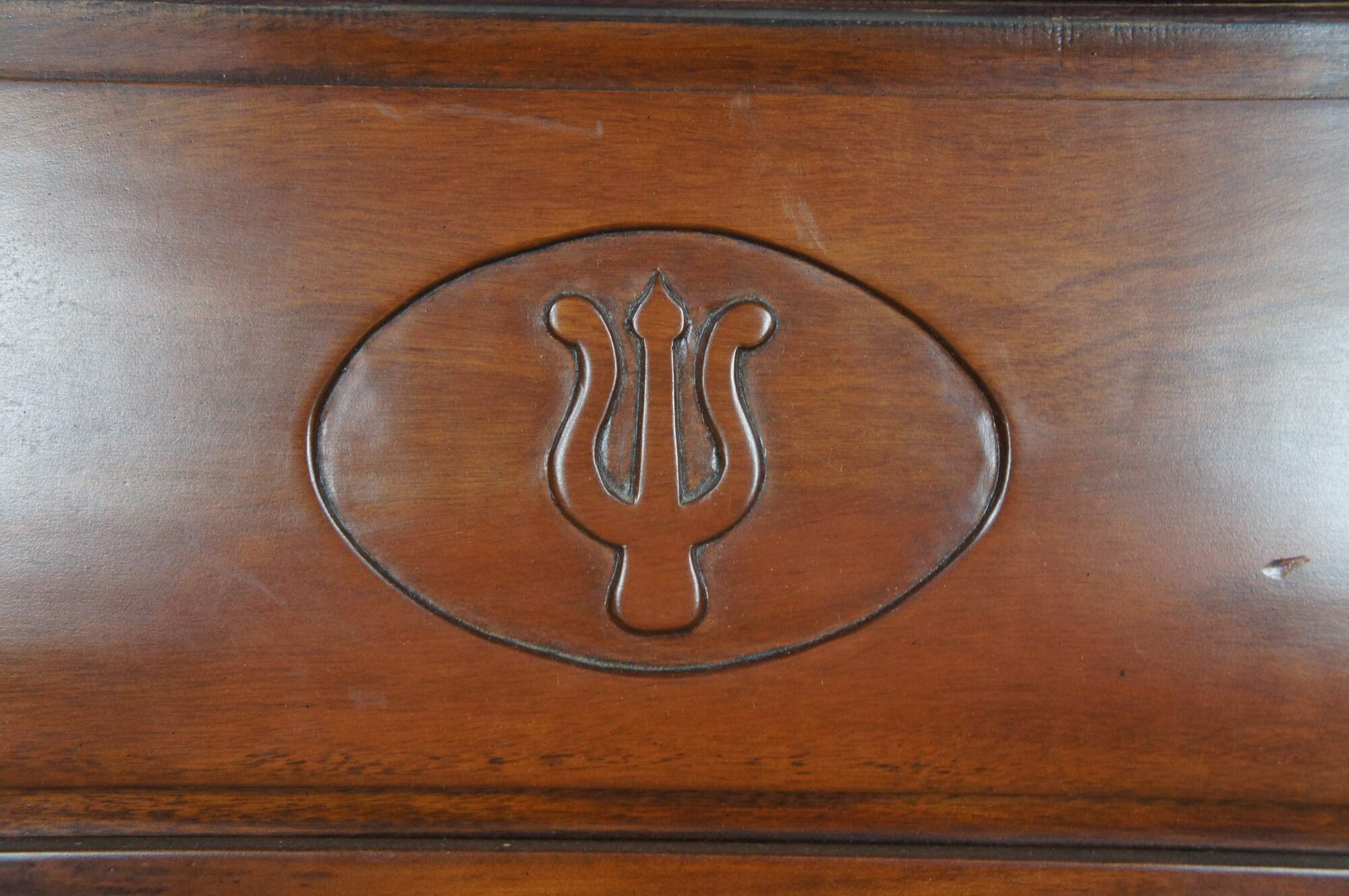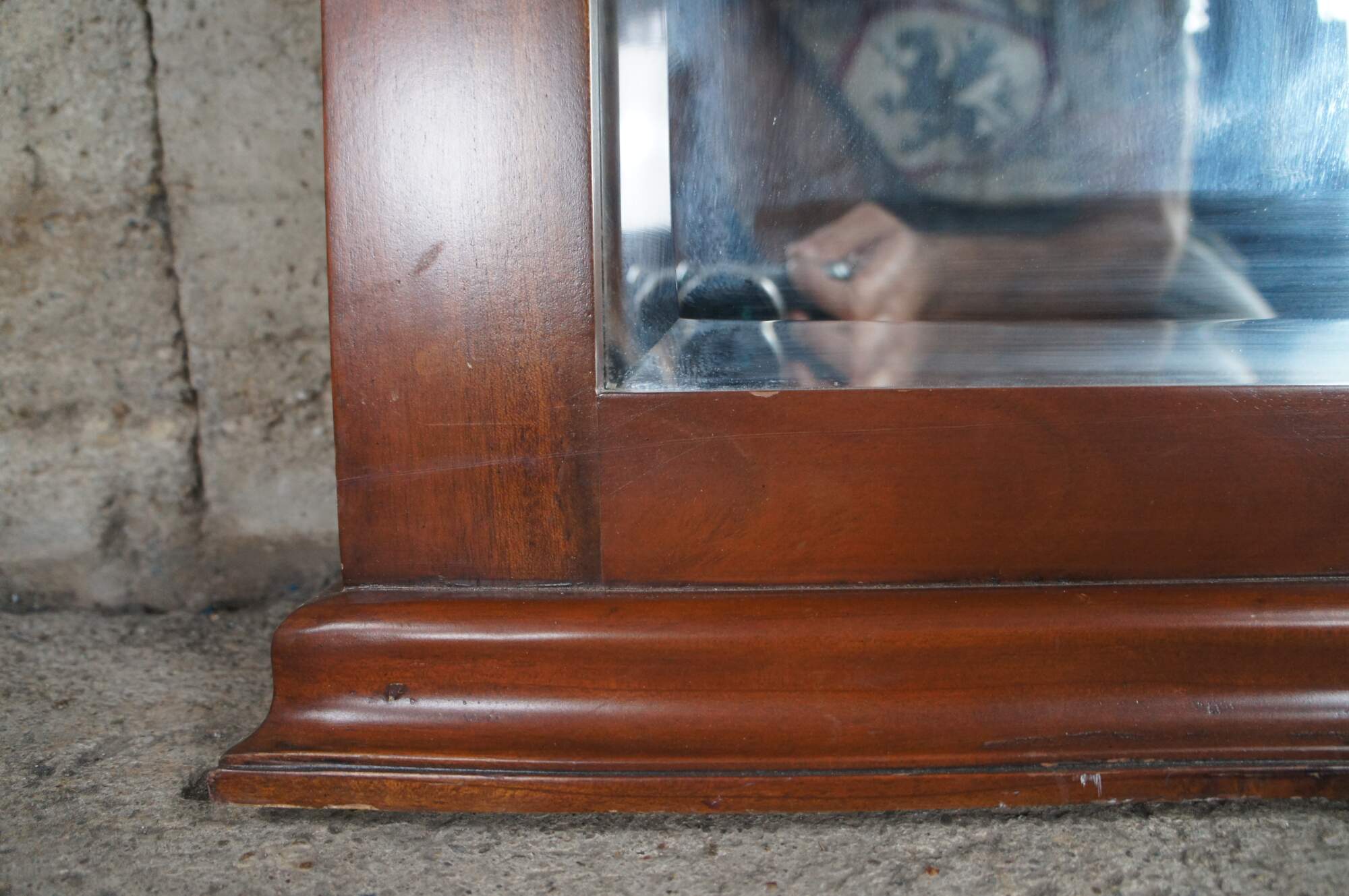 American Classical Empire style Pediment Mirror, circa last quarter 20th century. Features a mahogany frame with an arched pediment over acanthus carved spandrels set around a trident panel and beveled glass plate mirror. Hangs along the back via wire. Great for use along a wall, in a bathroom as a vanity, or as an over mantel above the fireplace.
