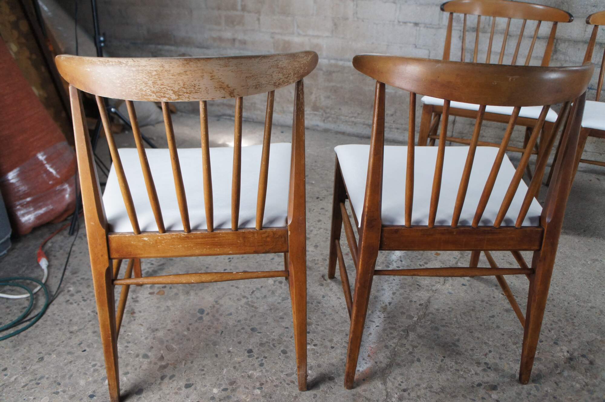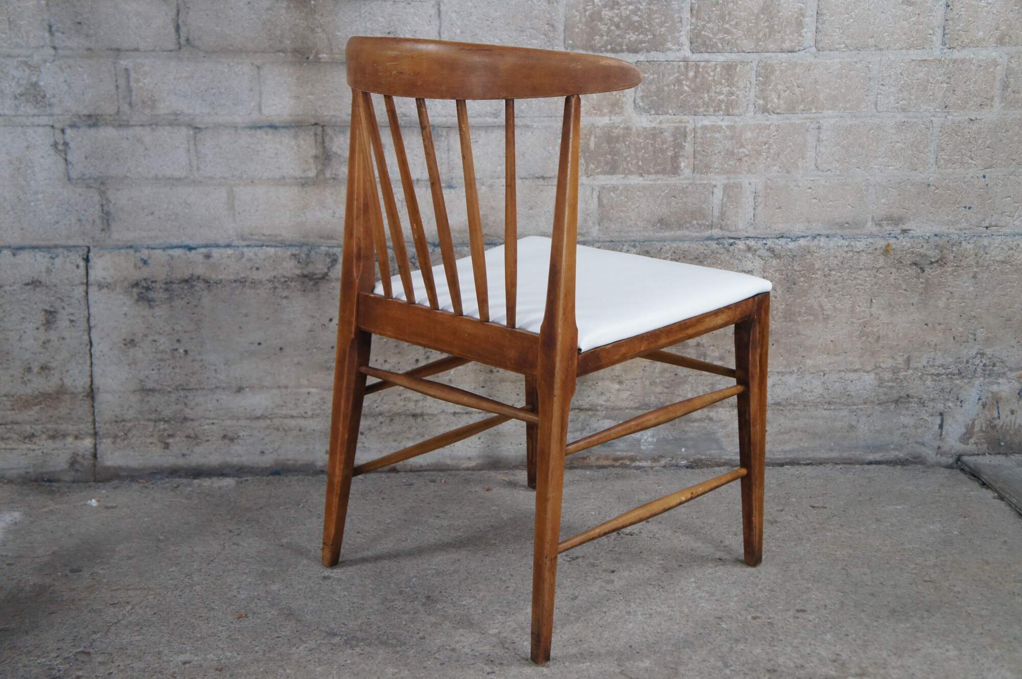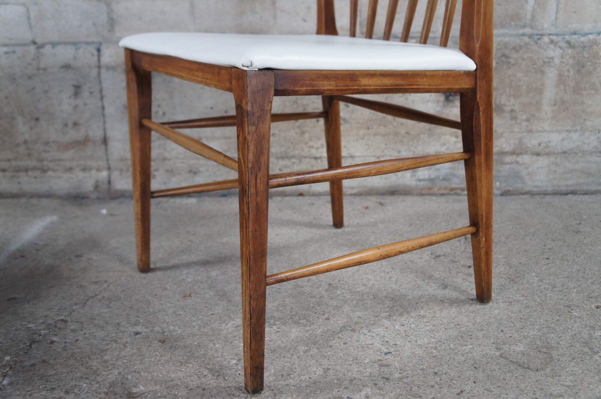 Set of four mid century modern dining chairs by Heywood Wakefield. Made of solid birch with dark topaz finish featuring wide form with rounded slat back and tapered legs.