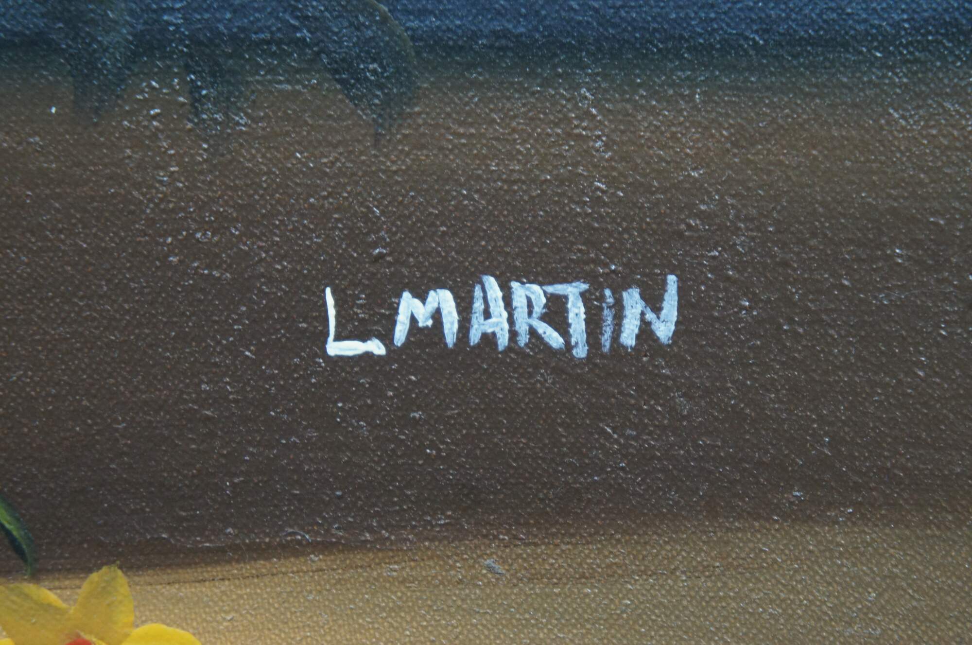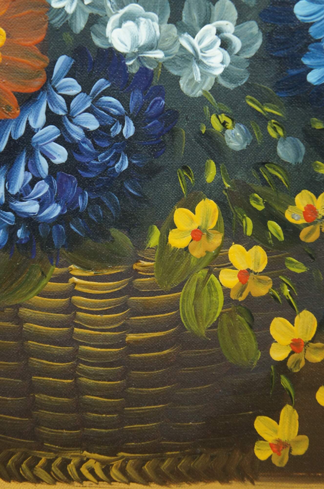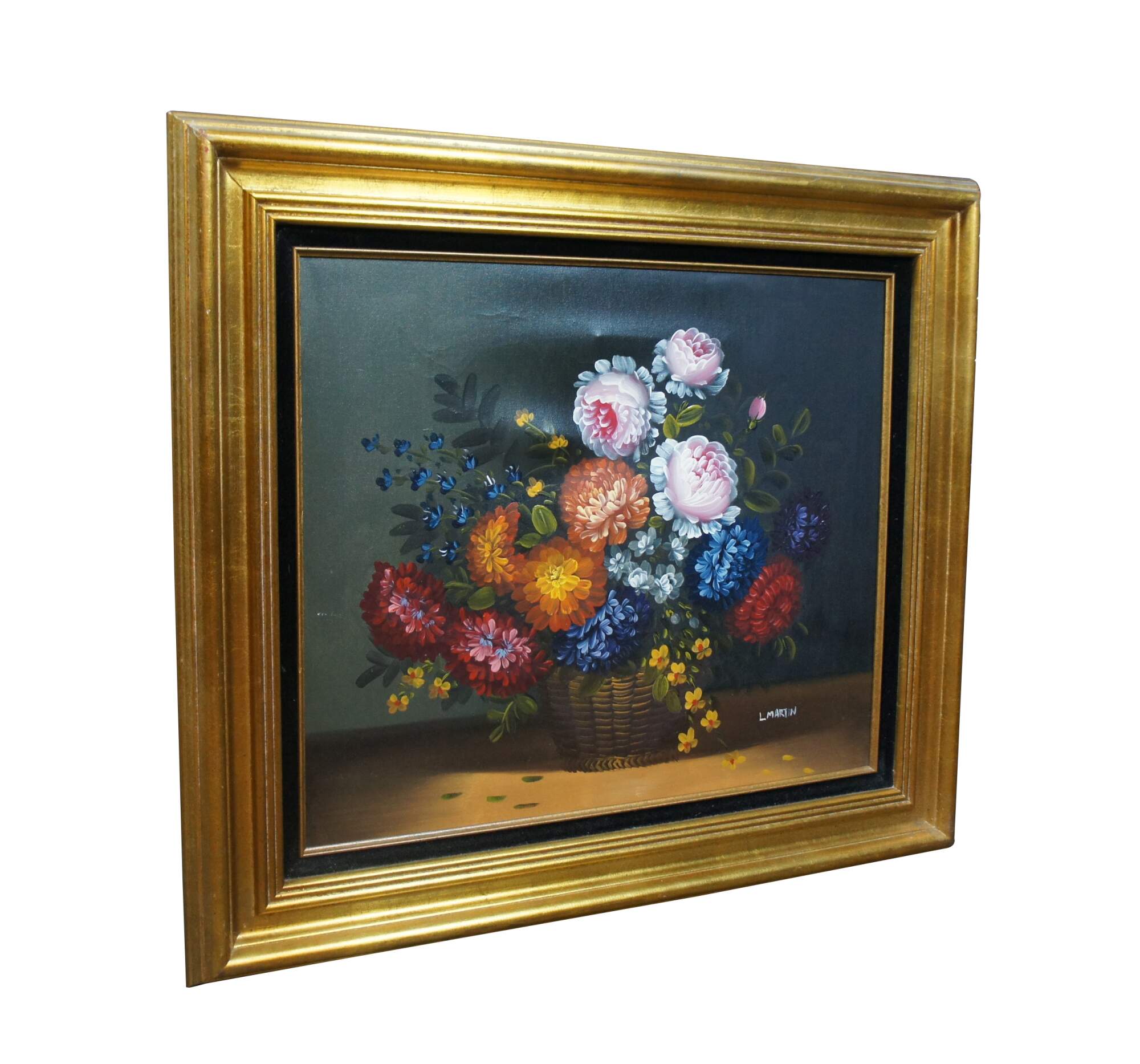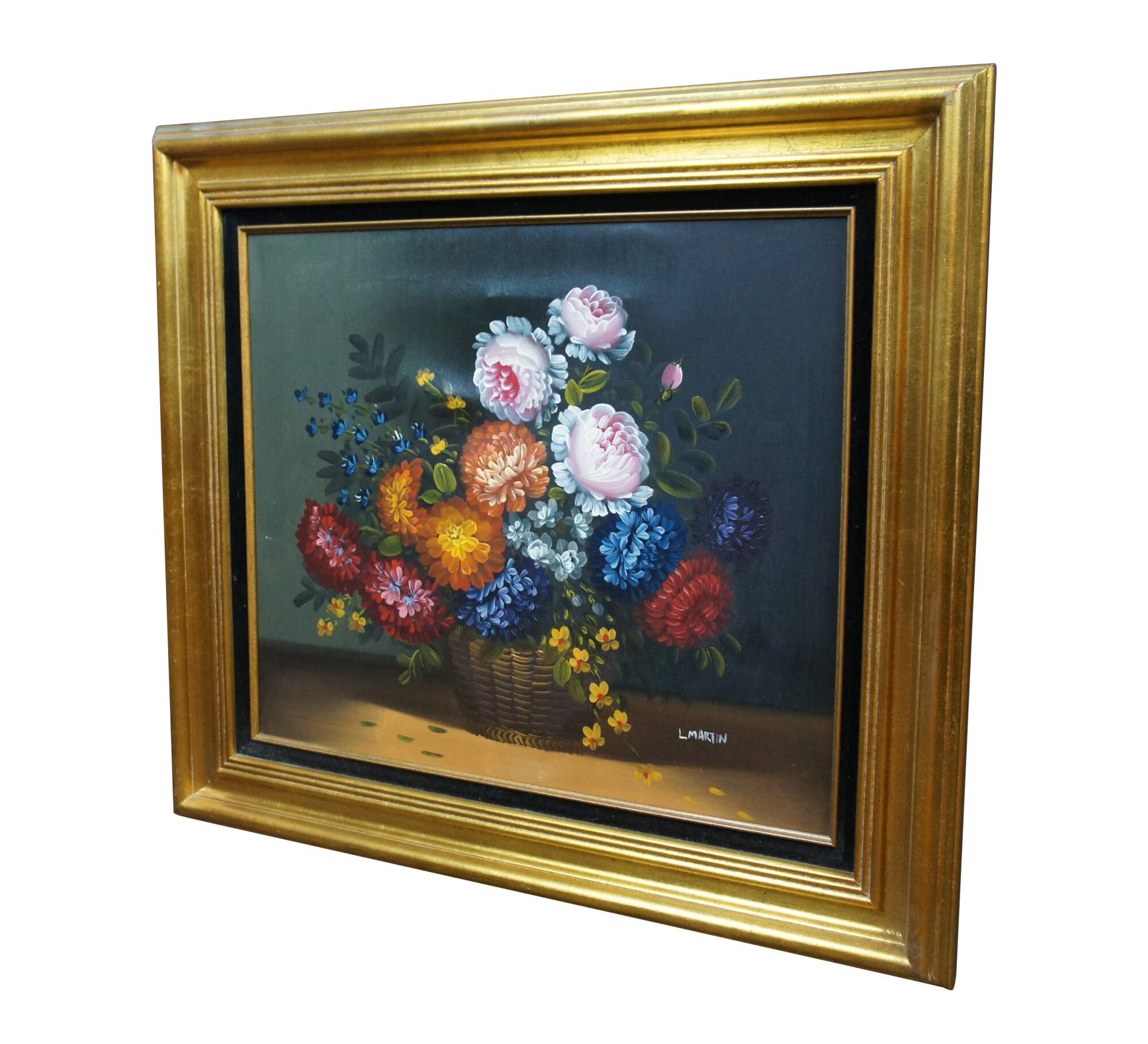 Late 20th century still life oil on canvas painting by L. Martin. Depicts a bouquet of bright multi-colored flowers in a basket vase. Signed in lower right. Artistic Interiors Inc - Certification Number 345163. Beveled giltwood frame with black velvet mat / border.