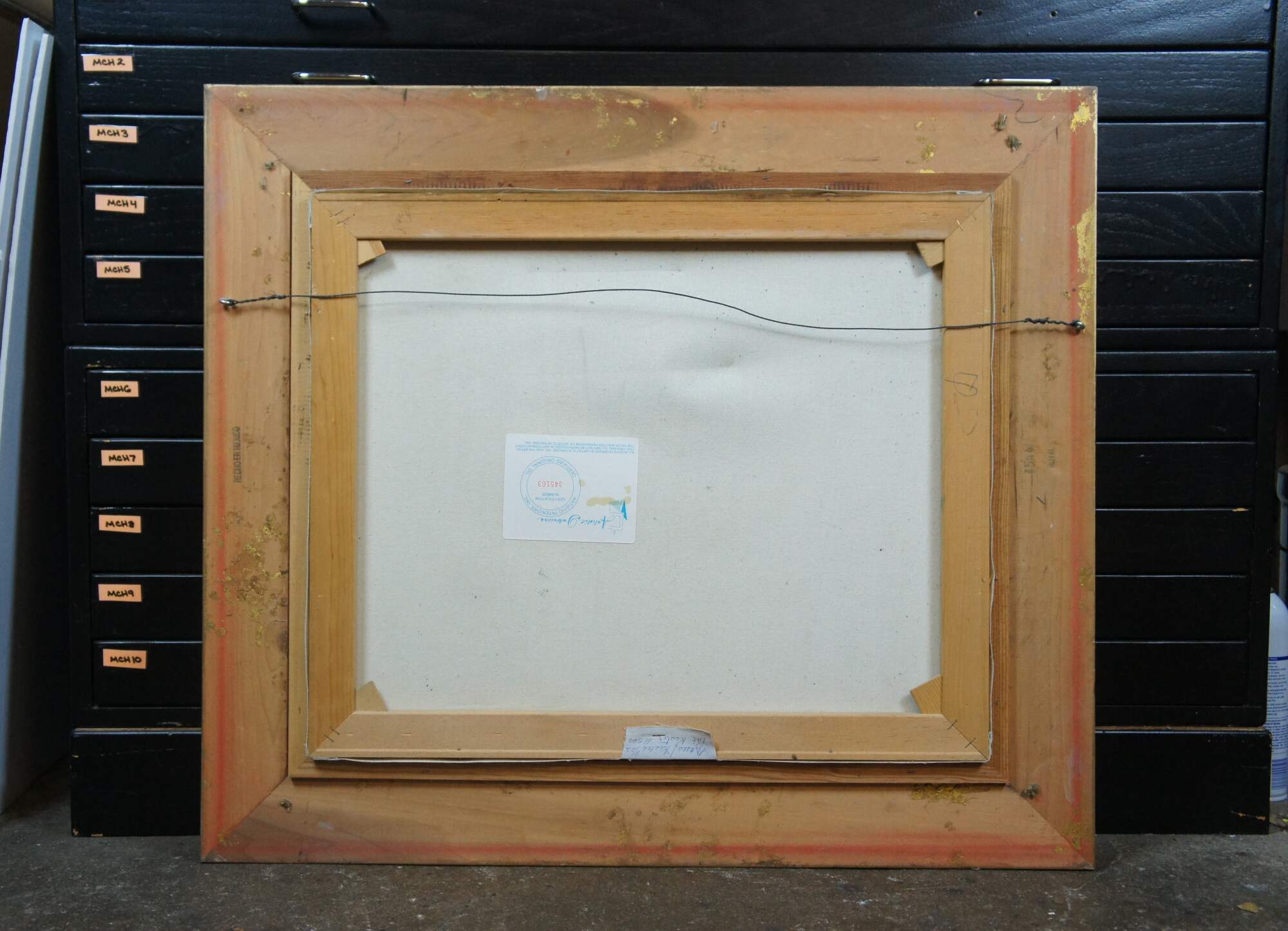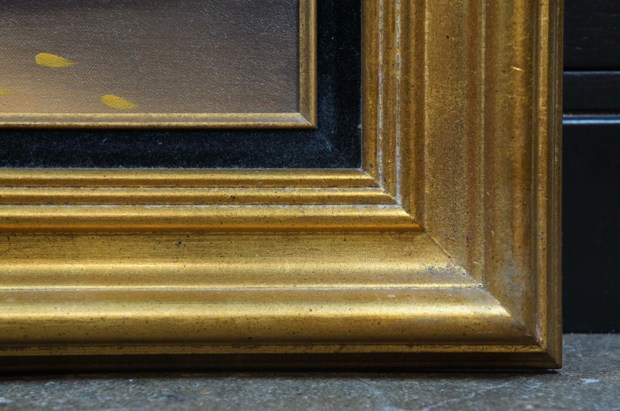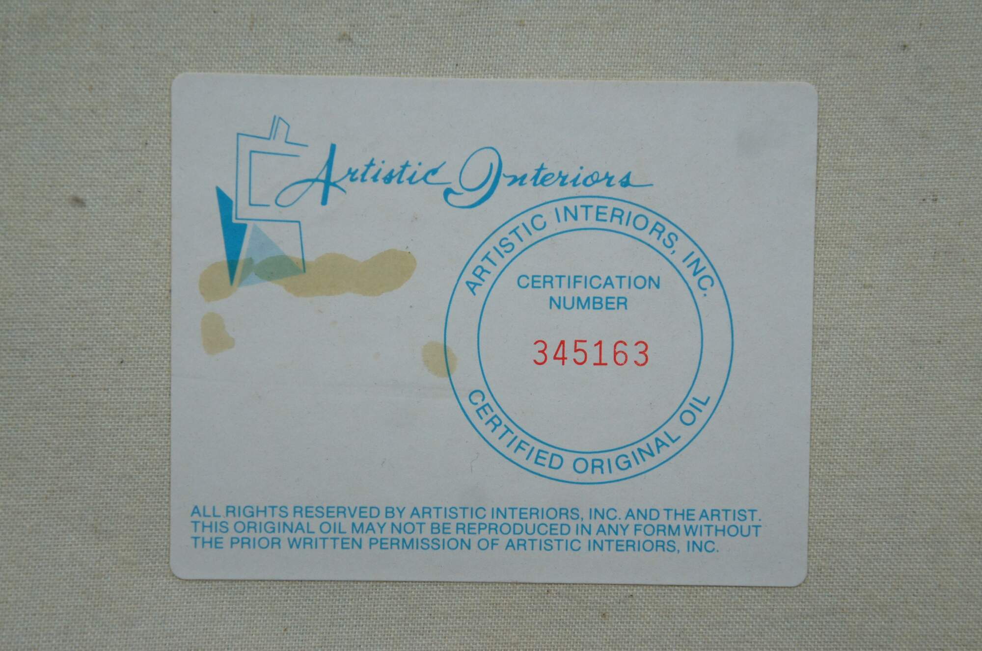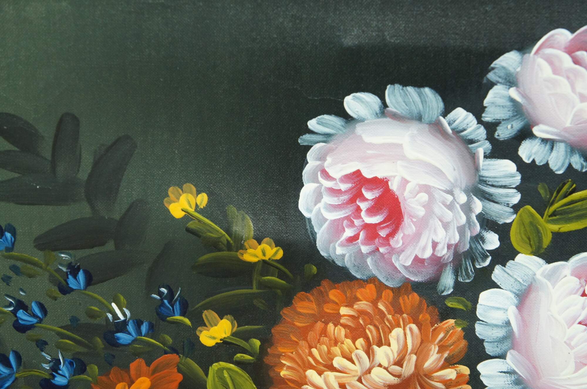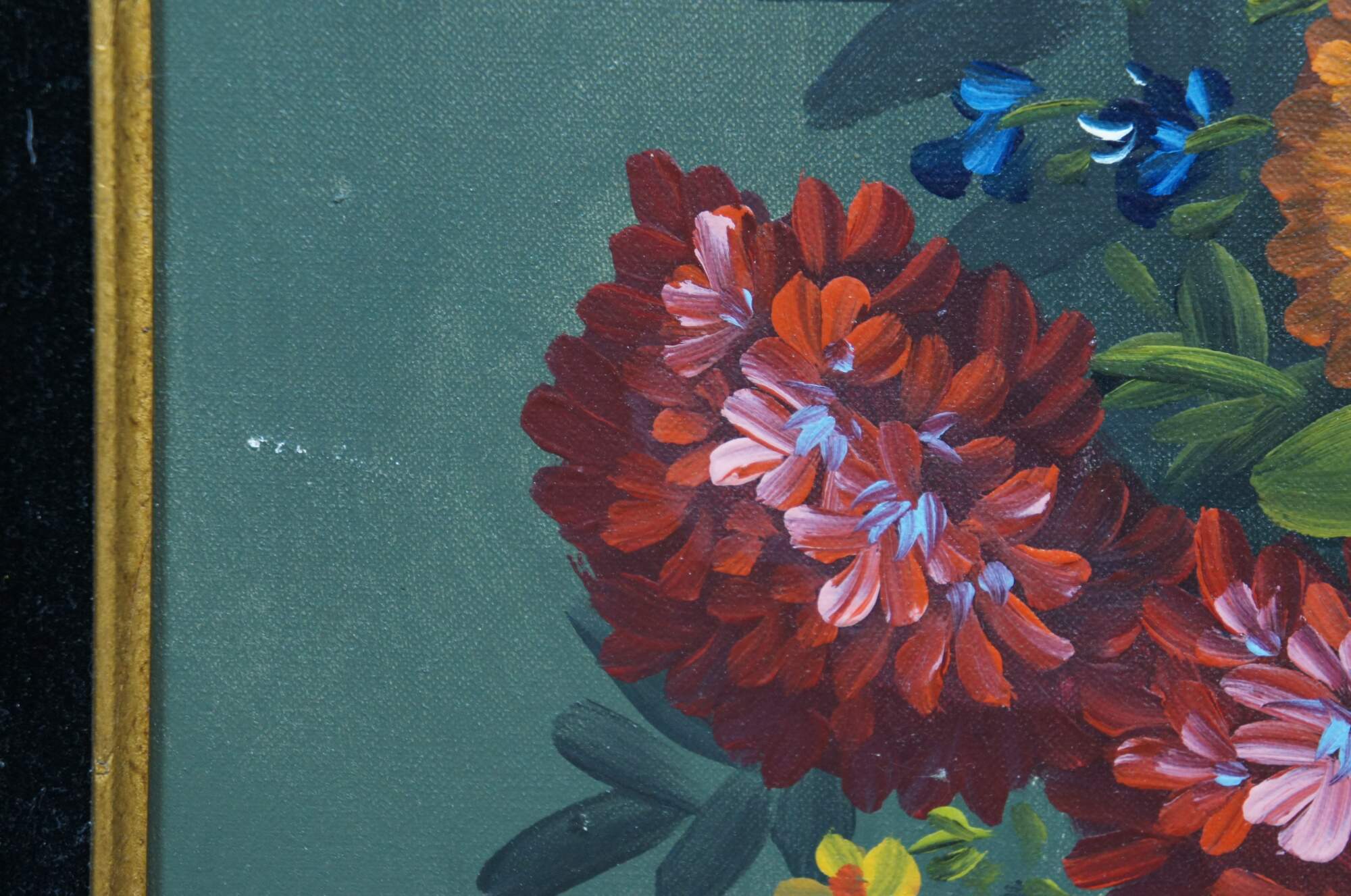 Late 20th century still life oil on canvas painting by L. Martin. Depicts a bouquet of bright multi-colored flowers in a basket vase. Signed in lower right. Artistic Interiors Inc - Certification Number 345163. Beveled giltwood frame with black velvet mat / border.