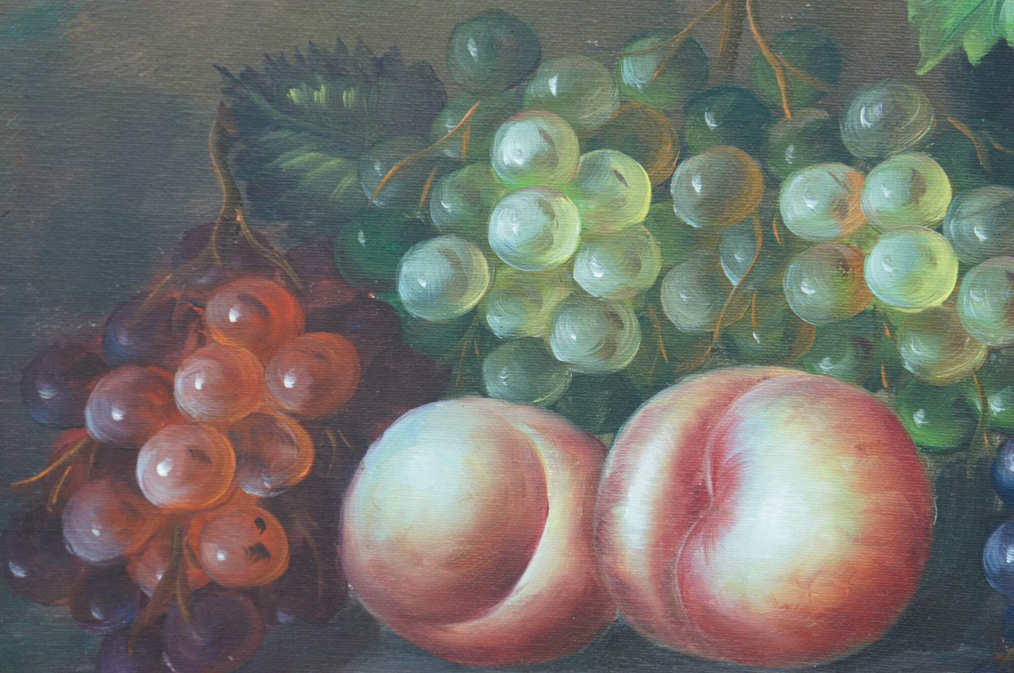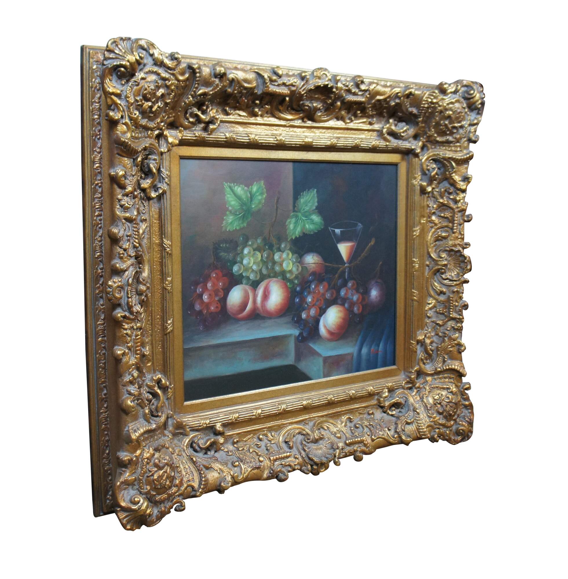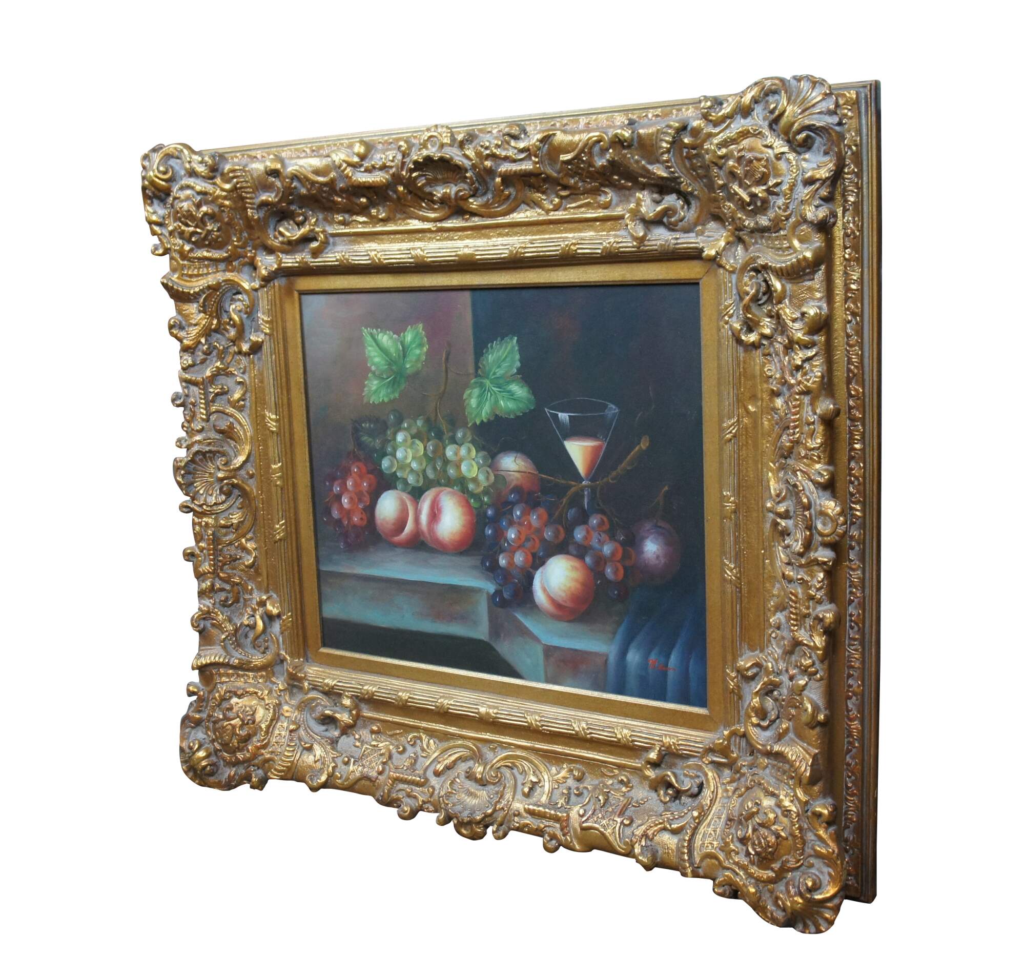 Late 20th century oil on canvas still life painting by M. Aaron. Depicts bunches of grapes, peaches, and a glass of wine / martini arranged on a stone ledge. Signed in lower right. Heavily carved ornate giltwood frame featuring foliates, scallops, and fleur de lis at the corners.