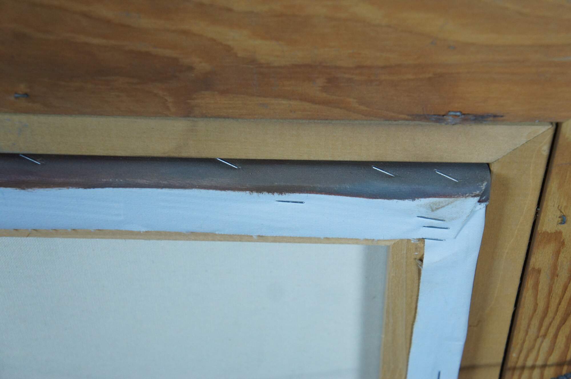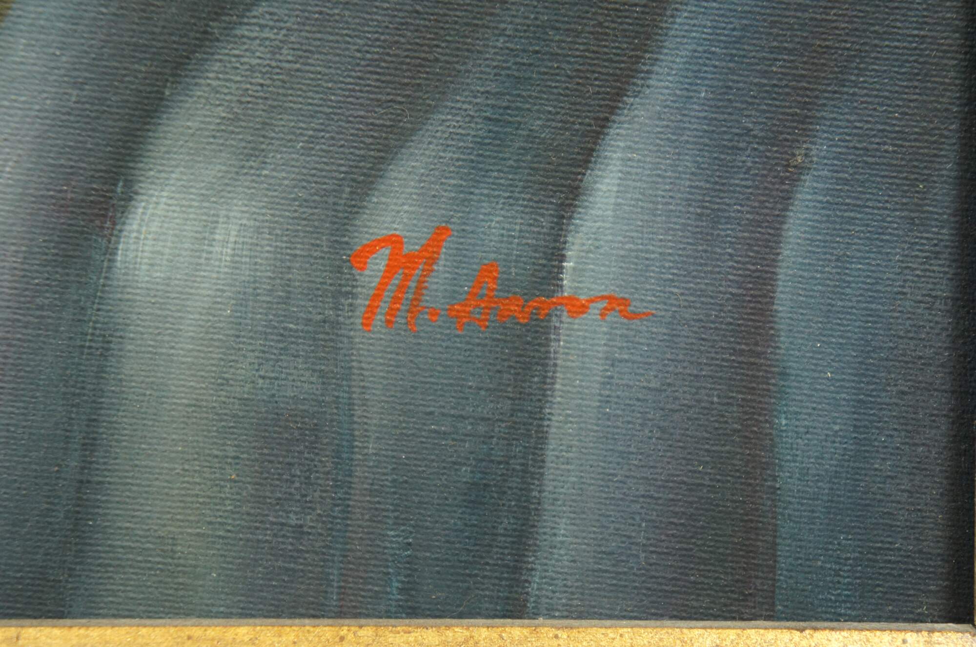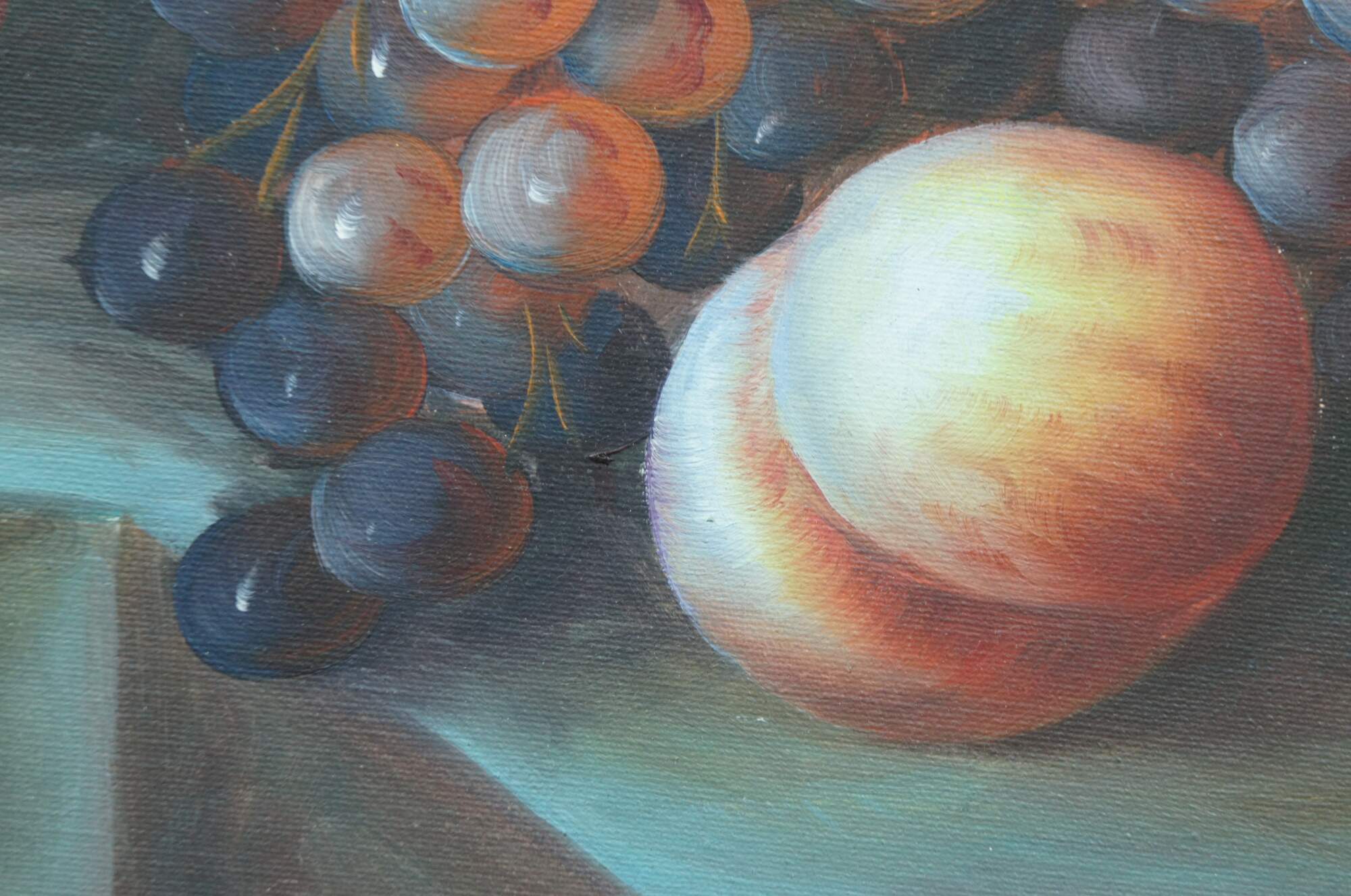 Late 20th century oil on canvas still life painting by M. Aaron. Depicts bunches of grapes, peaches, and a glass of wine / martini arranged on a stone ledge. Signed in lower right. Heavily carved ornate giltwood frame featuring foliates, scallops, and fleur de lis at the corners.