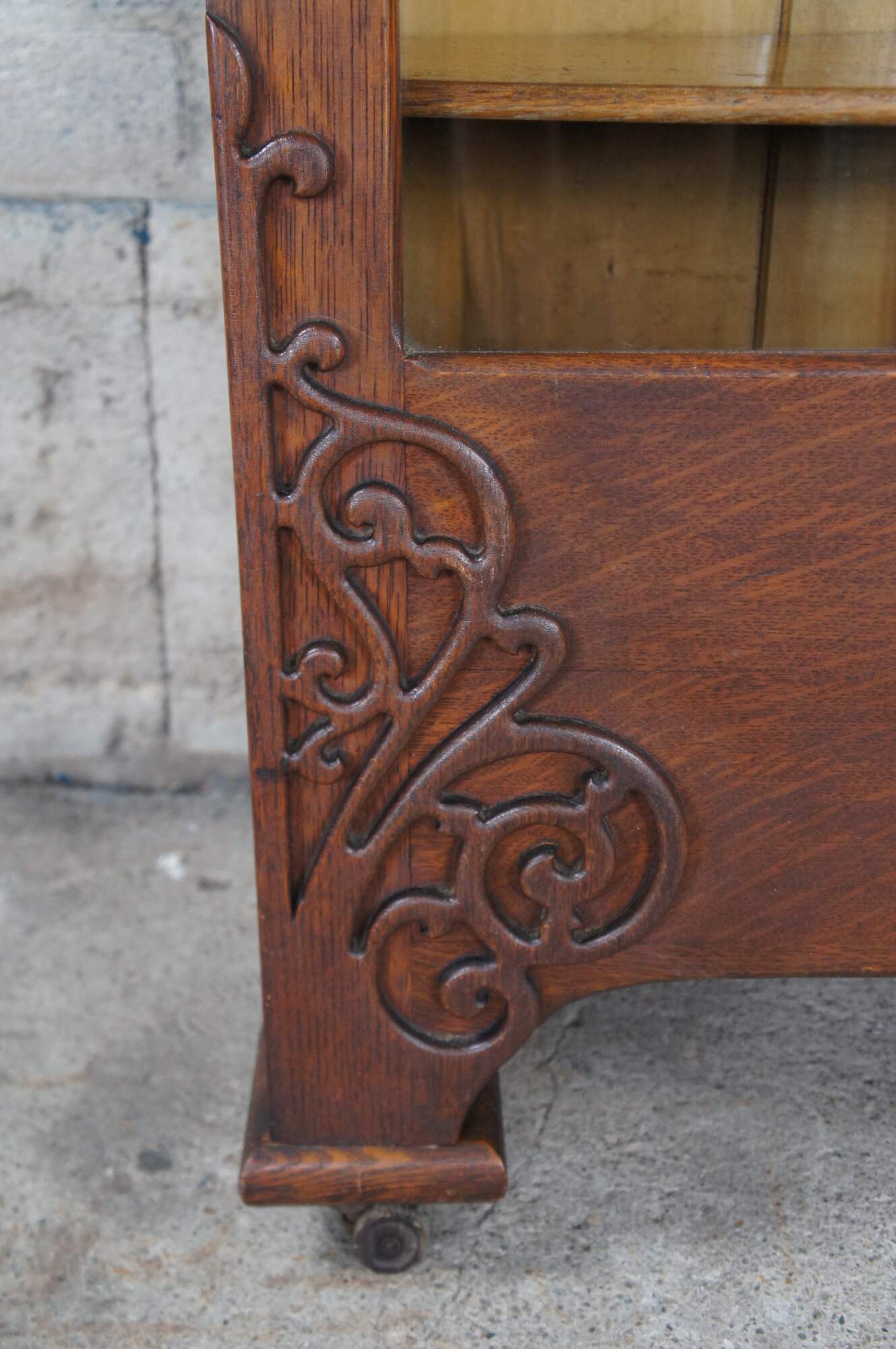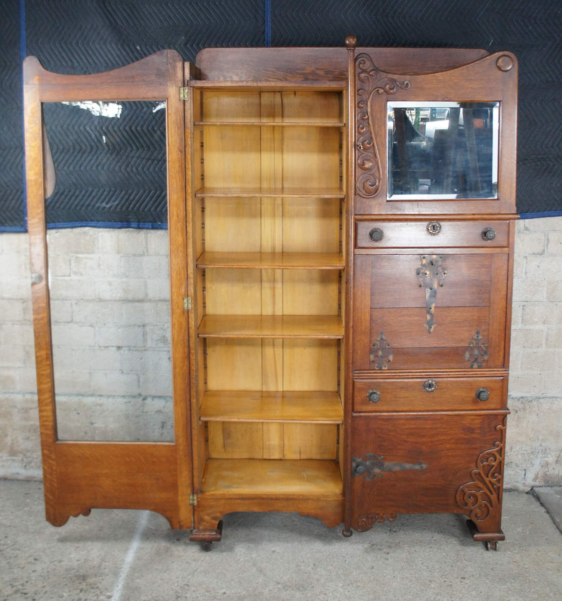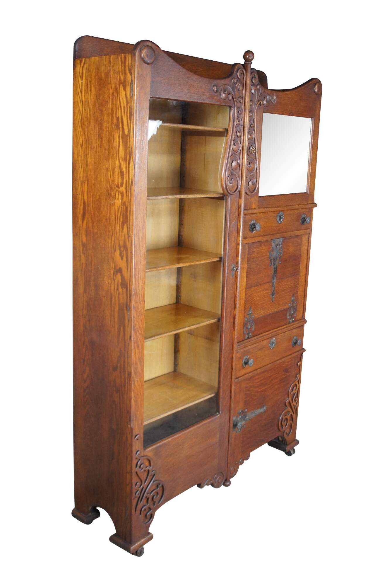 Antique Victorian side by side secretary desk and curio bookcase. Made of quartersawn oak featuring Art Nouveau styling with carved floral and acanthus fretwork accents over a glass front curio cabinet flanking a drop front secretary that opens to writing surface with multiple cubbies and a drawer. Above the secretary there is a beveled mirror opens for additional storage, as well as a lower drawer and cabinet adorned with iron hardware.