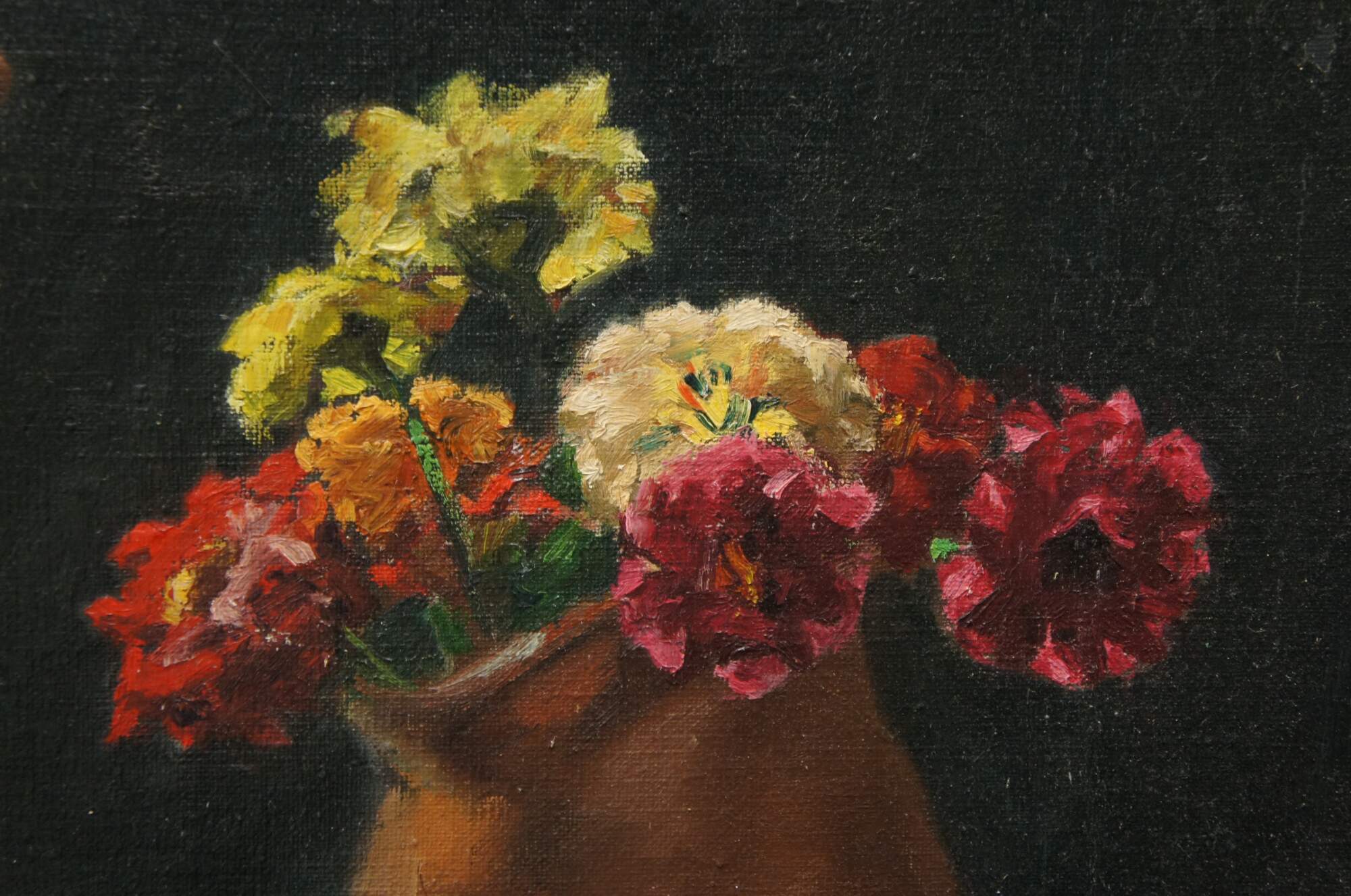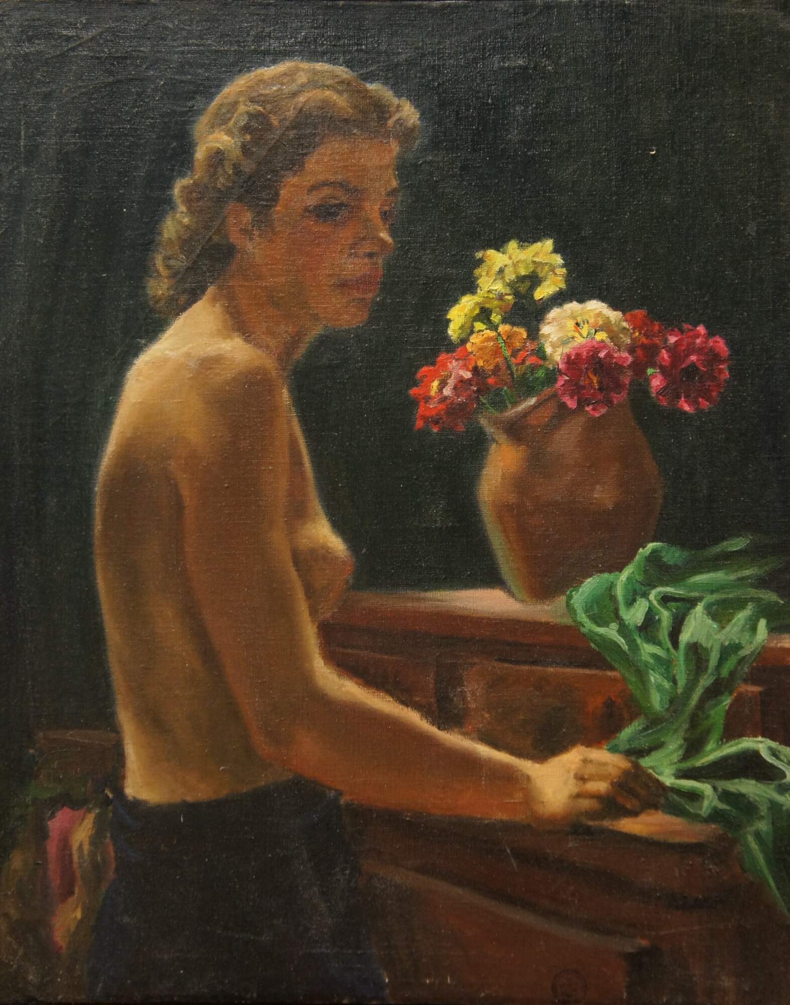 Mid century oil painting on canvas depicting a brown haired topless female figure pulling a green shirt off a wooden dresser topped with a vase of flowers. Stamp on lower edge: "Estate Stamp - Dorothy Christy Cervantes - 1920-1987." Plain thin wood frame.