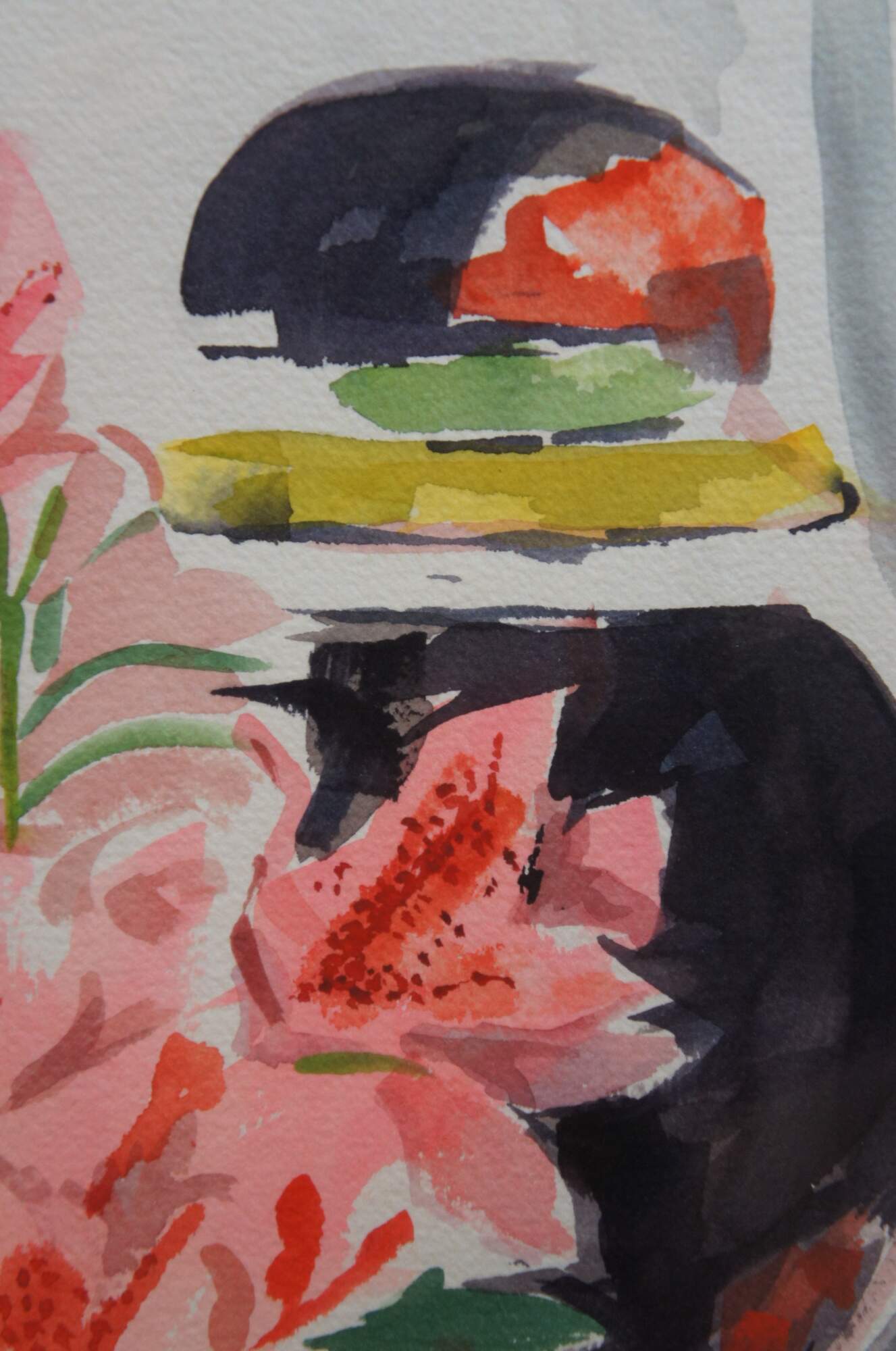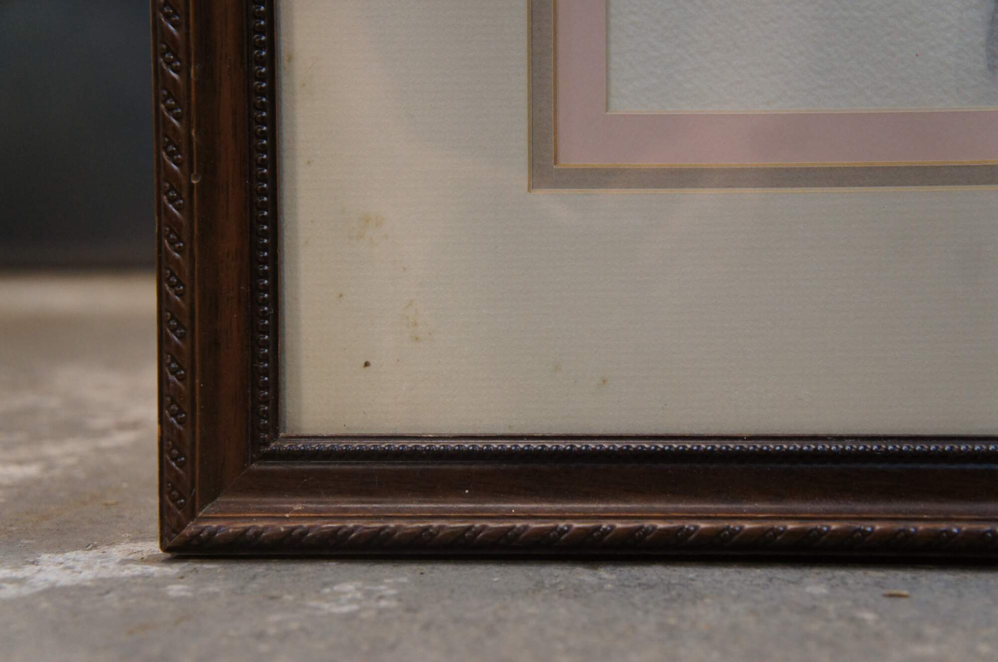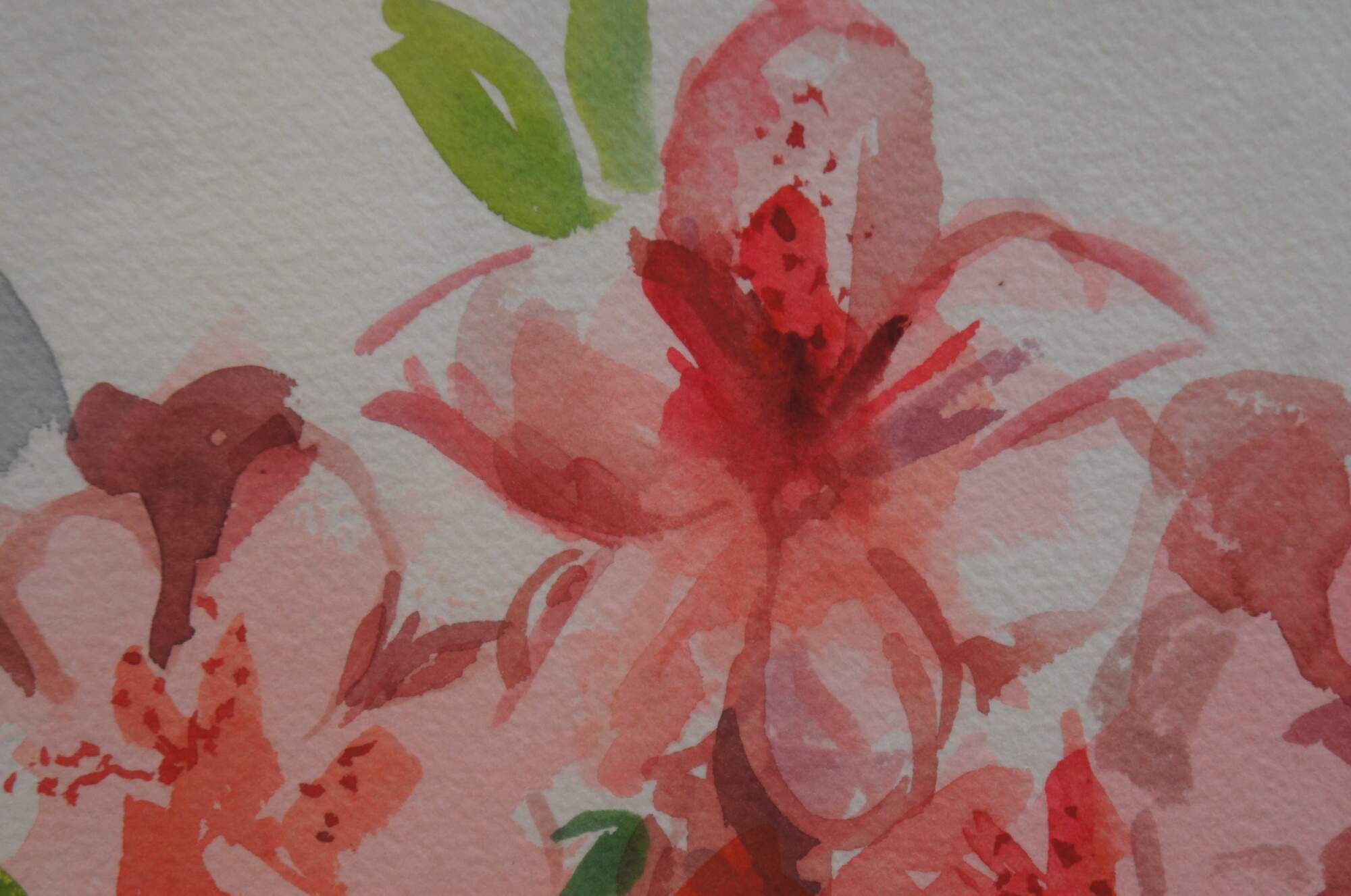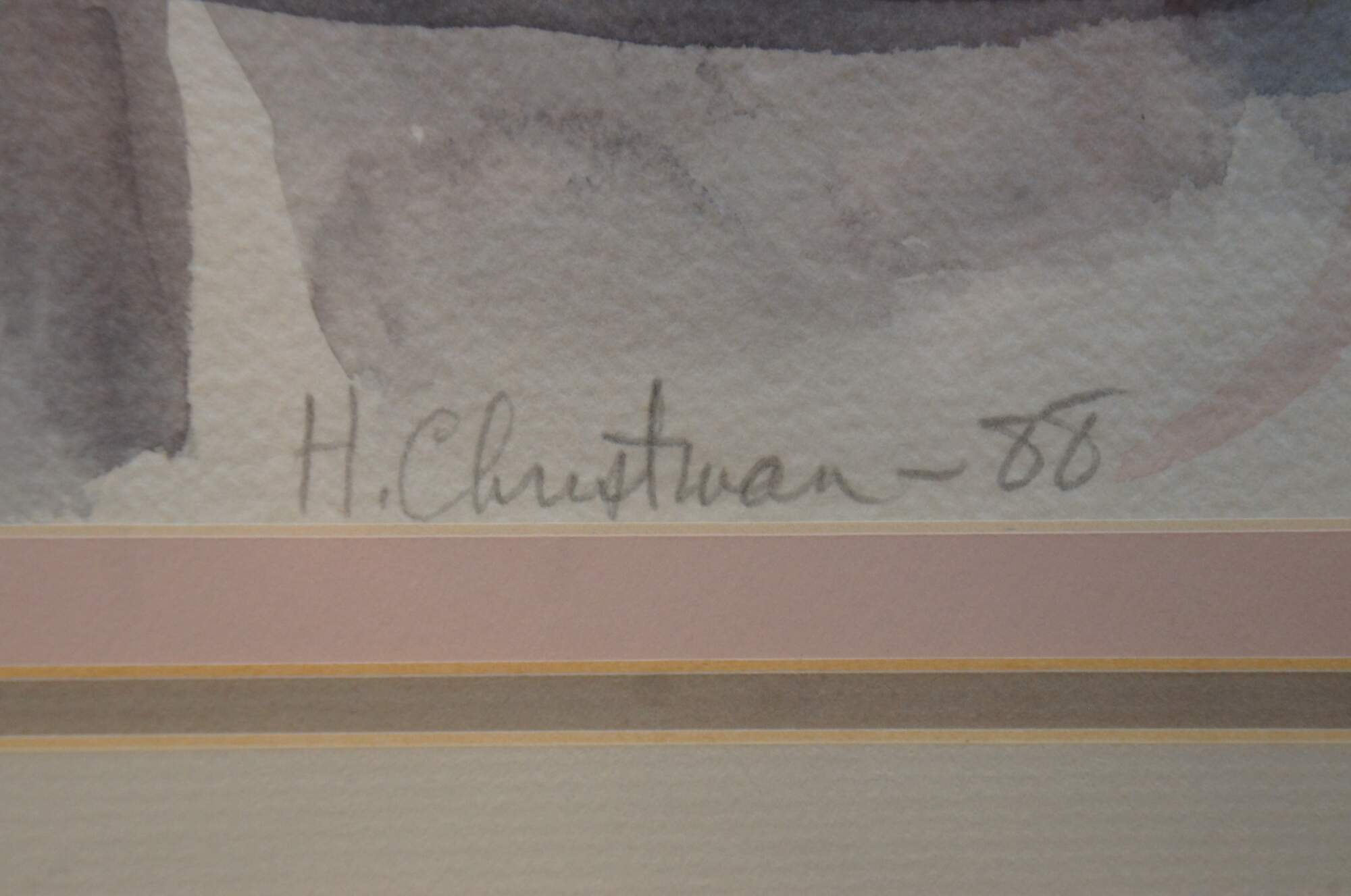 Vintage 1988 watercolor on paper still life painting by H. Christman. Depicts a bouquet of pink alstroemerias in a white vase with a red and black ginger jar in the background. Signed at lower right. Carved and beveled wood frame; off white, beige, and pink layered mat.