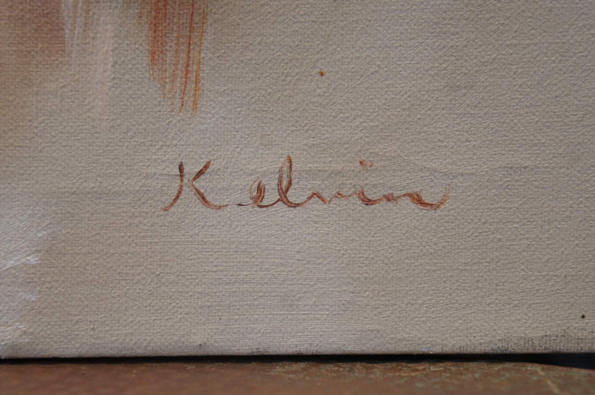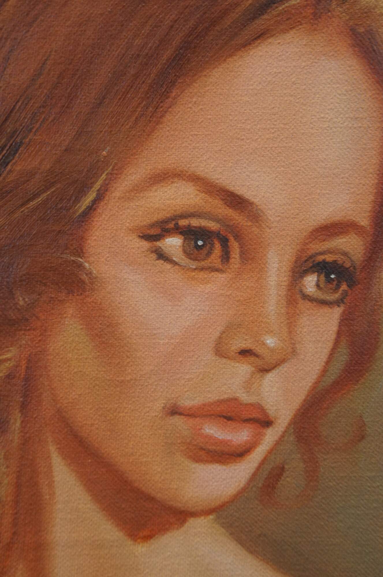 Vintage 20th century oil on canvas painting depicting a topless portrait of a nude woman with reddish blonde hair, signed Kelvin in lower right.