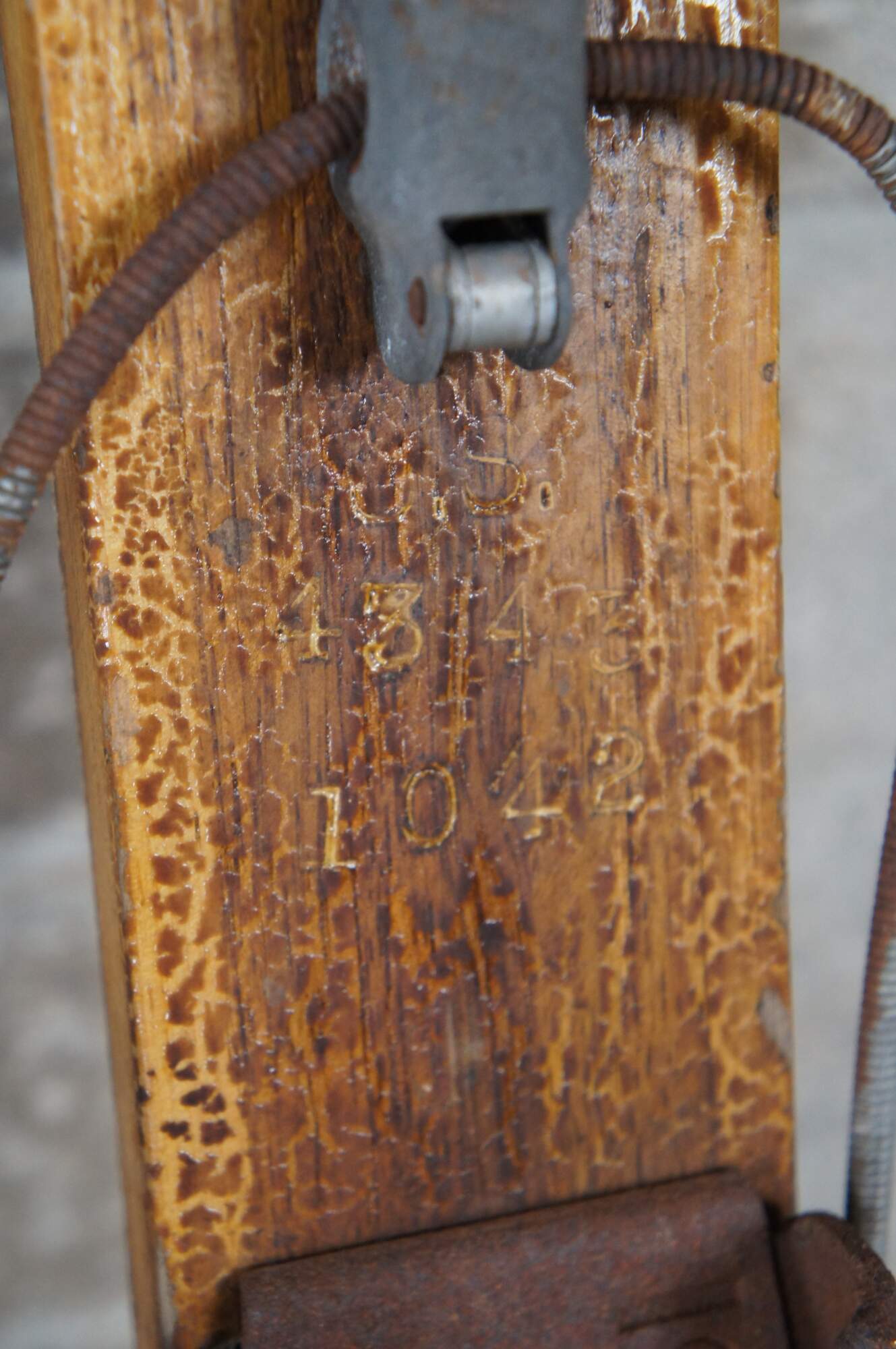 Antique RMC Paris Ski Company 10th mountain division military skis from WW II era, circa 1942. Made of oak featuring traditional form with metal bindings. Engraved with the name Bill Hardisty . The holes in the tips were typical of military skis, because they used them for lashing two skis together to make a sled for transport of supplies or bodies.