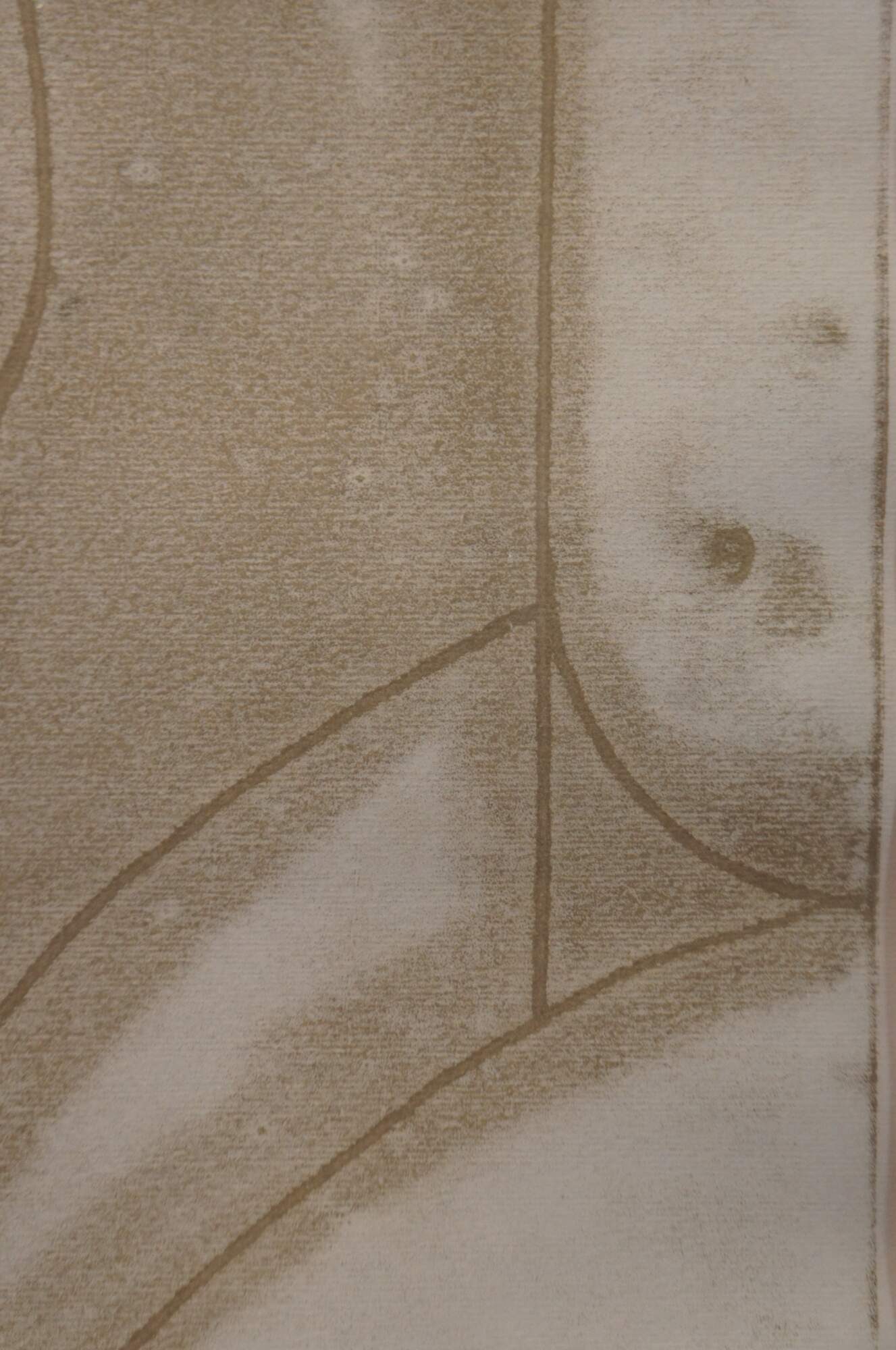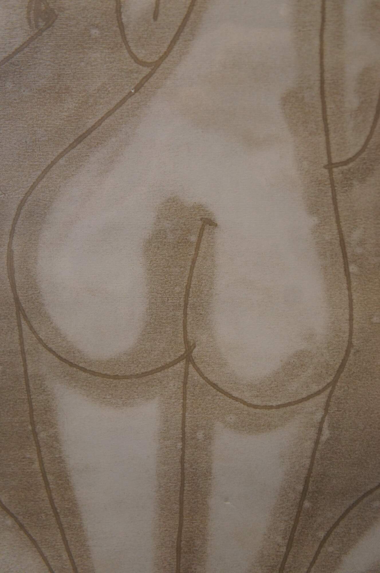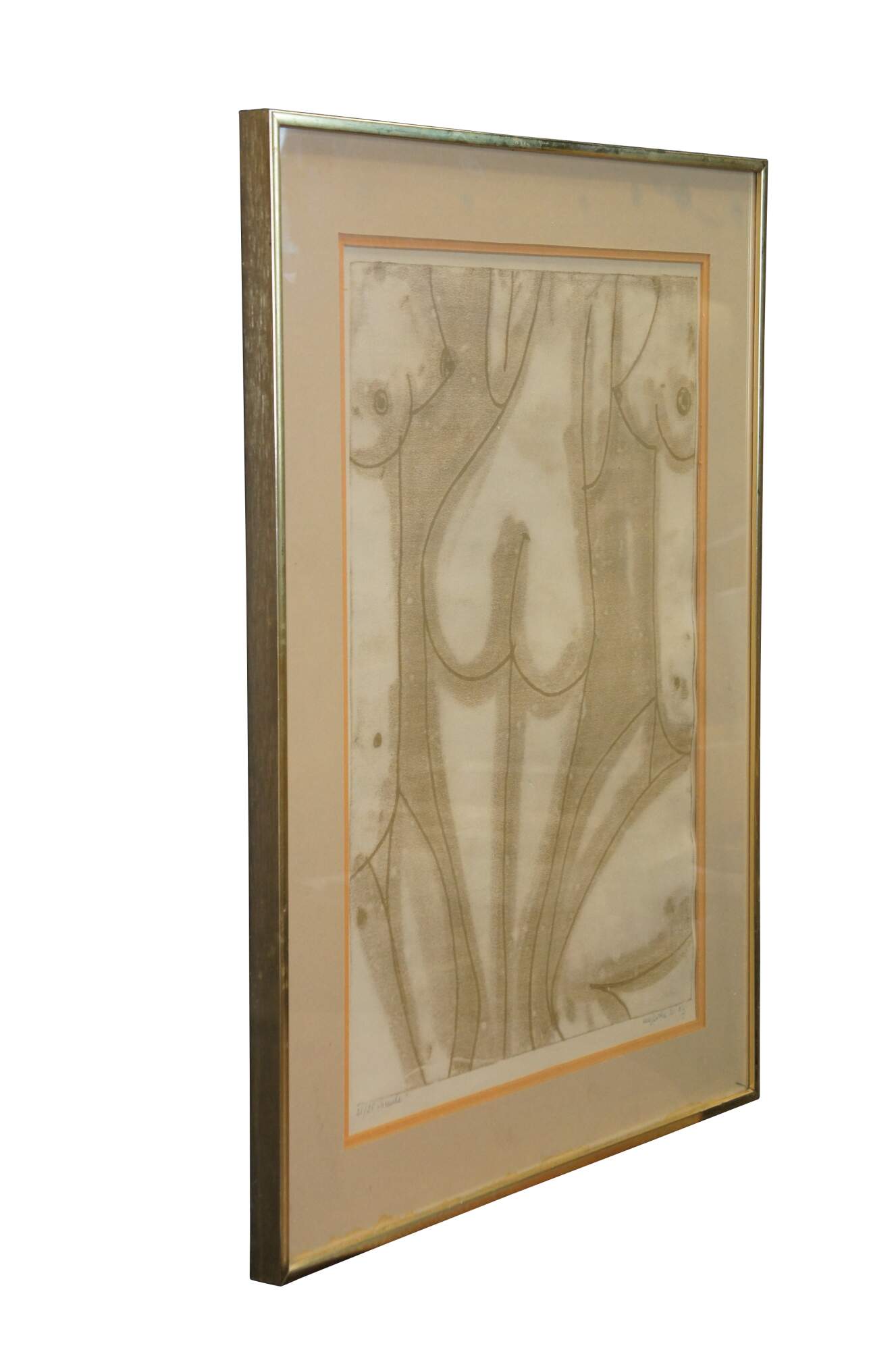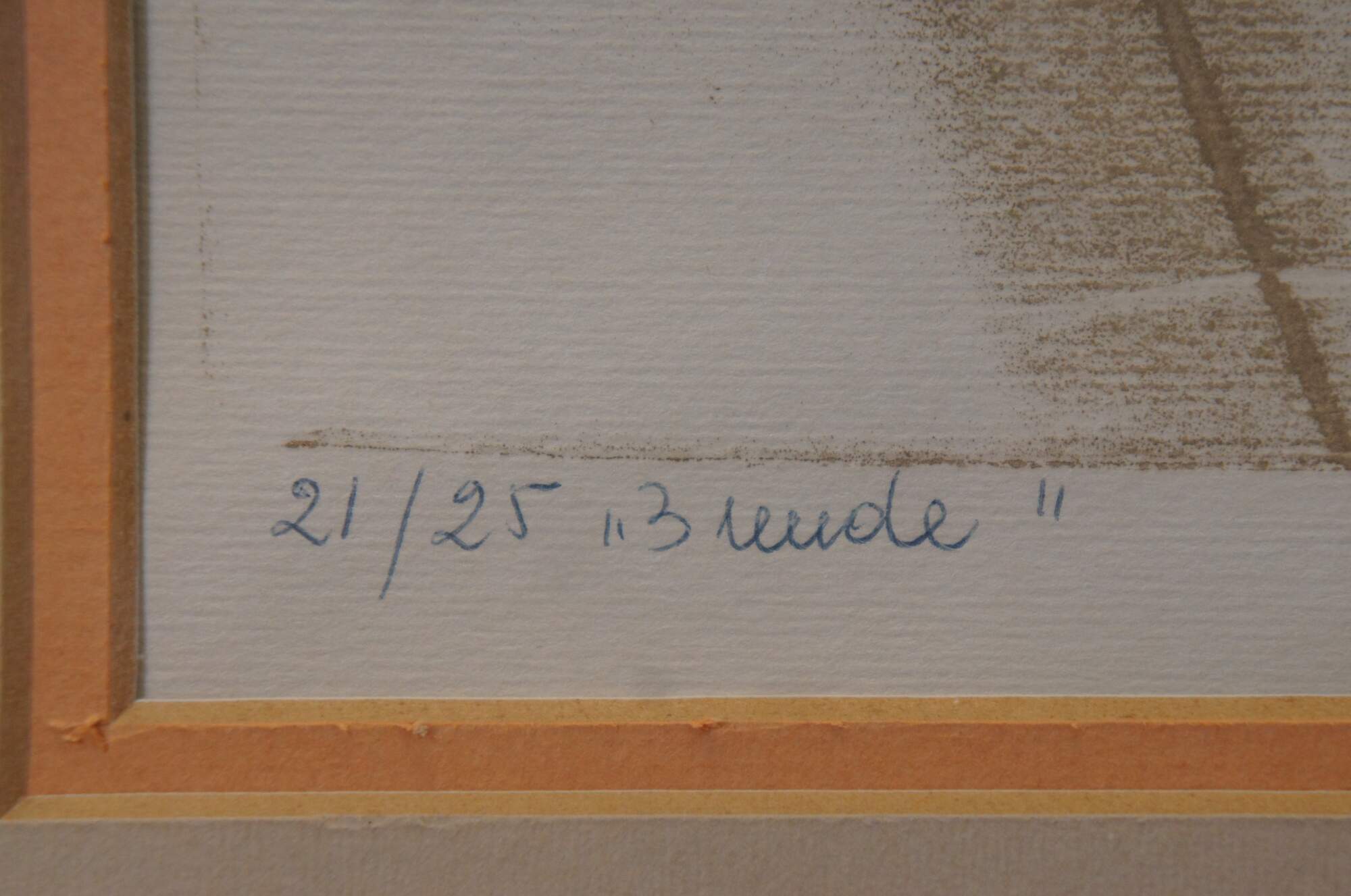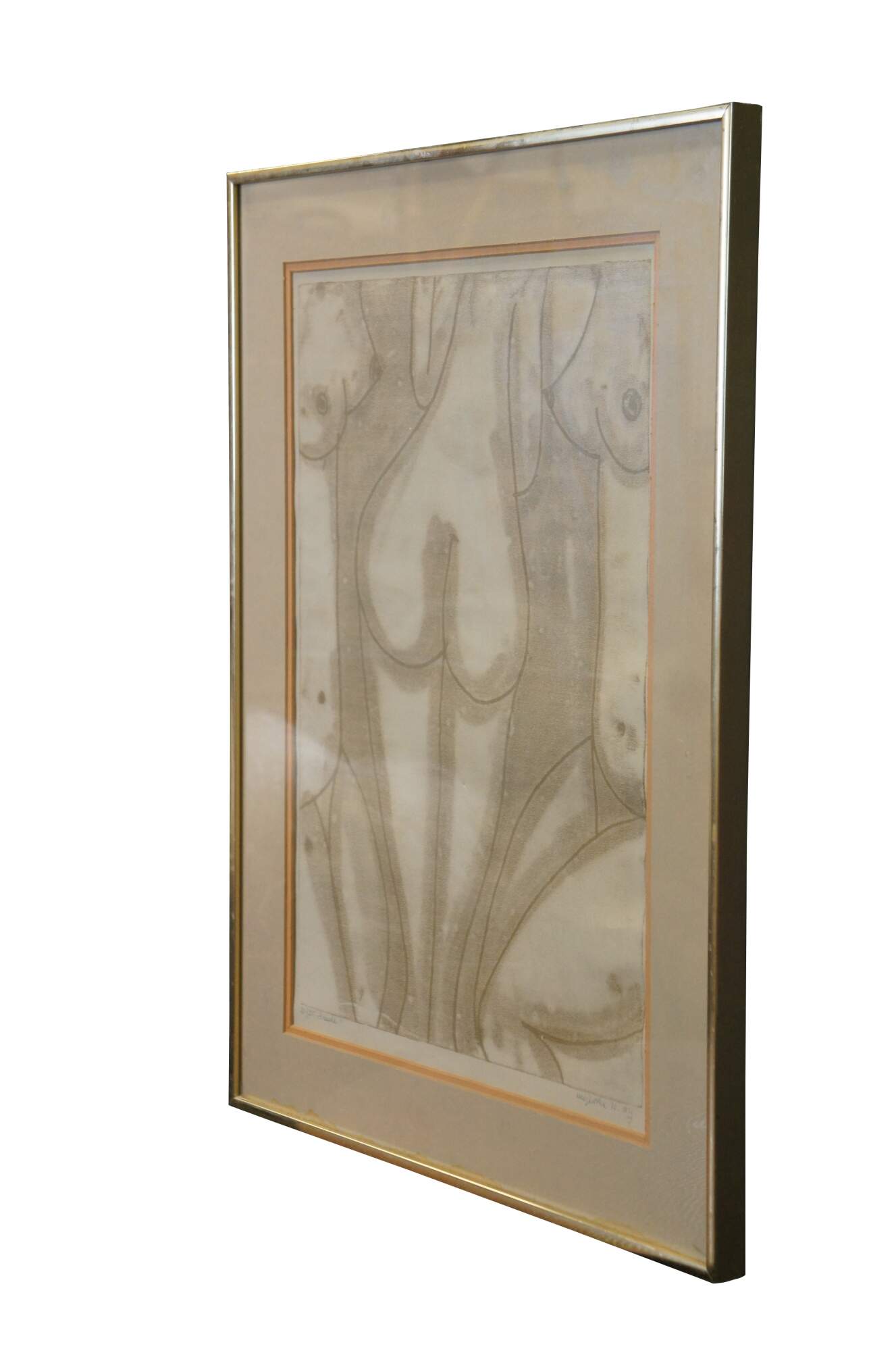 Mid to late 20th century lithograph print titled "3 Nude." Depicts a sepia toned tableau of three stylized nude female figures. Signed and numbered Wojewske. 70. NY, 21/25 in blue pen along lower edge. Gold tone metal frame; beige and salmon layered mat.