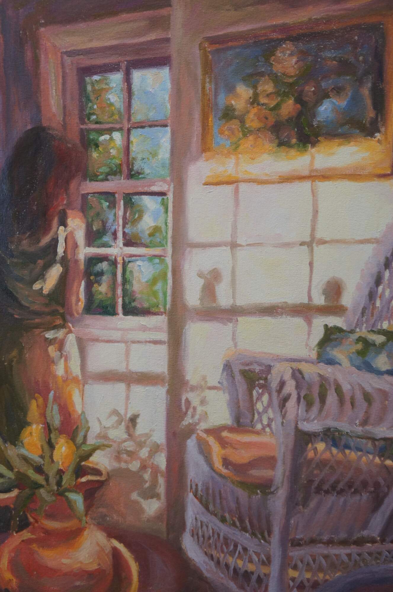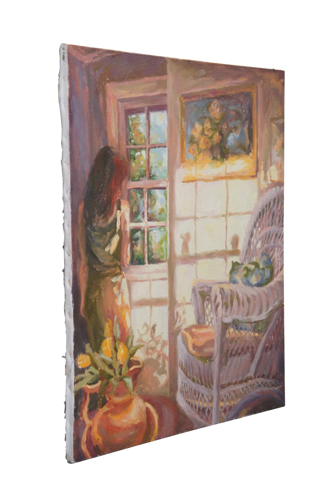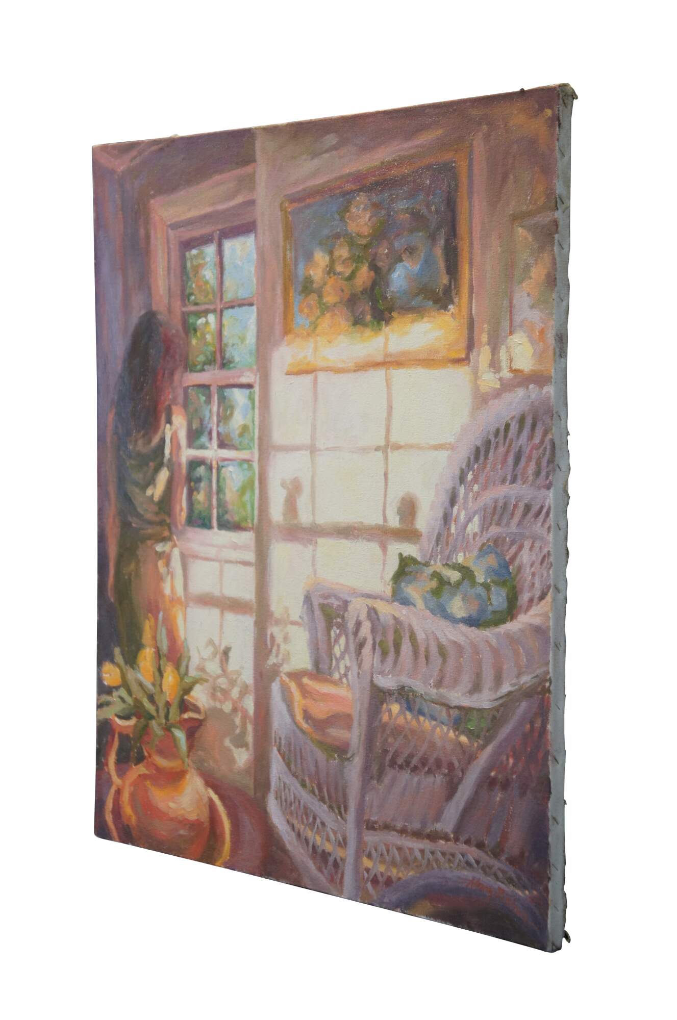 Mid to late 20th century Nancy Fisher oil on canvas painting depicting a woman standing and looking out a window in a room filled with slanting sunlight, a vase of lemons, and a white wicker chair.