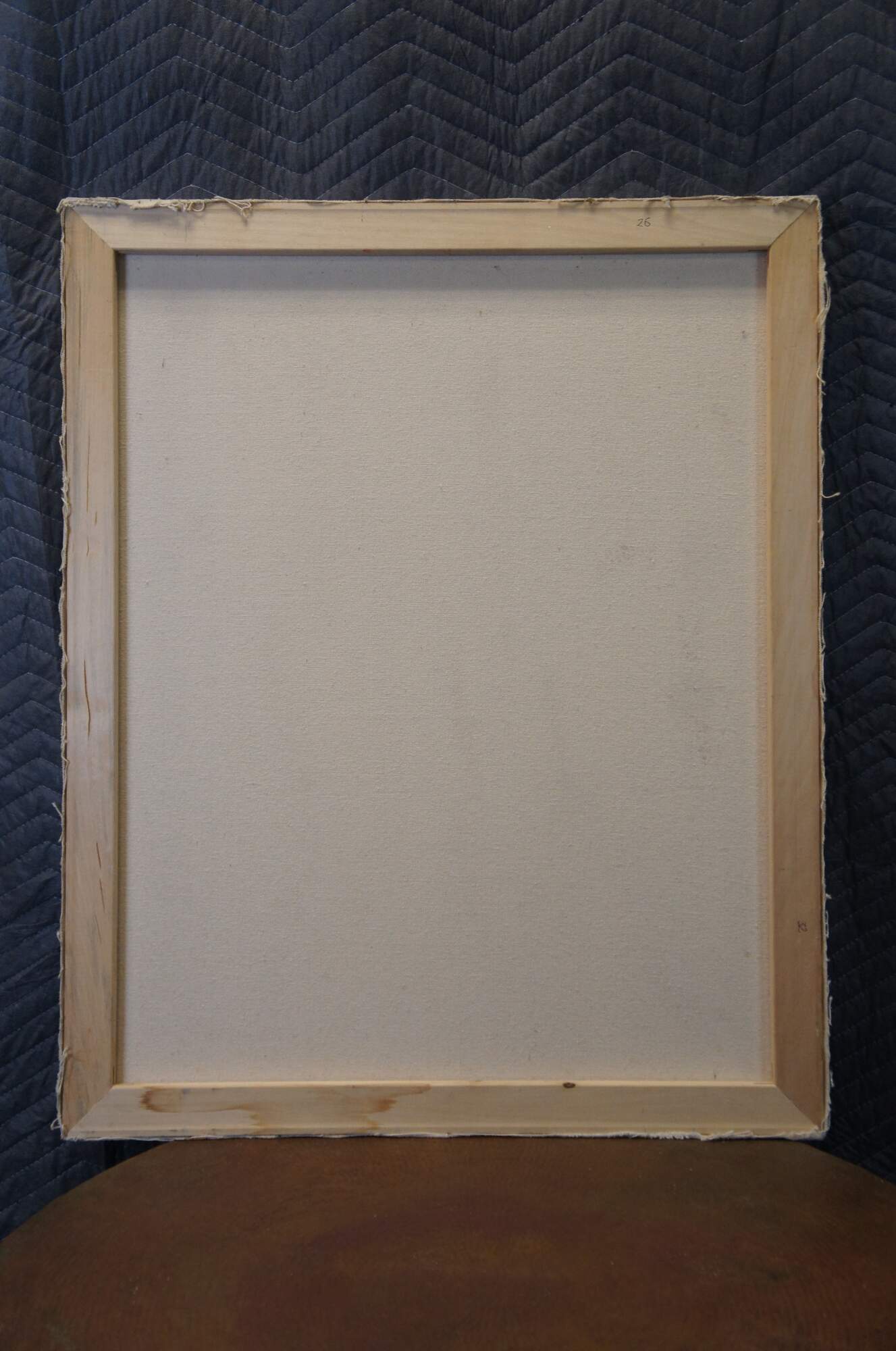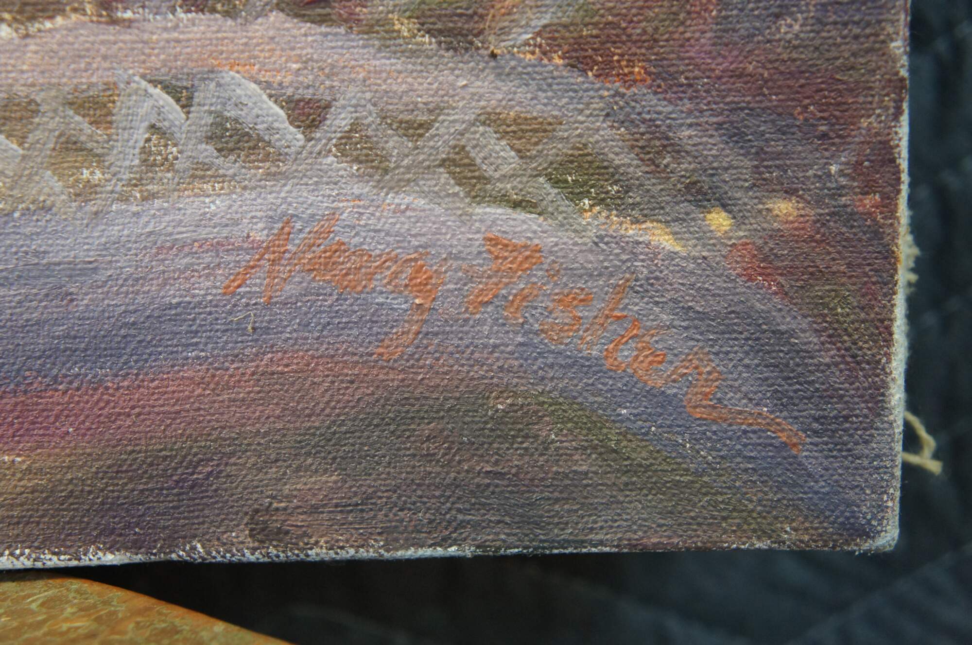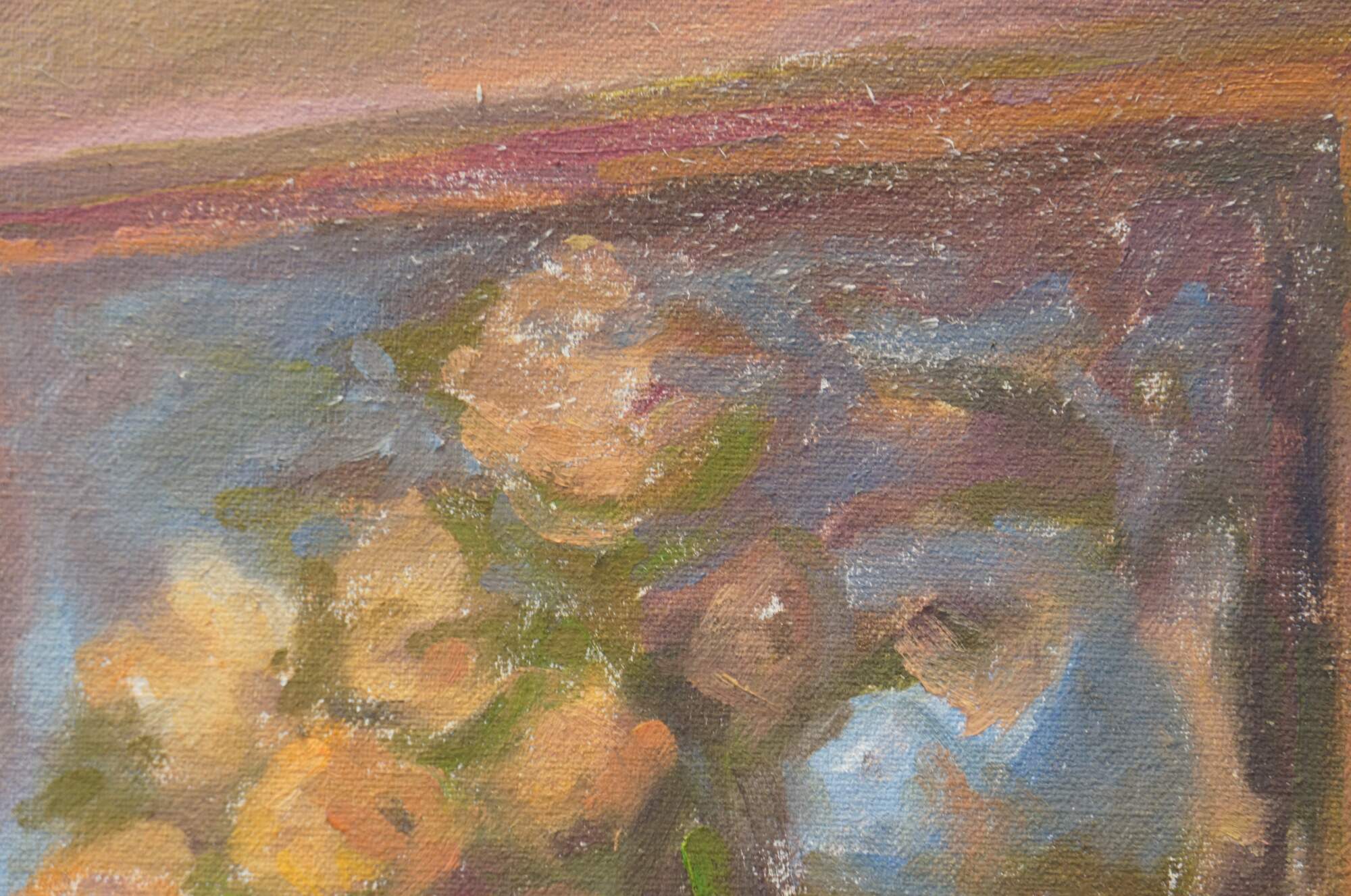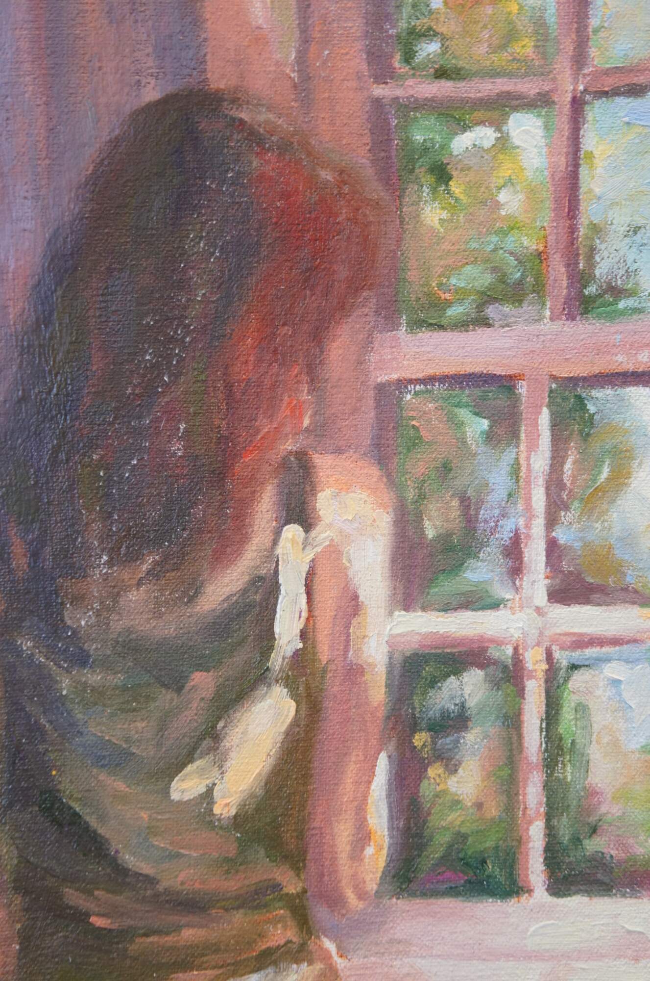 Mid to late 20th century Nancy Fisher oil on canvas painting depicting a woman standing and looking out a window in a room filled with slanting sunlight, a vase of lemons, and a white wicker chair.