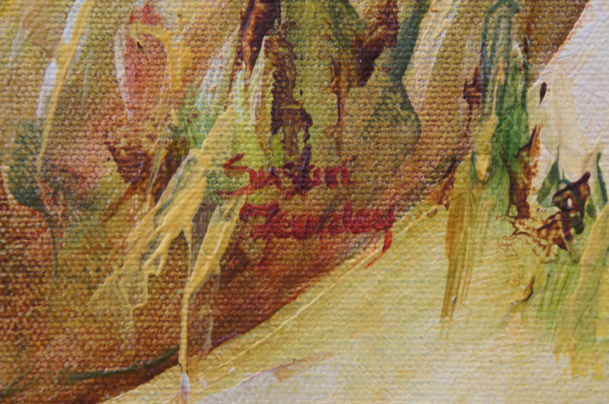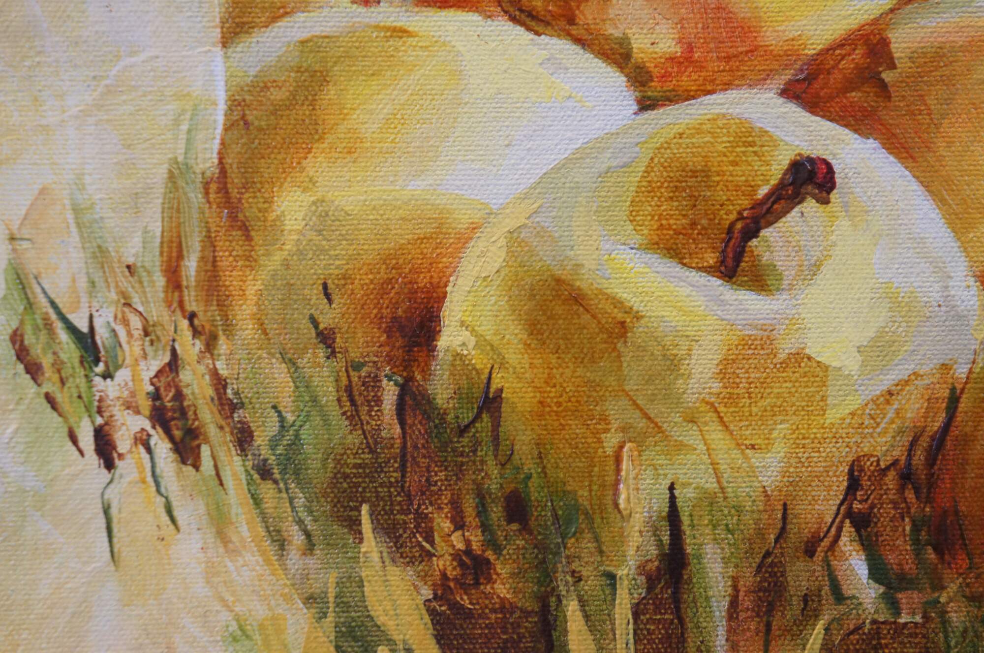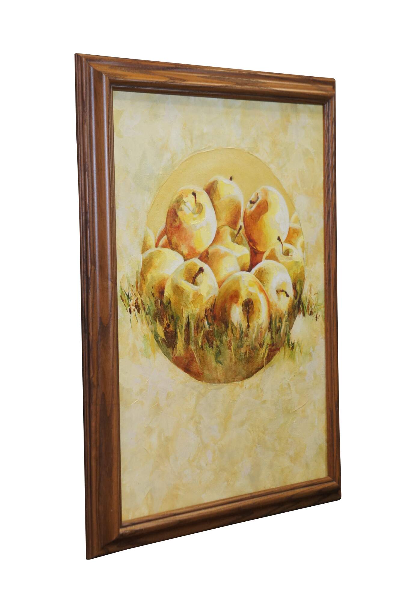 Late 20th century Susan Fearday oil on canvas still life painting depicting a circulure stack of golden apples on grass against the sunset. Signed at lower right. Wood frame with raised bevel.