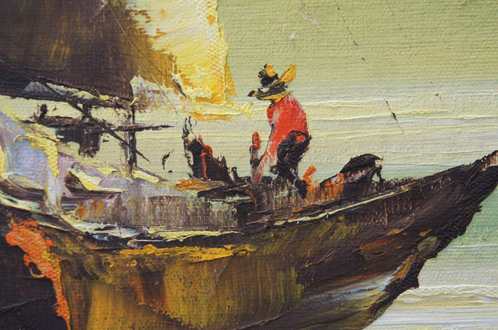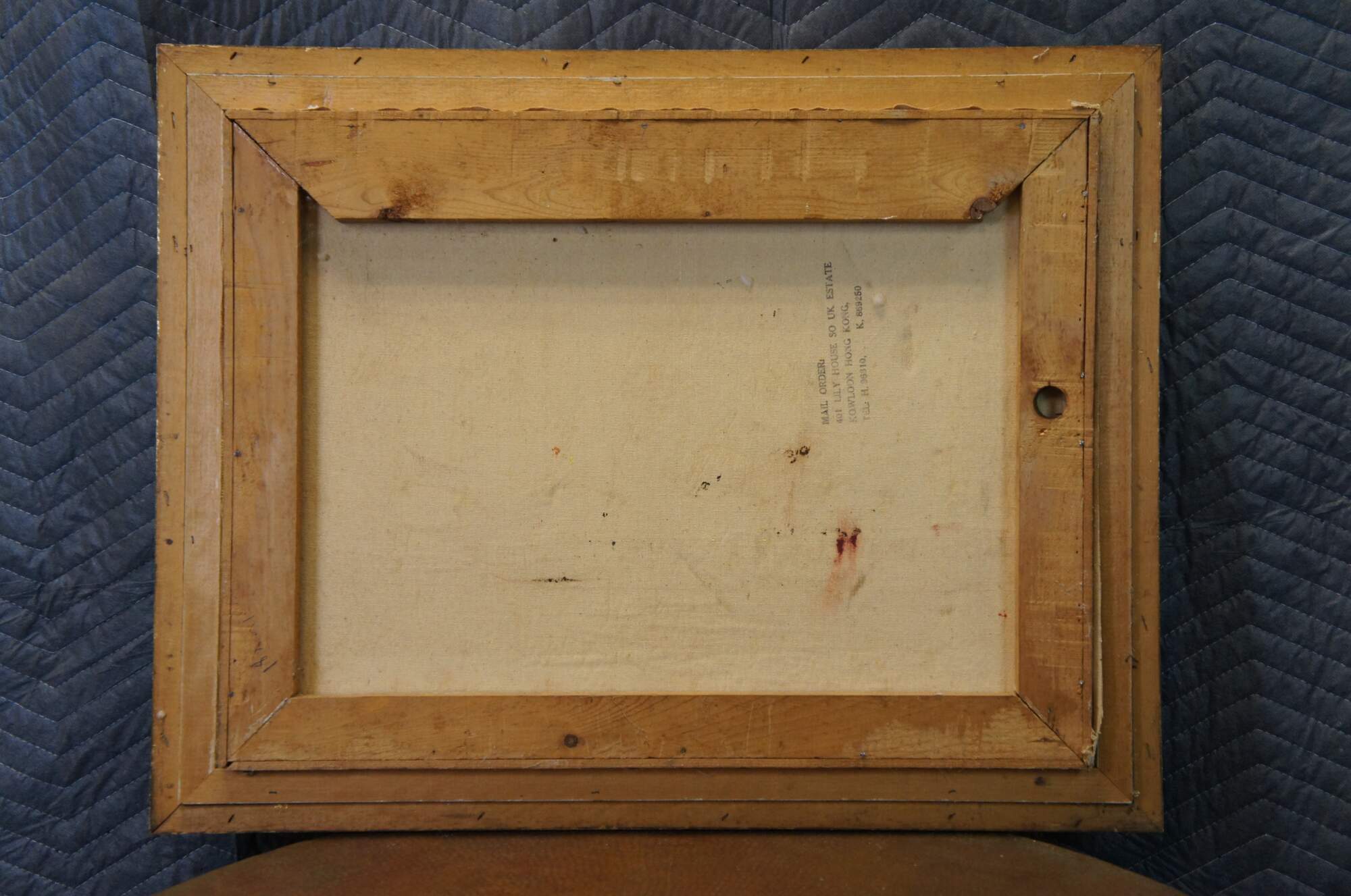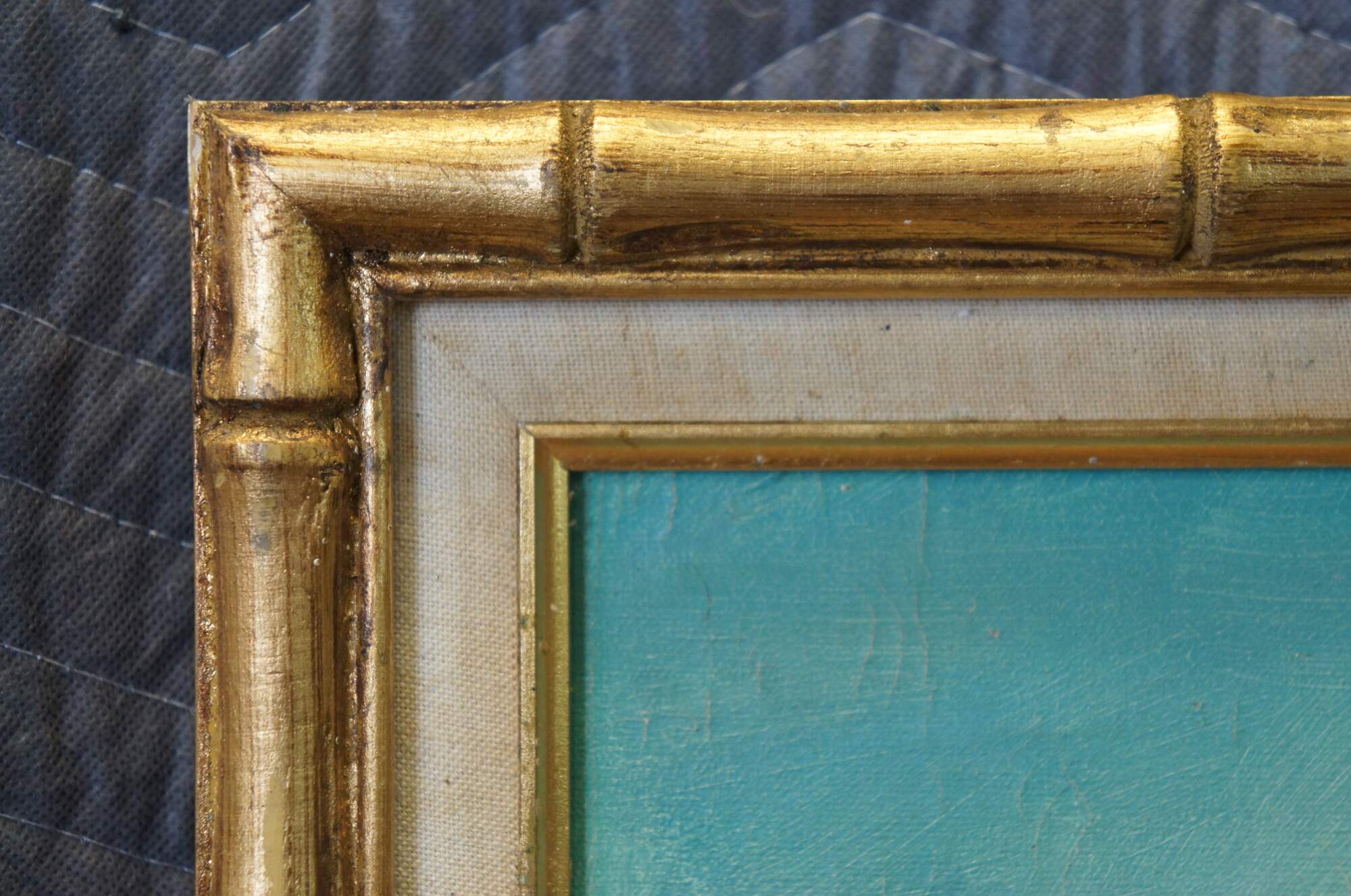 Circa mid 20th century Hong Kong maritime oil painting on canvas depicting a blue and gold seascape of chinese fishing boats and figures on calm water. Faux bamboo gilt wood frame with linen border / mat. Mail Order address stamp on back of canvas.