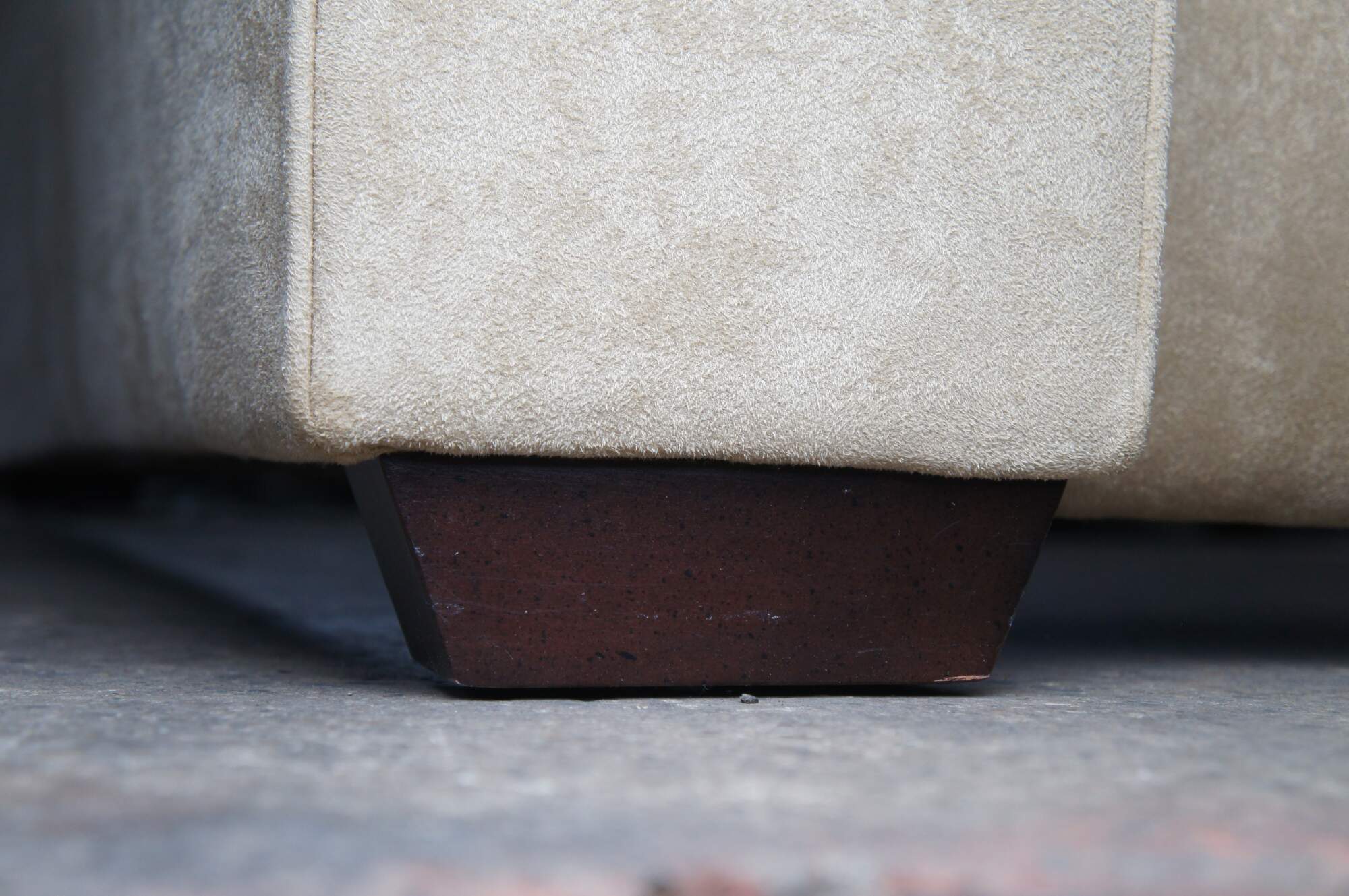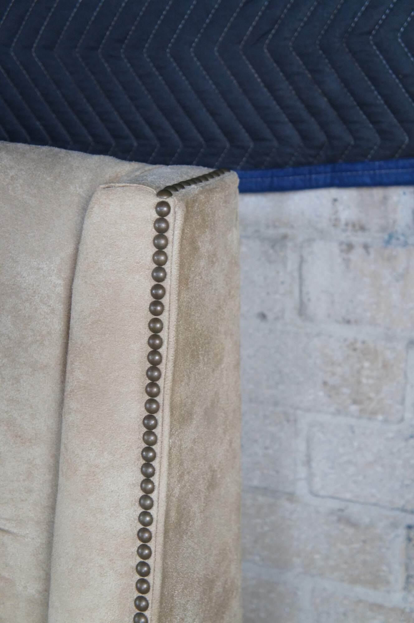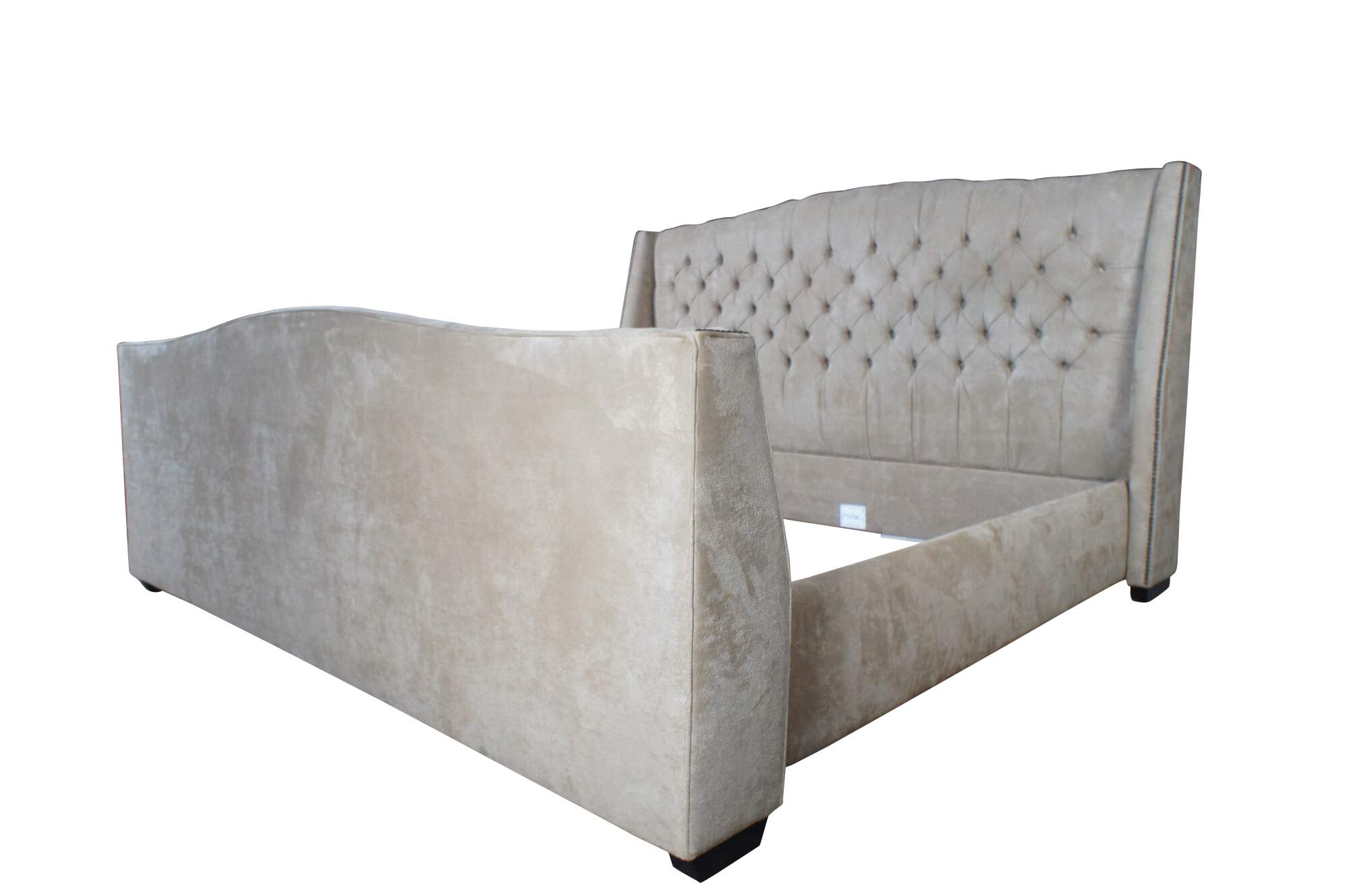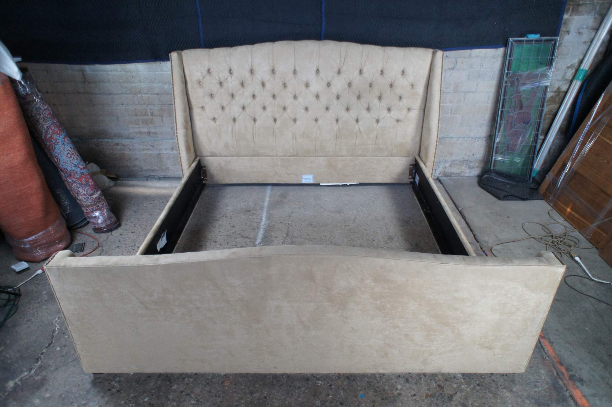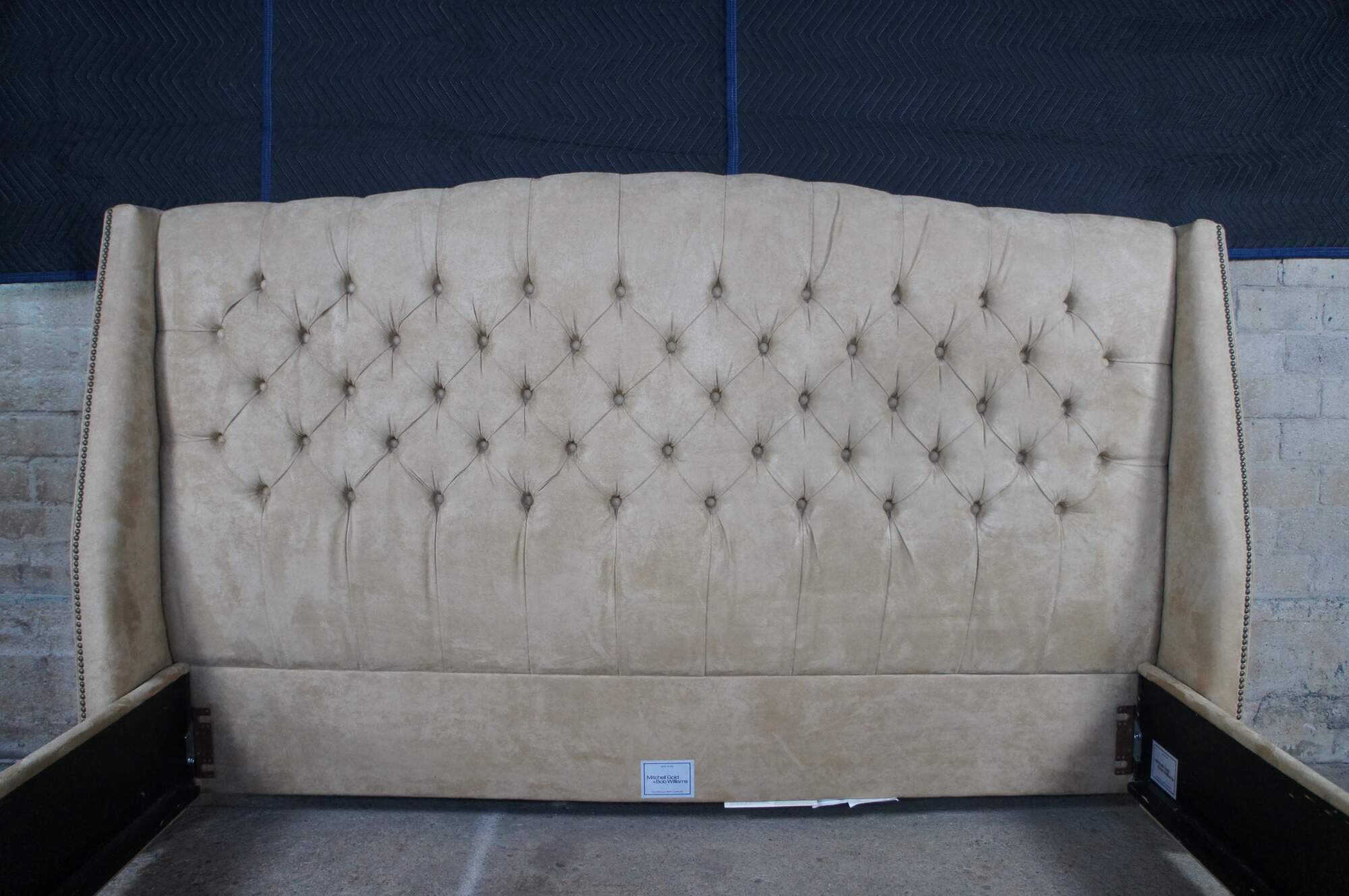 Vintage MG+BW tufted suede nailhead king size bed frame.