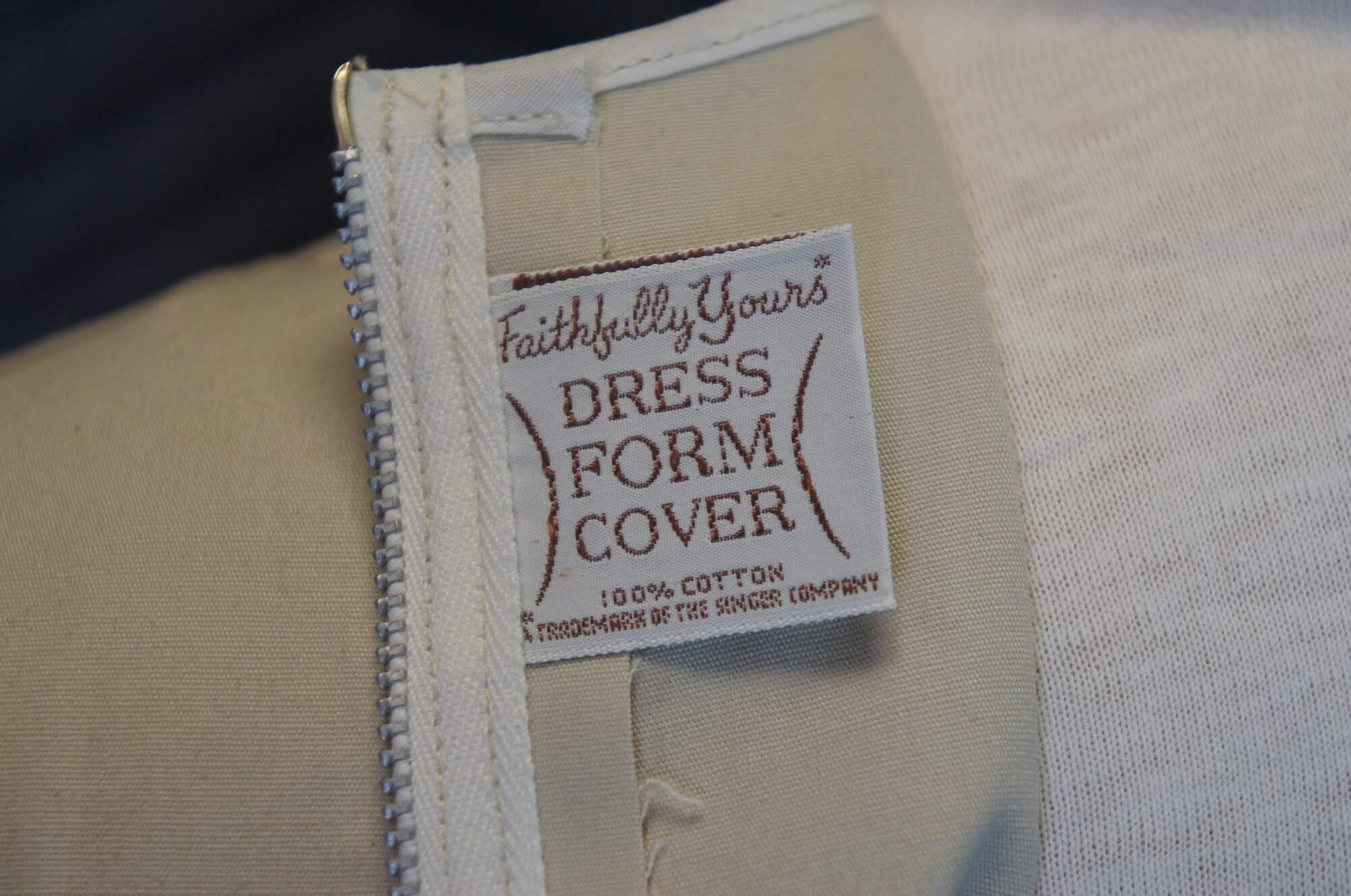 Mid 20th century foam dress form and Singer Fathfully Yours Dress Form Cover. Four leg cast metal base / stand; base marked 100. Soft foam construction with knit dickey over neck and shoulders. Faithfully Yours Dress Form Cover - 100% Cotton - A Trademark of the Singer Company - Bust 34 / Waist 26 / Hip 36 / Size 12 - zipper closure.