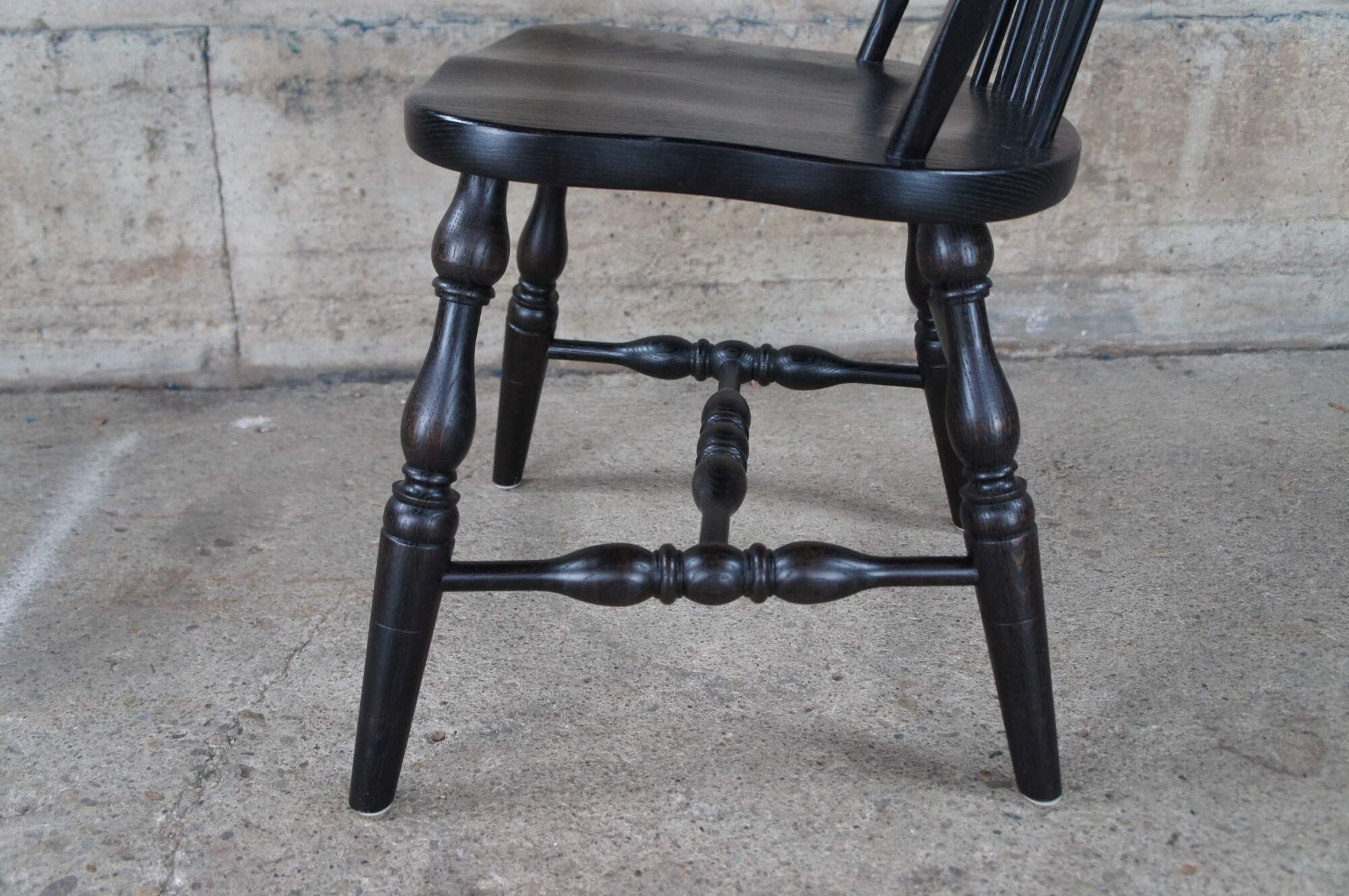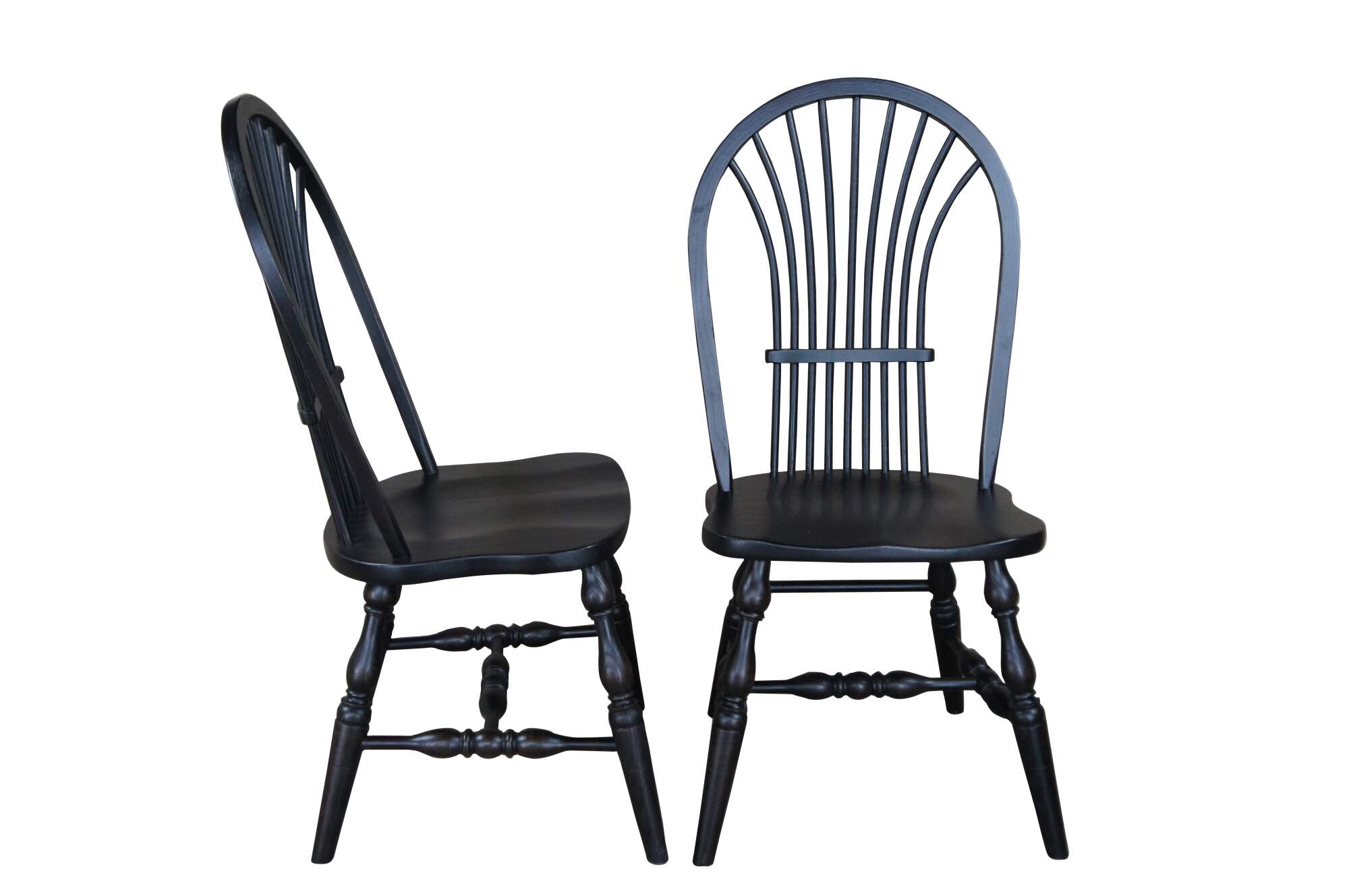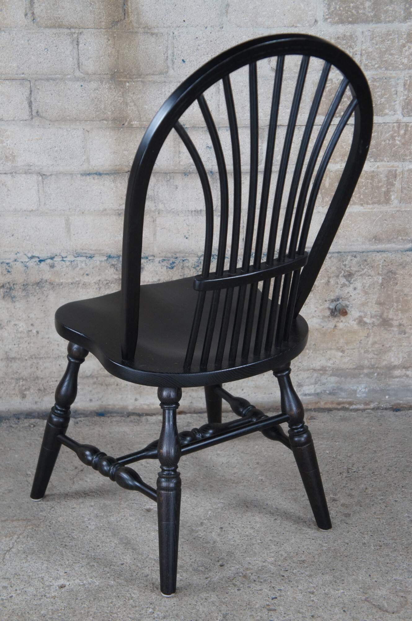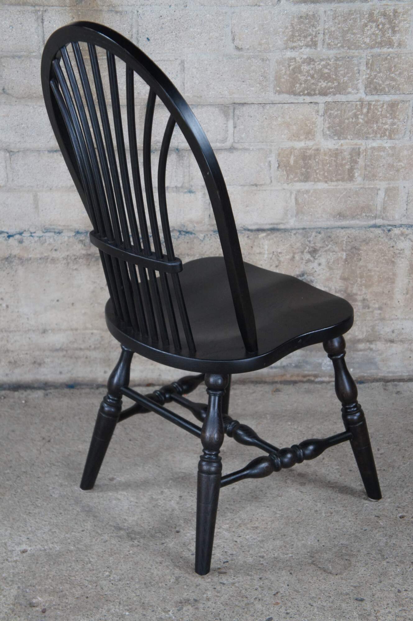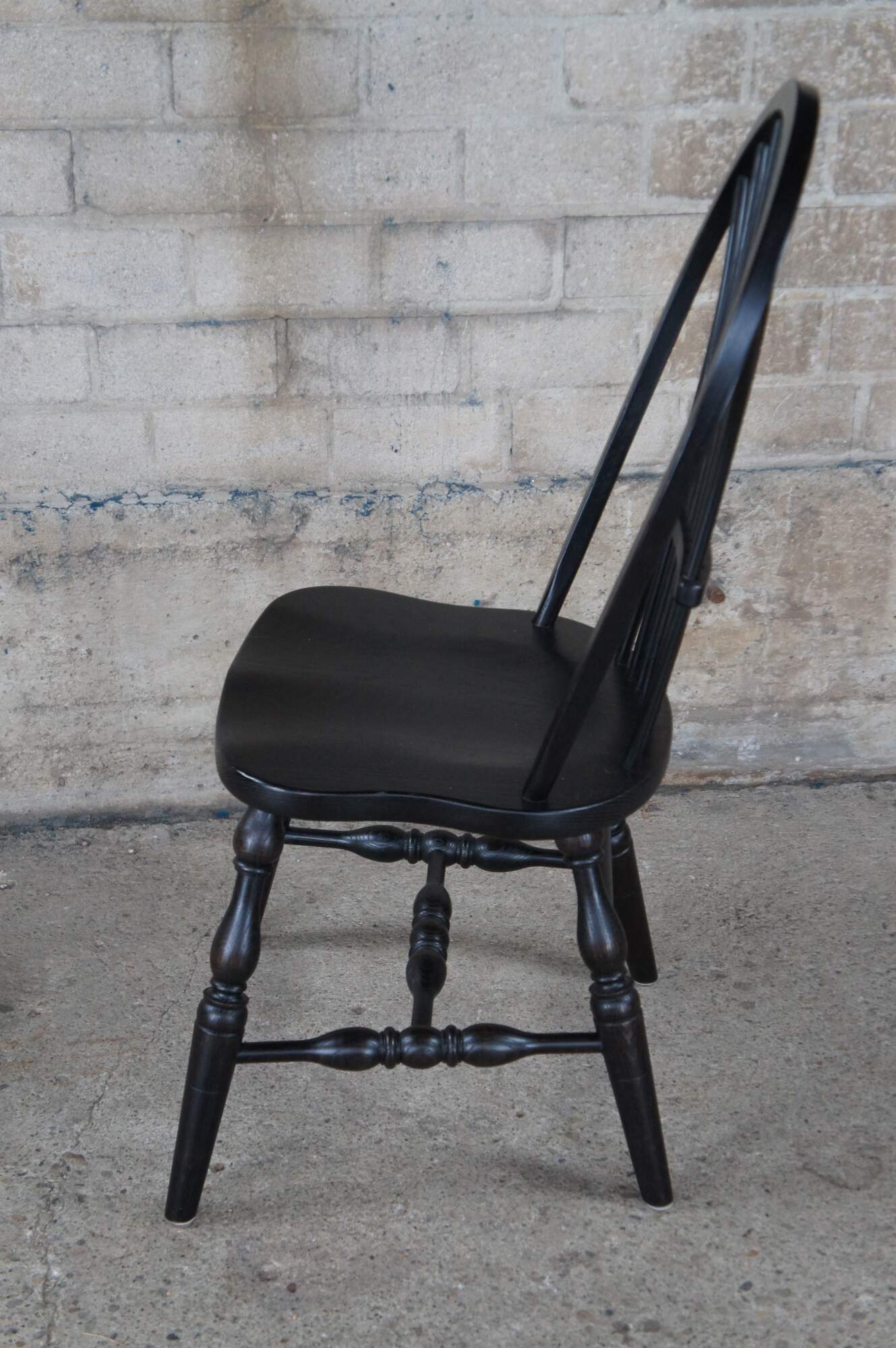 A set of six Windsor farmhouse dining chairs. Made of oak featuring black painted finish with a bentwood slatted sheaf back, turned legs and formed seat.