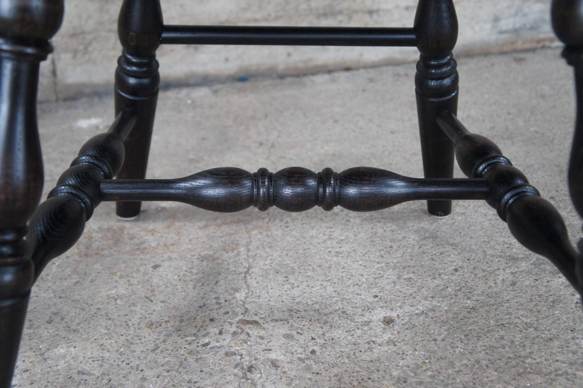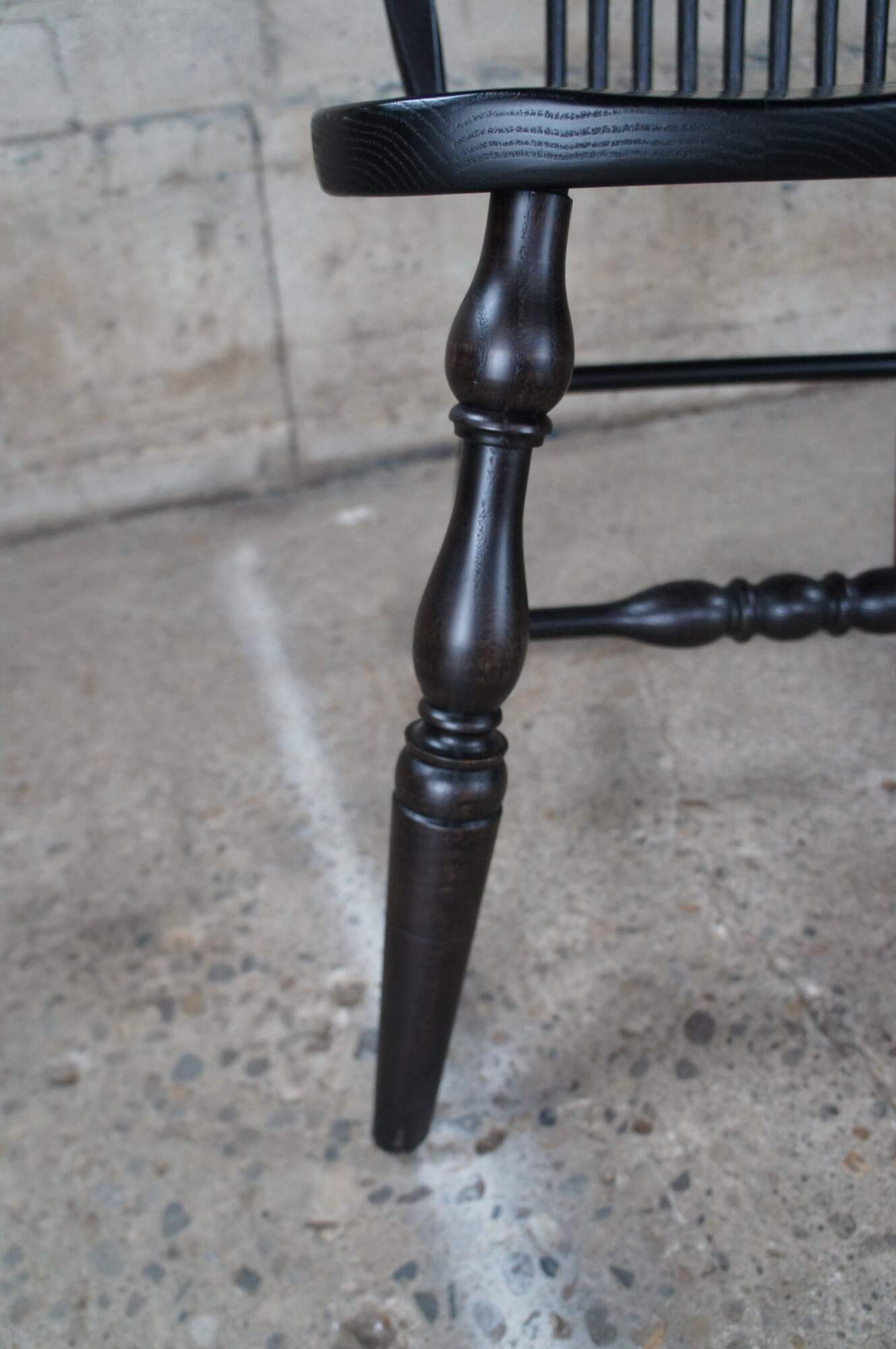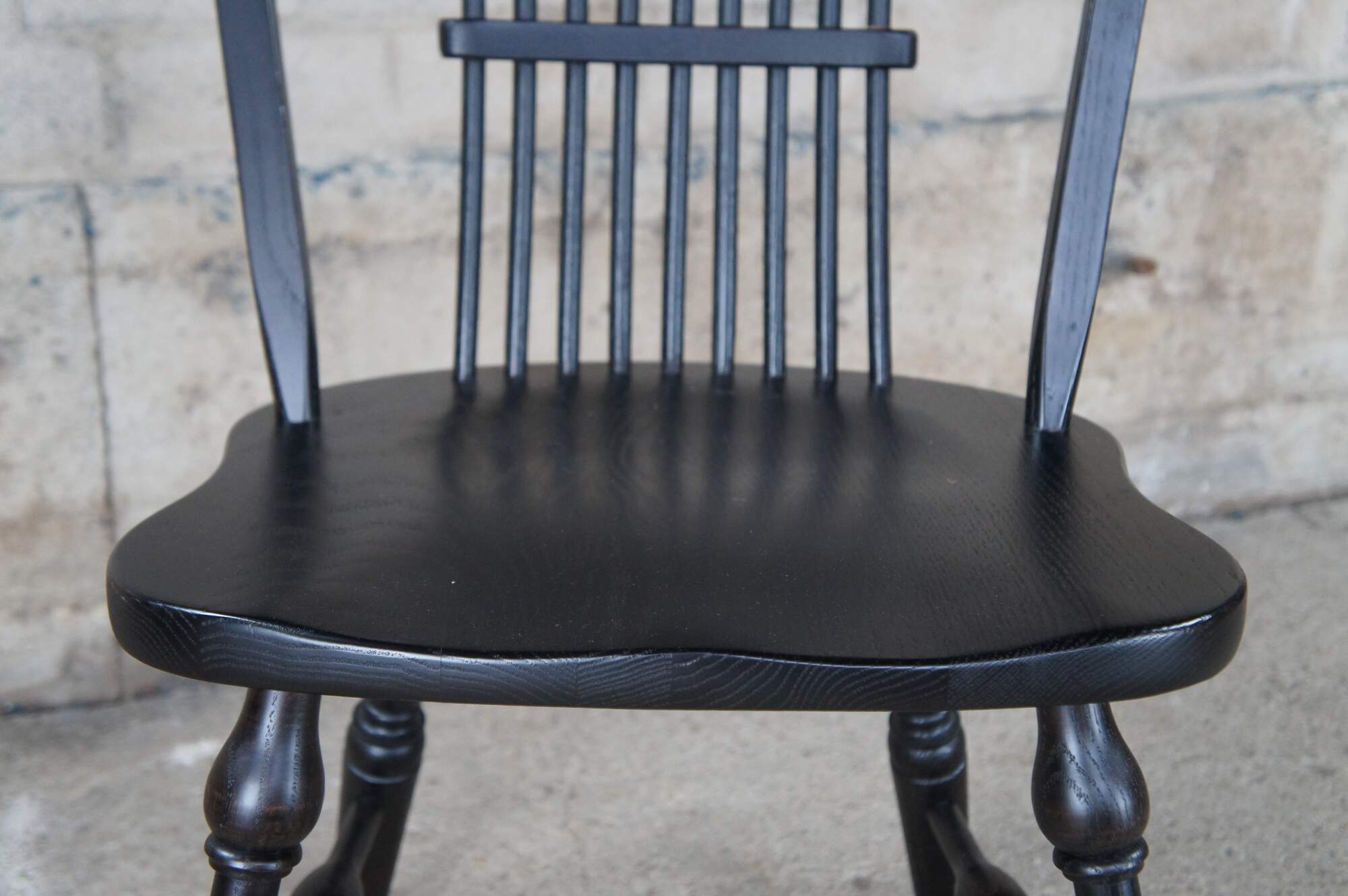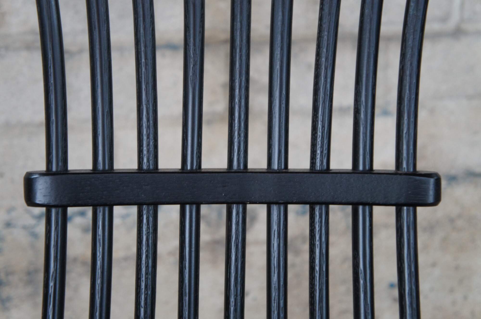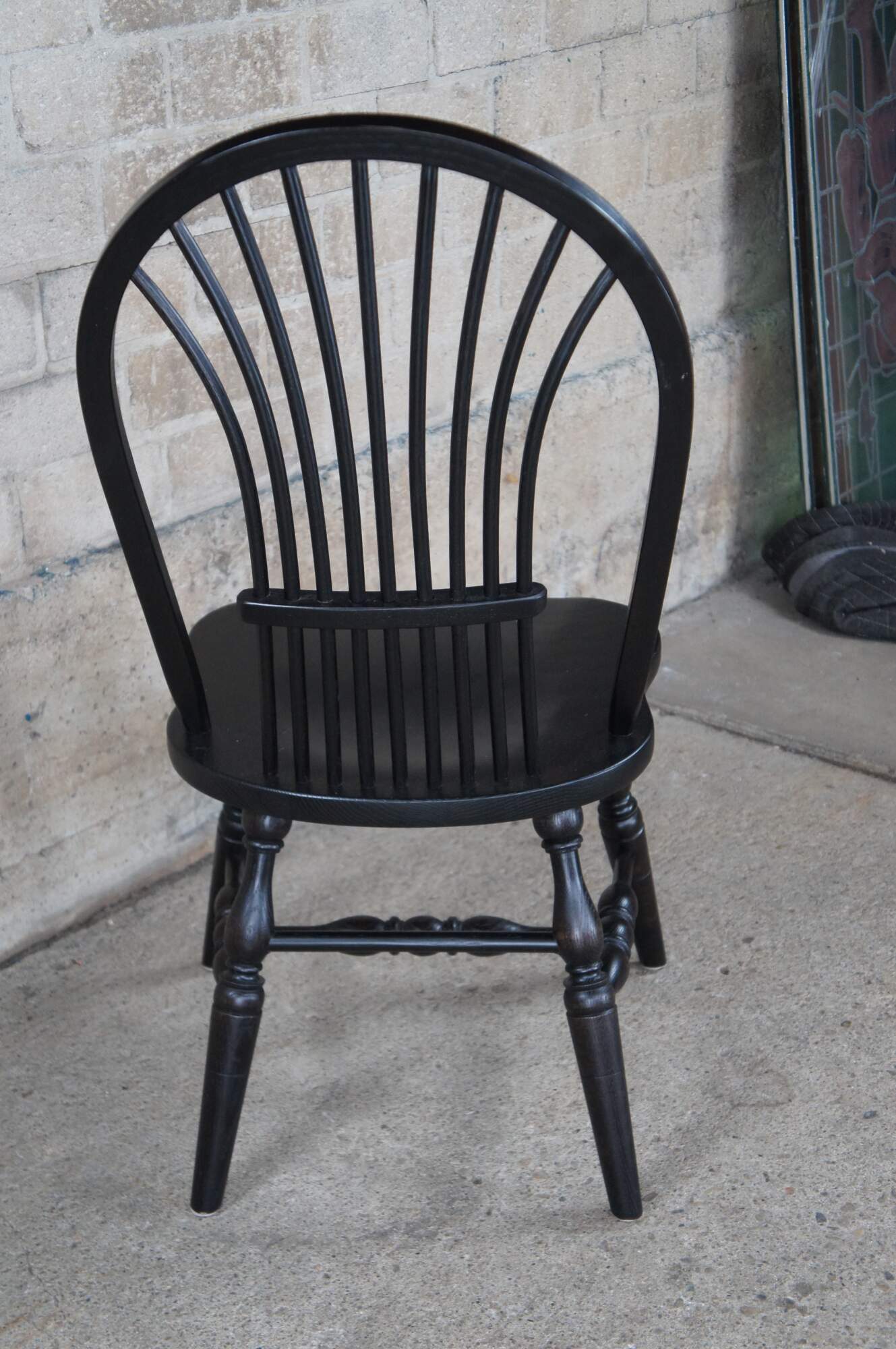 A set of six Windsor farmhouse dining chairs. Made of oak featuring black painted finish with a bentwood slatted sheaf back, turned legs and formed seat.