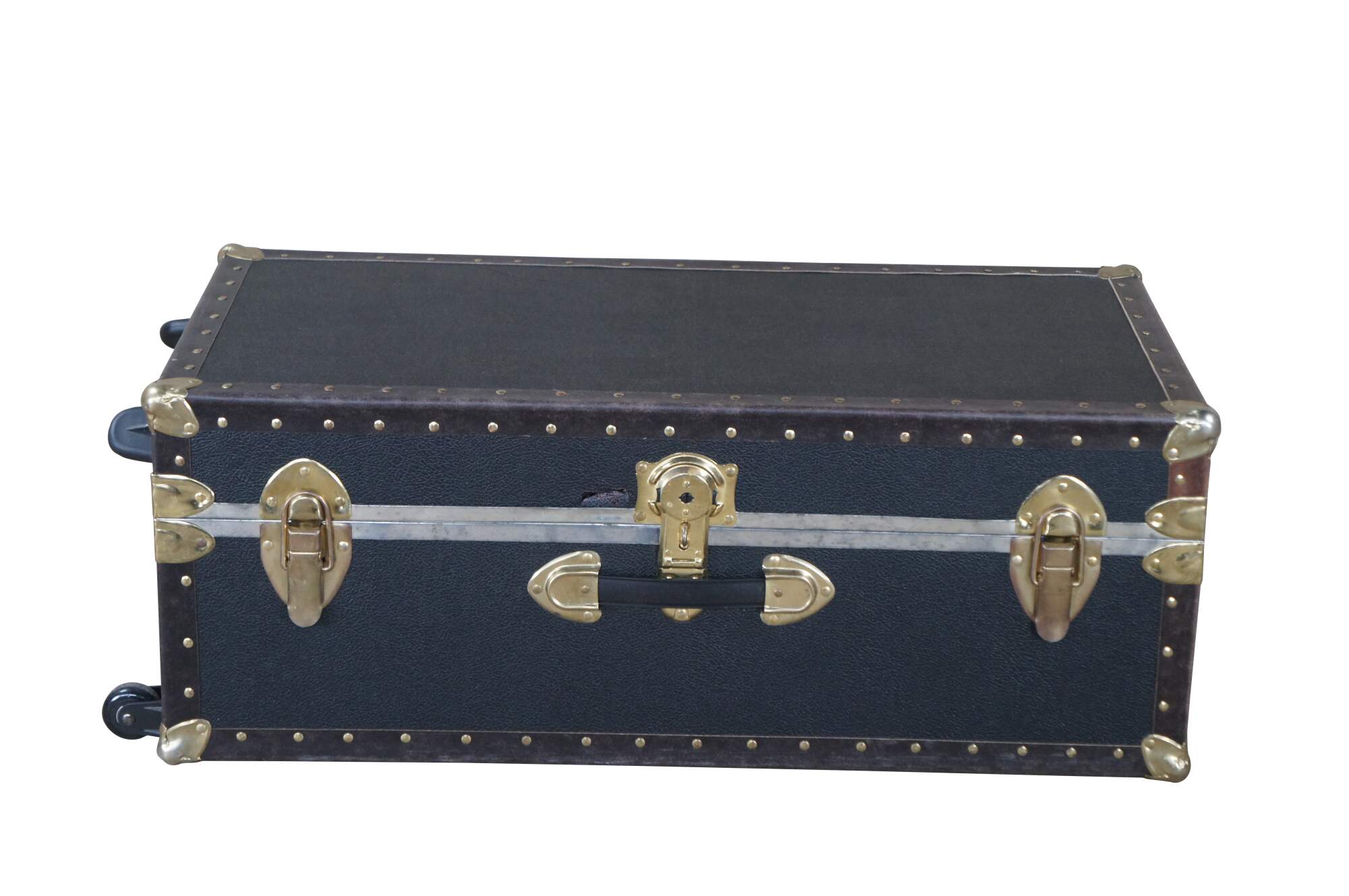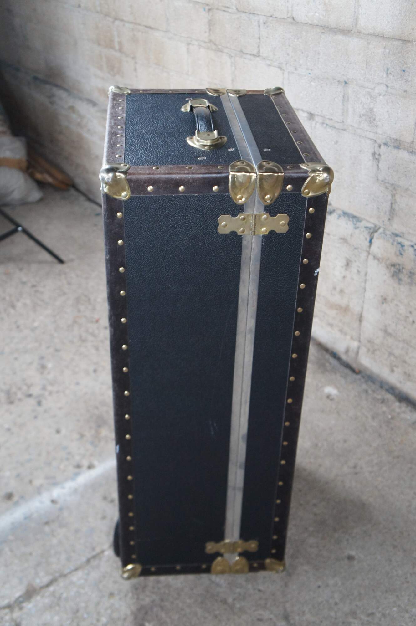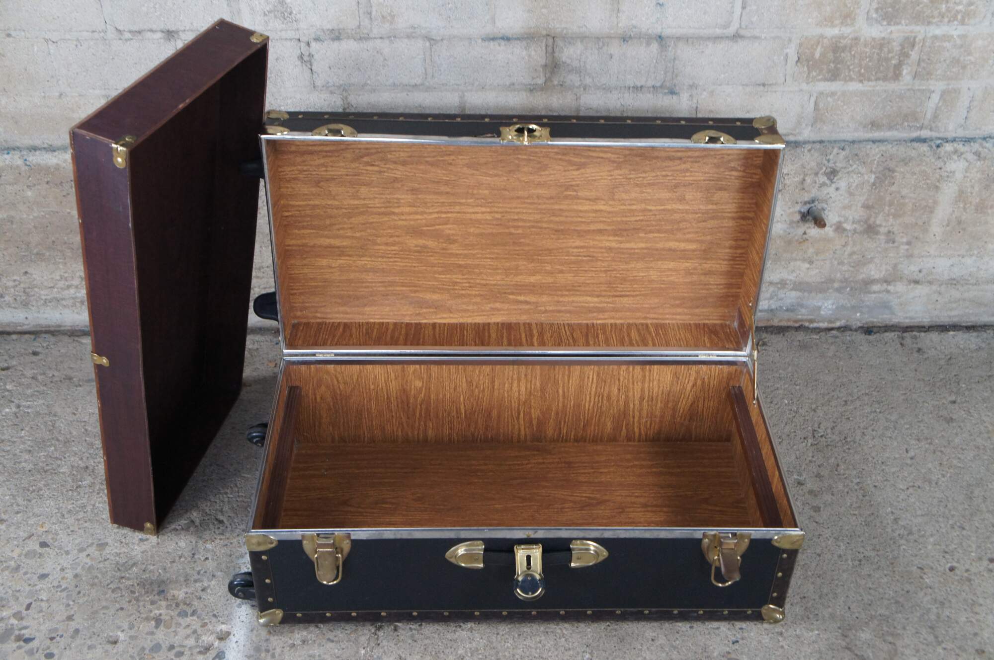 Vintage steamer trunk / wardrobe / footlocker featuring brass hardware, rolling wheels, nailhead trim and faux wood interior with insert.