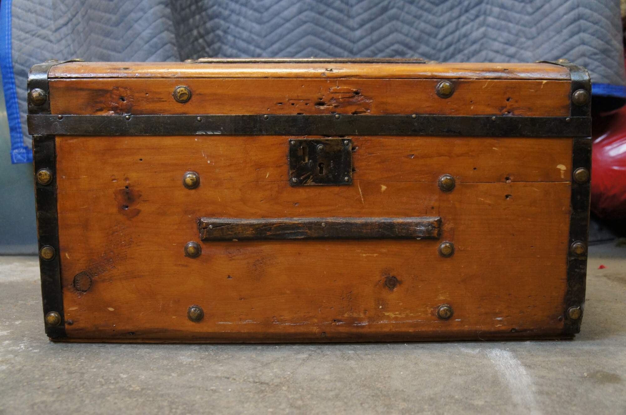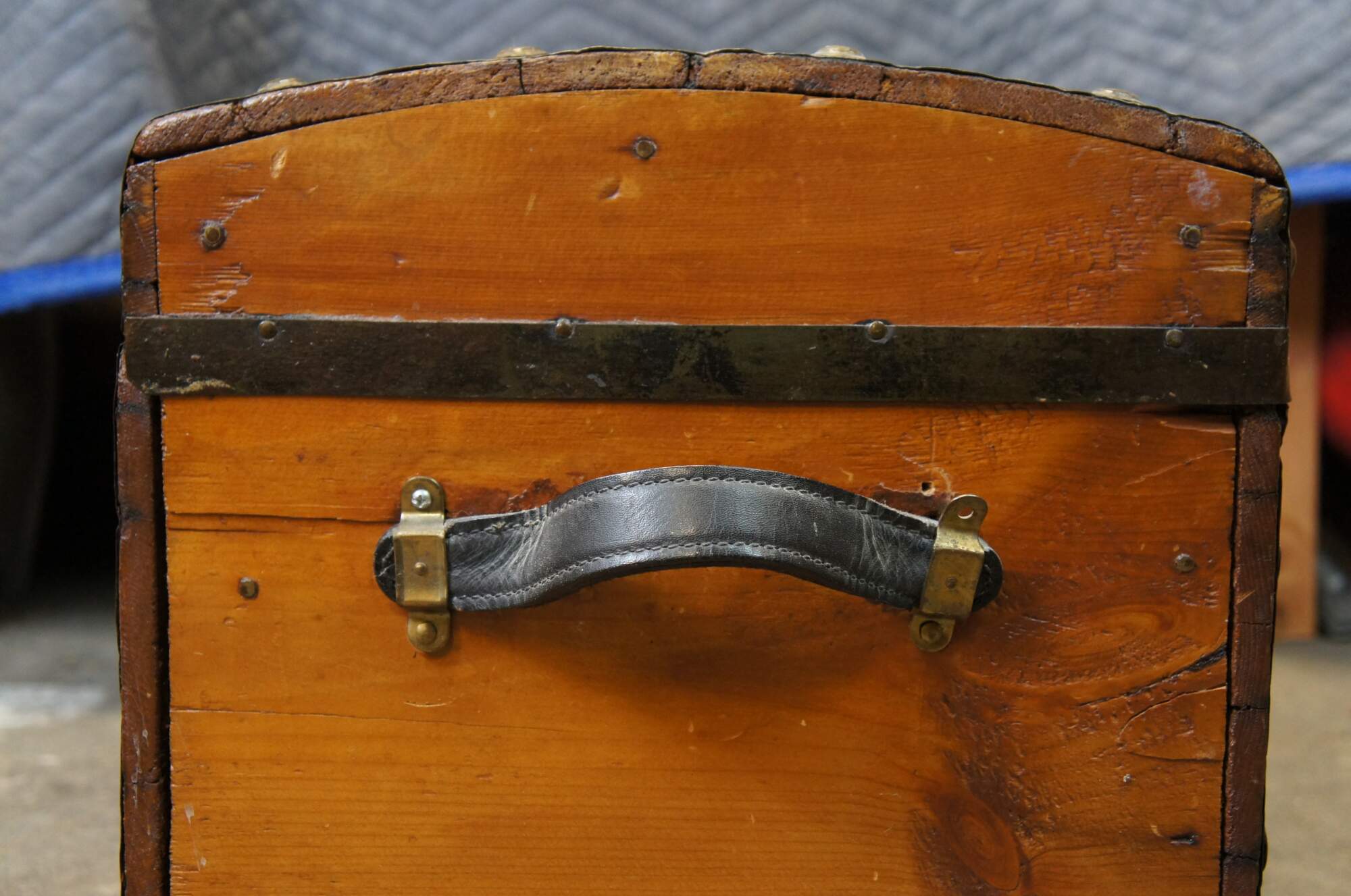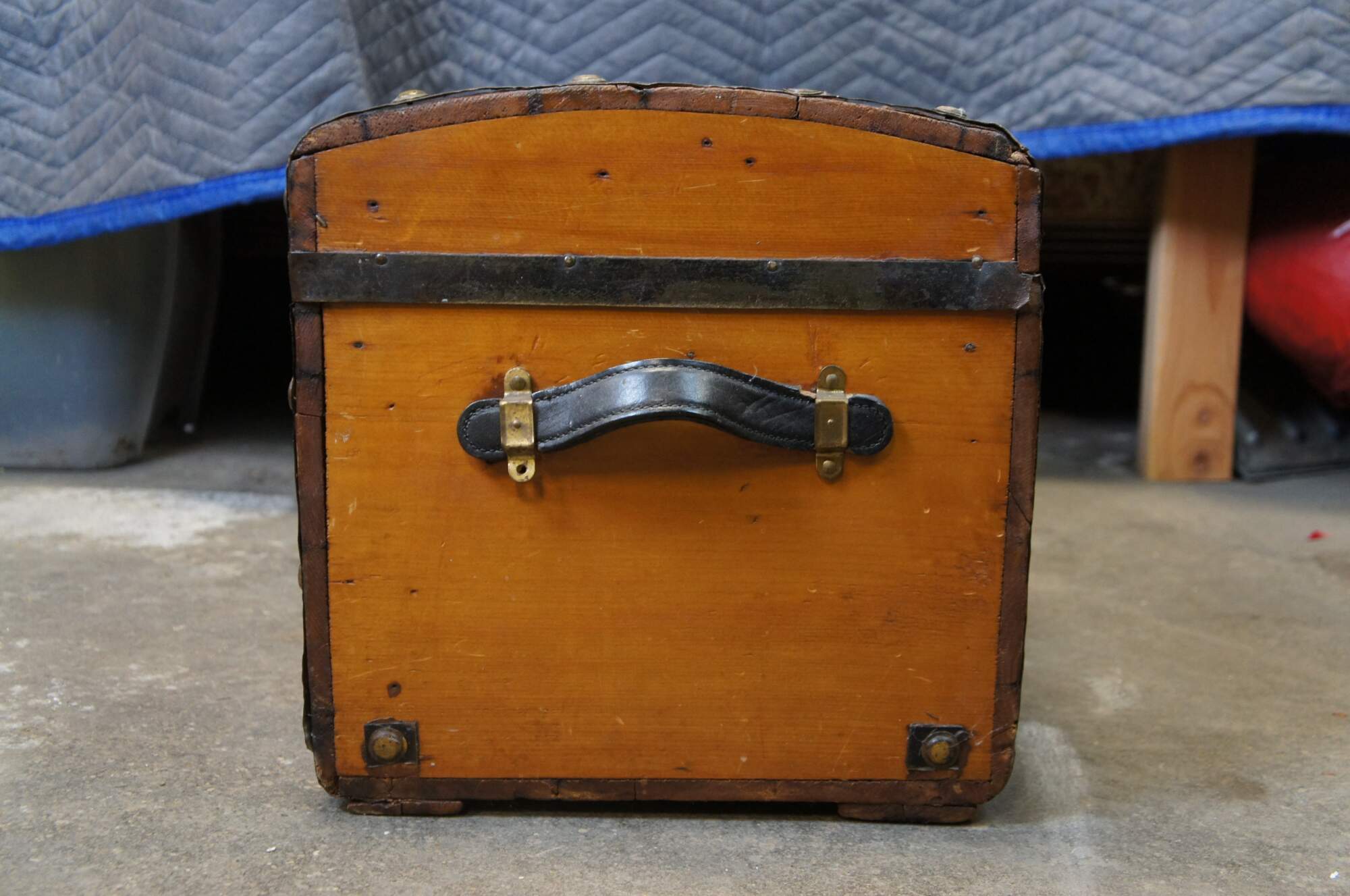 Antique chest / trunk / box, made of pine with lightly curved dome top, with iron banded edges and studded details. Two black leather handles at sides. Inteior re-papered at least twice (beige, red and blue pattern visible under portion of current red and white floral paper).