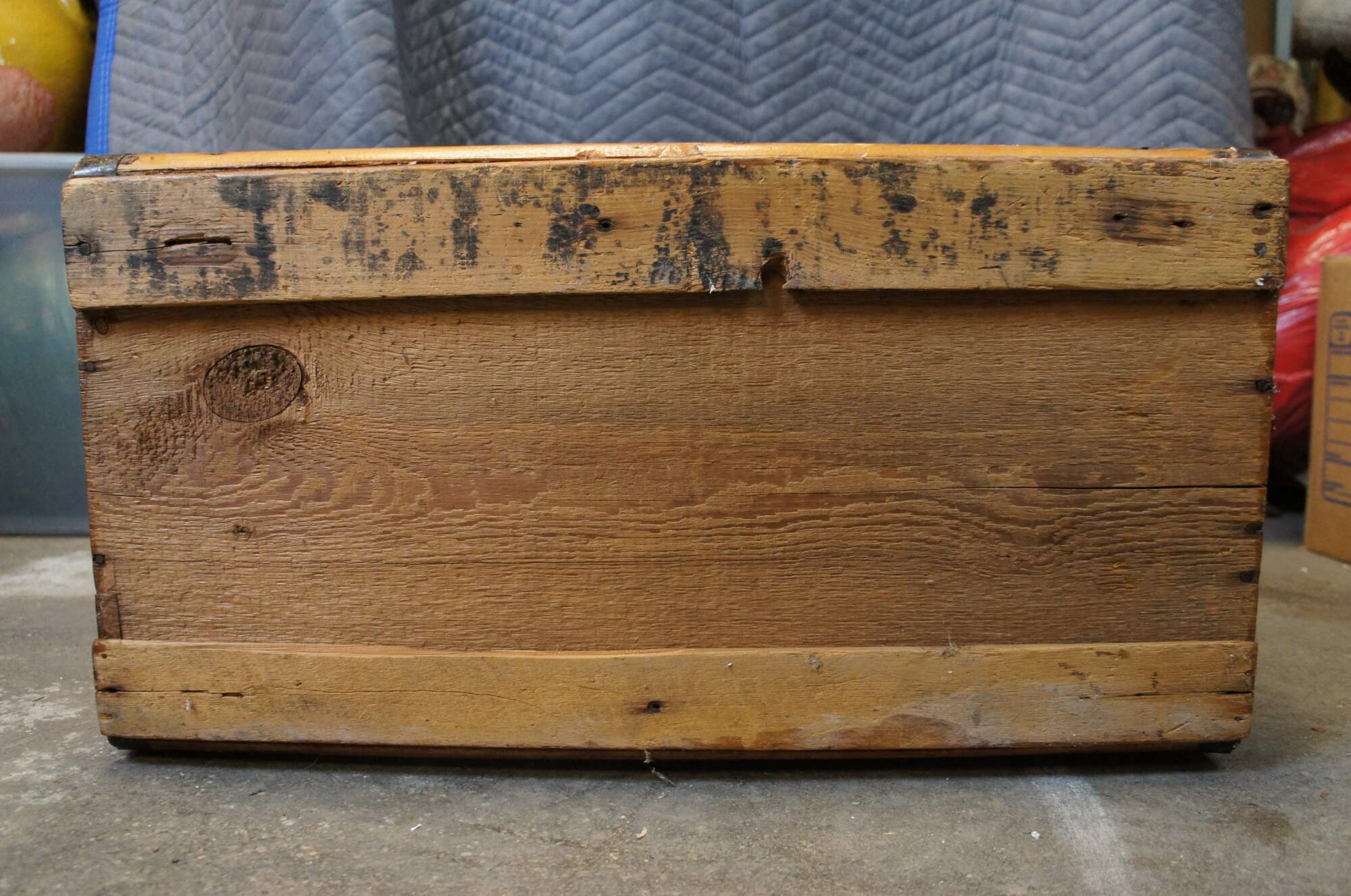 Fair Condition - Gentle wear; some stains/rusting; one side loose at corner edge; handles partly detached; missing interior tray; lock non functional, no key.